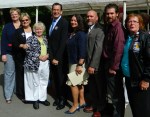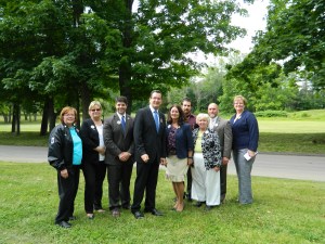 With the site for the Trees of Honor Memorial in the background are: left to right, Nancy Rousselle, Jean Risley, Middletown Mayor Dan Drew, Gov. Dannel Malloy, Sue Martucci, Matt McDonald, Ann Walsh, Tom Linden and Diane DeLuzio.