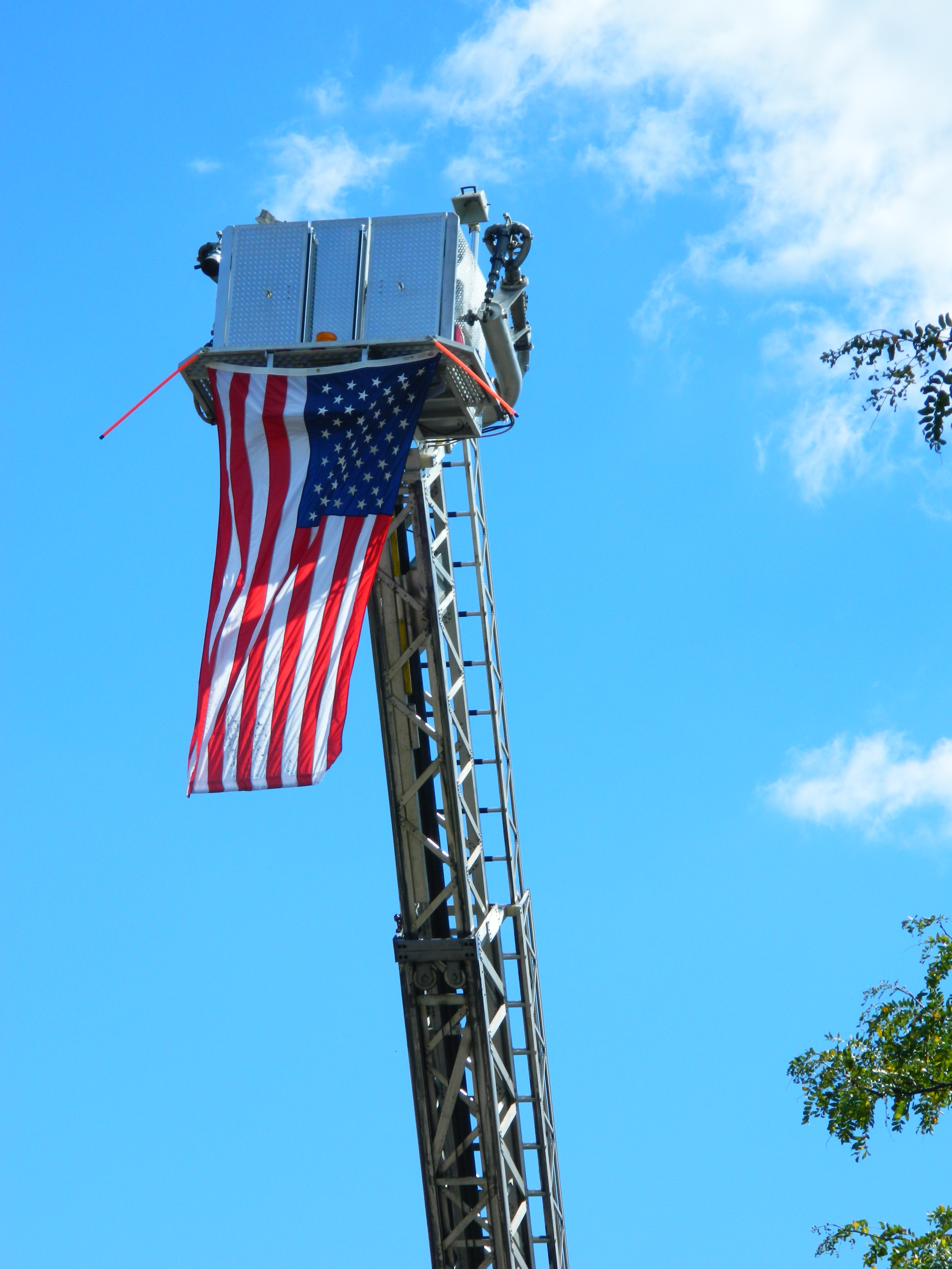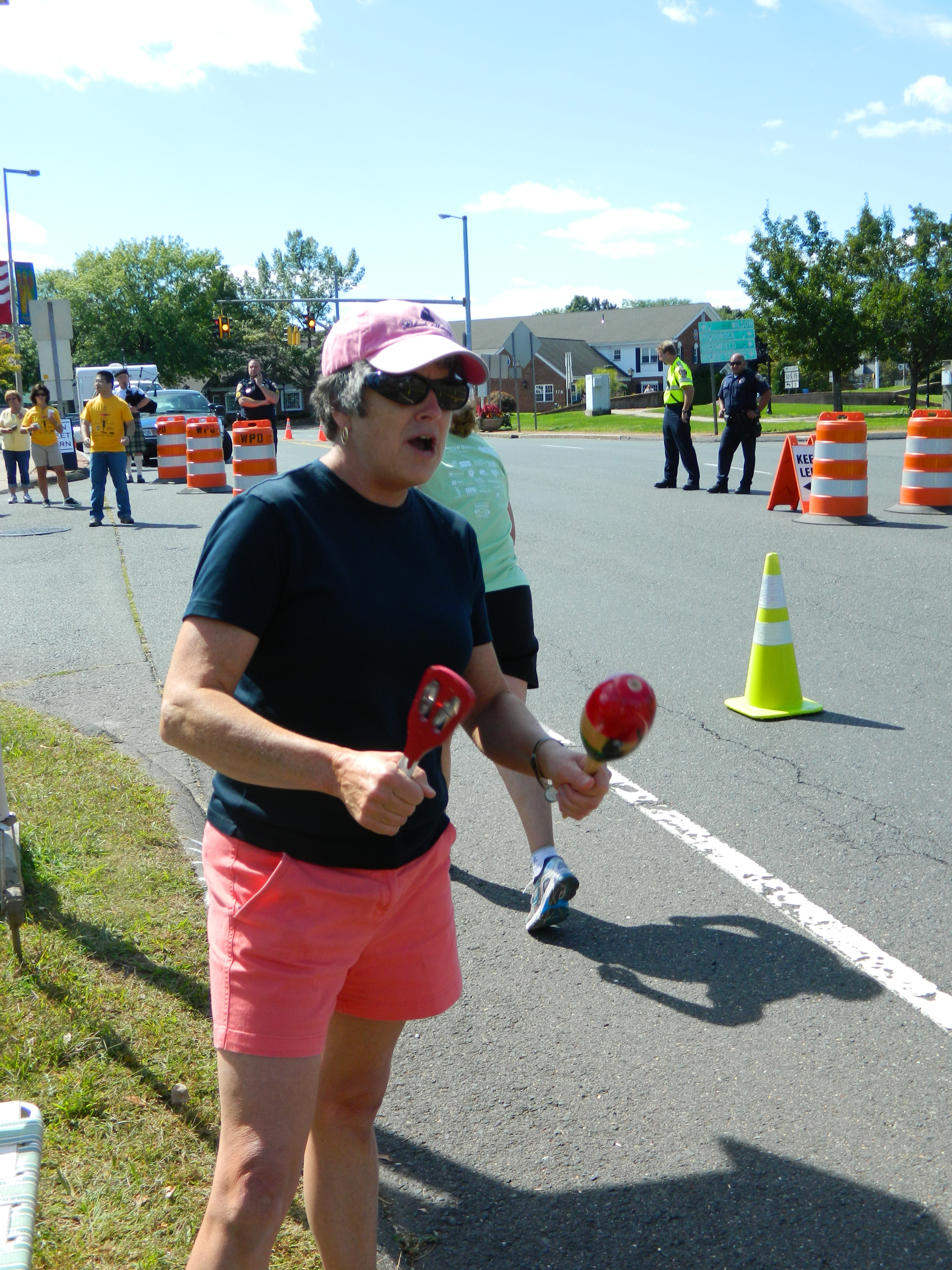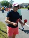 Among the other sights and sounds of the day were: Ashley Marsella who sang “The Star-Spangled Banner”; Joe D’Ambrosio – NBC Connecticut sports anchor and radio voice for University of Connecticut sports – serving as master of ceremonies; the Stars & Stripes flying high above the racers – courtesy of a Windsor Volunteer Fire Department ladder truck; a lovely quilt- hand crafted by teachers Kathy Wakefield and Diane Mullins from Roger Wolcott school- that was raffled off to benefit ALSF; a bagpiper who played on one corner of Union Street where runners approached the last stretch of the race, and, Margaret Korhonen of East Granby who also positioned herself on the oppositie corner, shaking maracas to cheer on the runners.