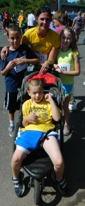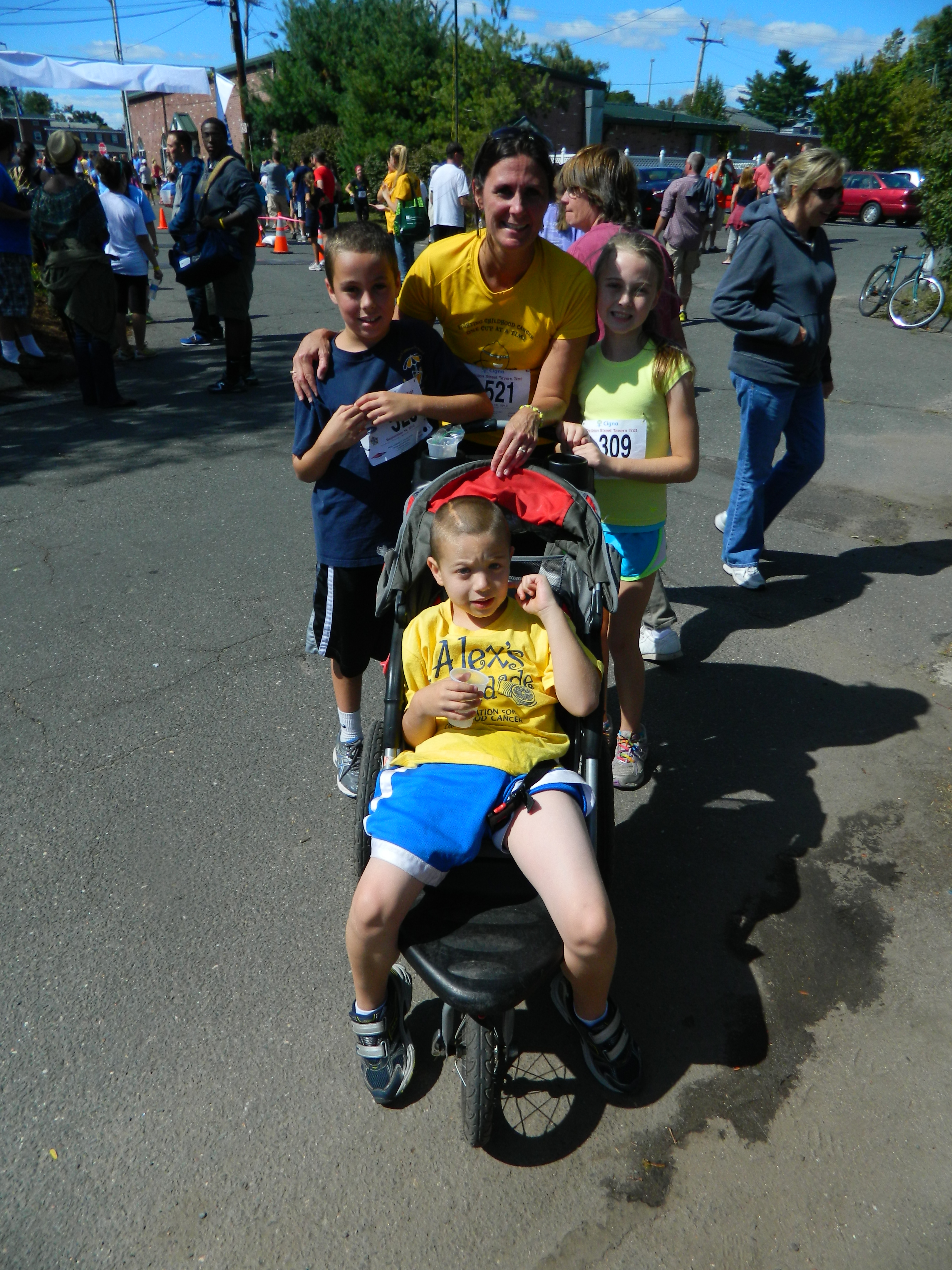 crowd of runners at they waited eagerly at the starting line. She then fell in at the rear of the racers, to walk with her nephew Alex Inytkin, 6, who has tubular sclerosis.