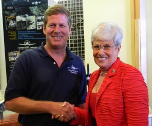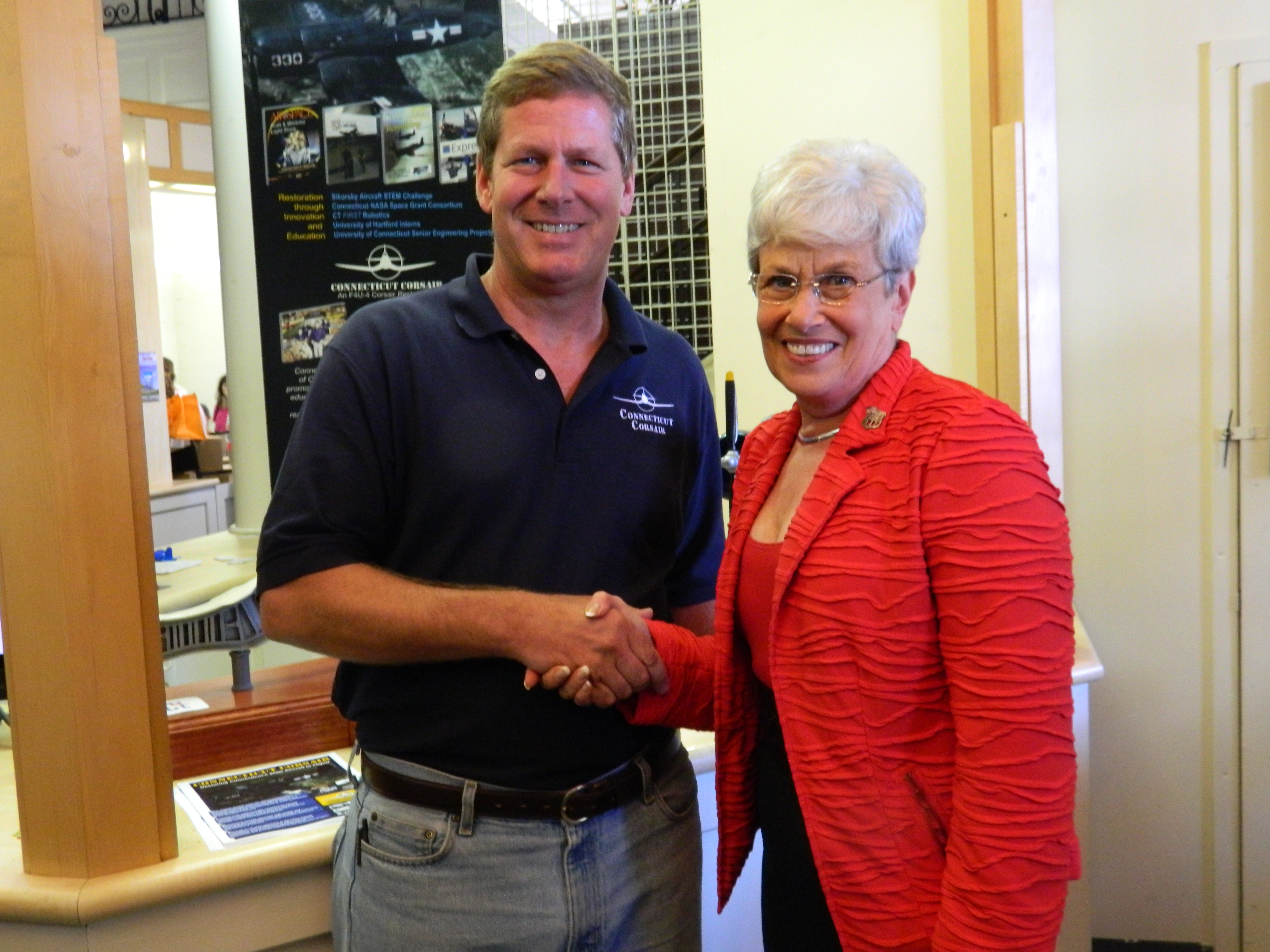 Craig McBurney of the Connecticut Corsair restoration project shakes hands with Lt. Gov Nancy Wyman during Connecticut Day at the 2012 Big E.
