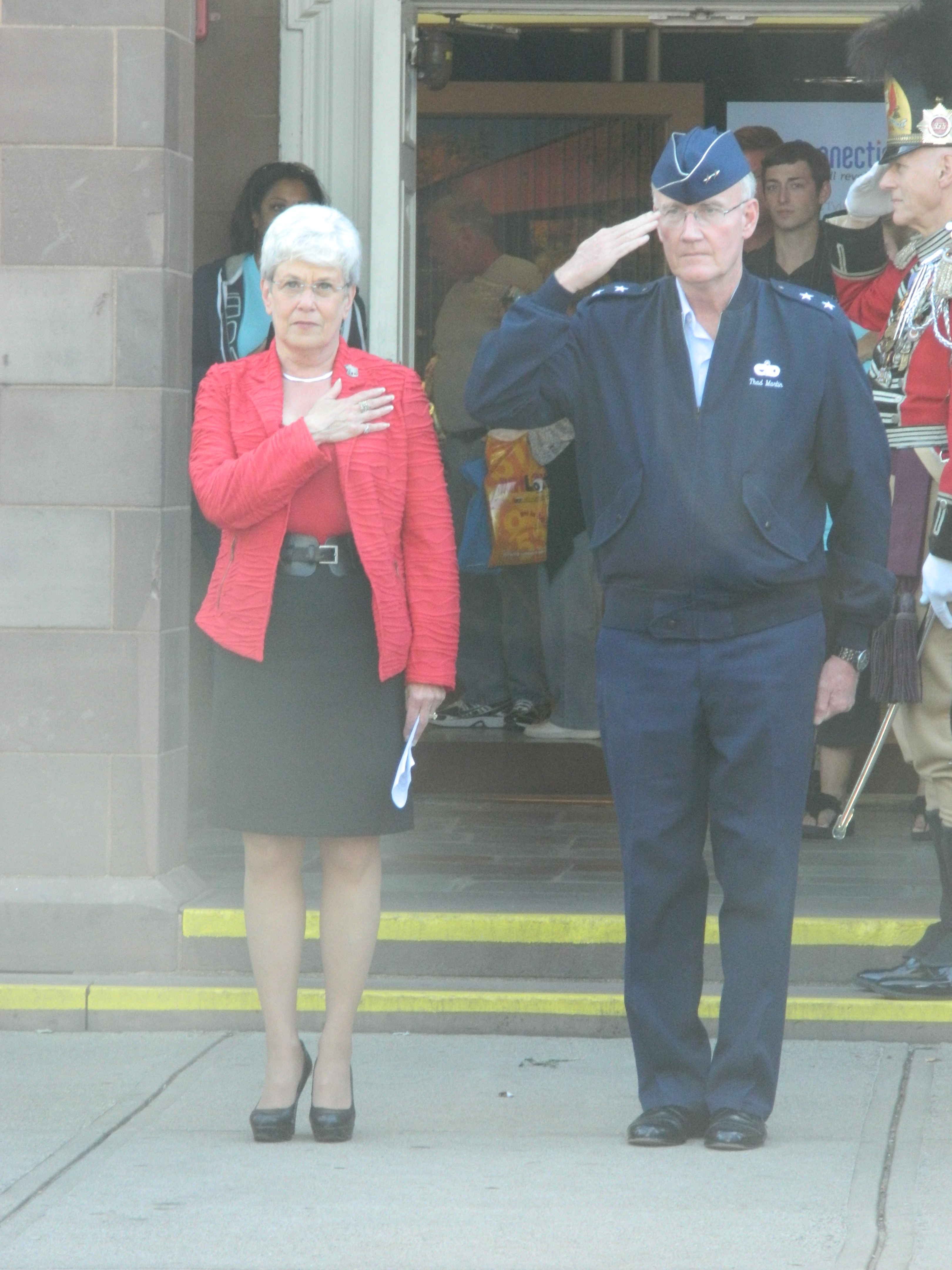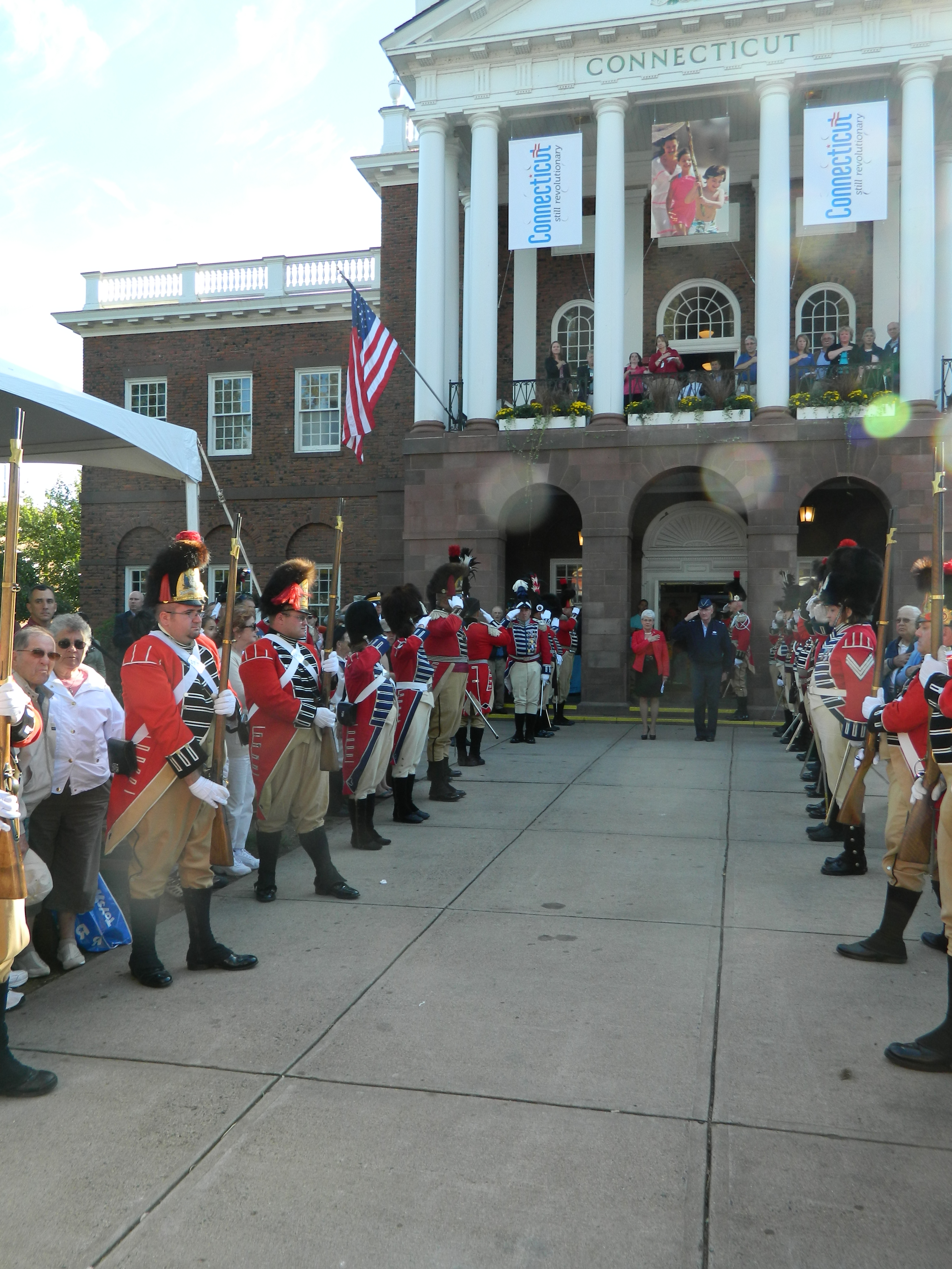 Gene Cassidy, first year president of the Eastern States Exposition – nicknamed the Big E – spoke too as part of pomp and circumstance that also featured the governor’s guard at attention along the front walkway for the playing of the national anthem. That proceeded a kick-off of the Connecticut Day parade led by Wyman. A slight delay in the start gave her a chance to step out of parade formation and shake hands with spectators.