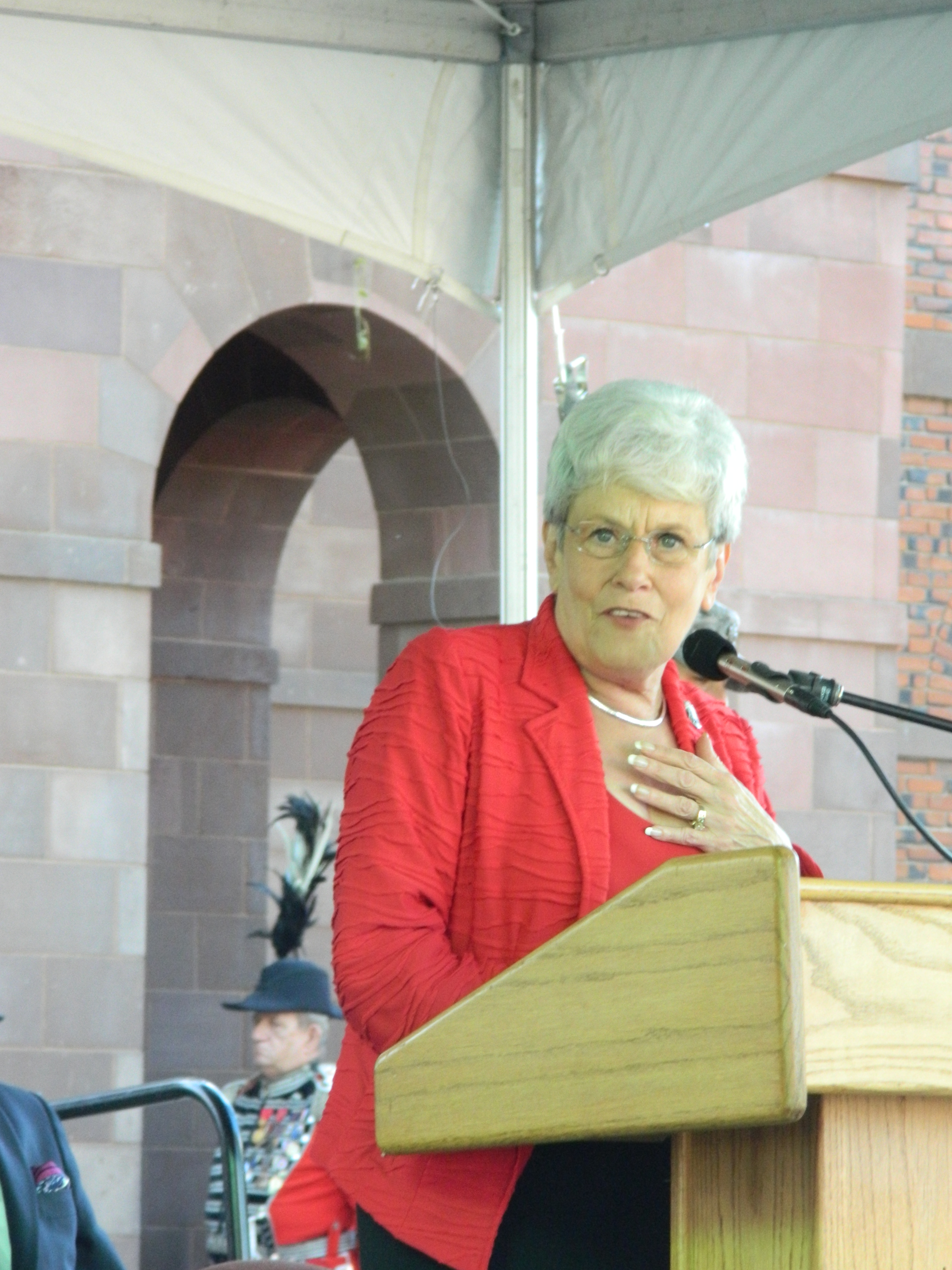 Lieutenant Governor Nancy Wyman led the celebration of Connecticut Day September 19 at the Big E in West Springfield, Massachusetts. Arriving at the Nutmeg State building on the Avenue of States around 2:30 p.m., Wyman was greeted by Sgt. Jeff Samonajczyk and other members of the Connecticut Environmental Conservation Police. Wyman spent the better part of the afternoon mingling with exhibitors and constituents before taking the podium on a stage out front to address the crowd.
