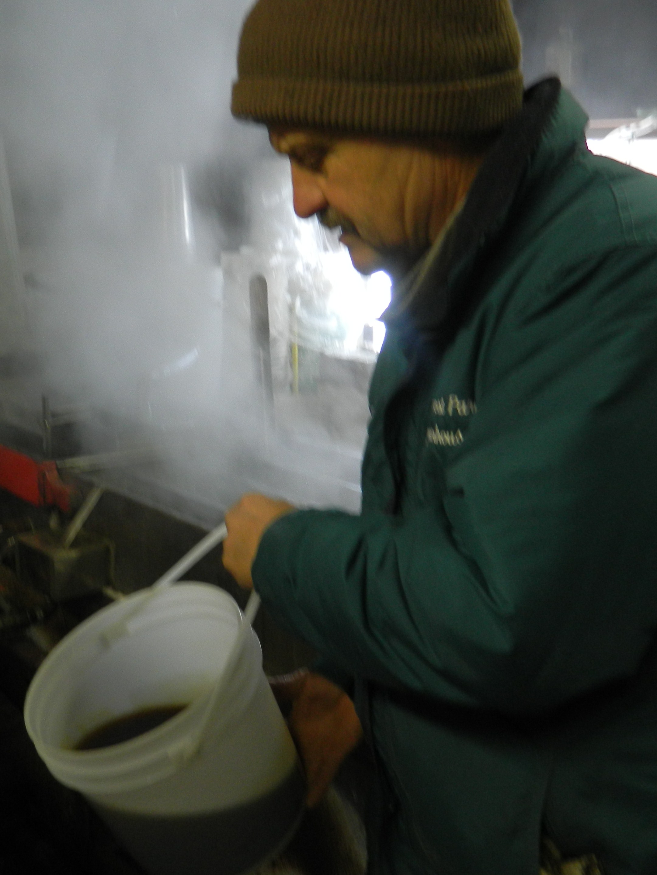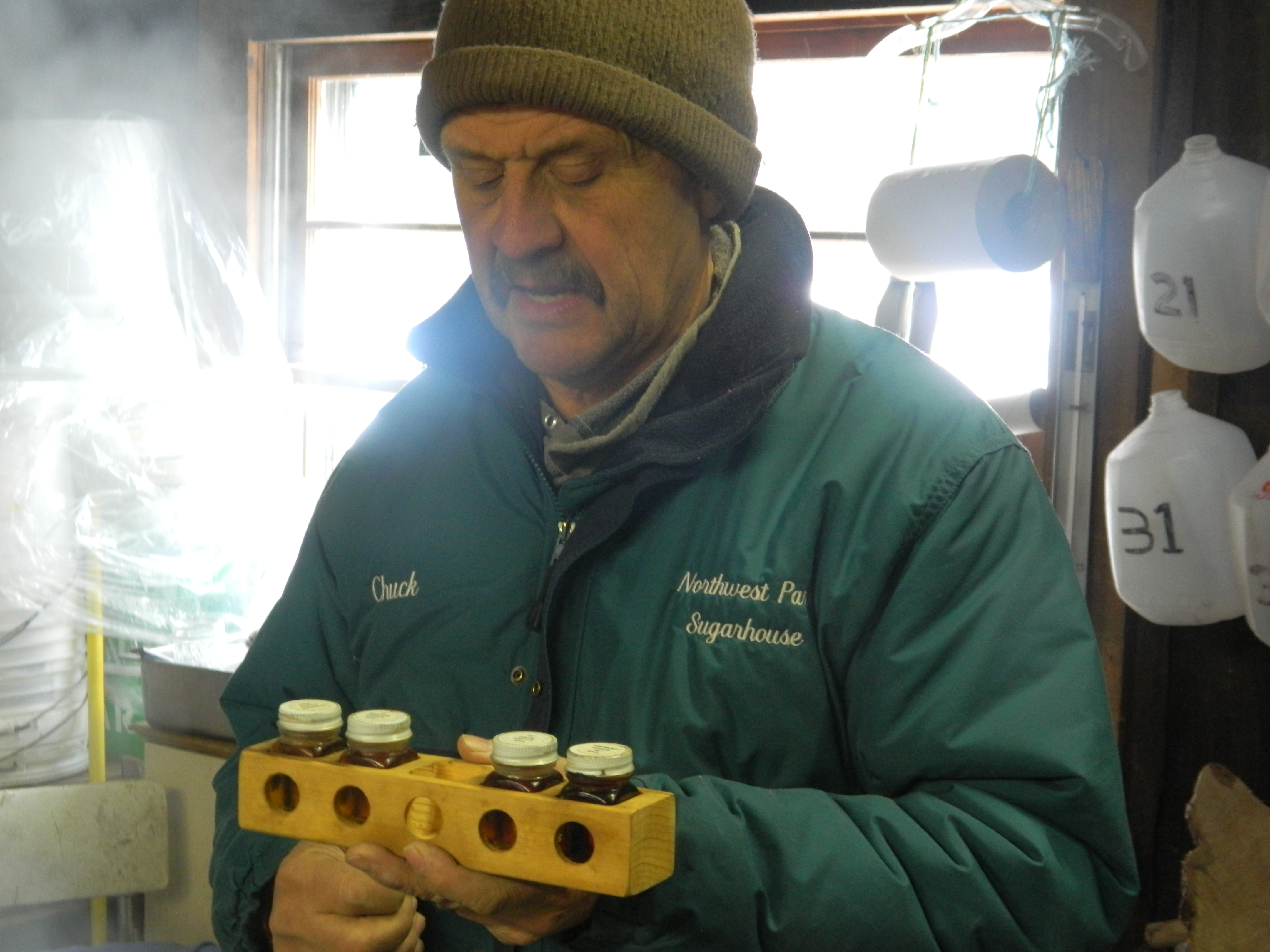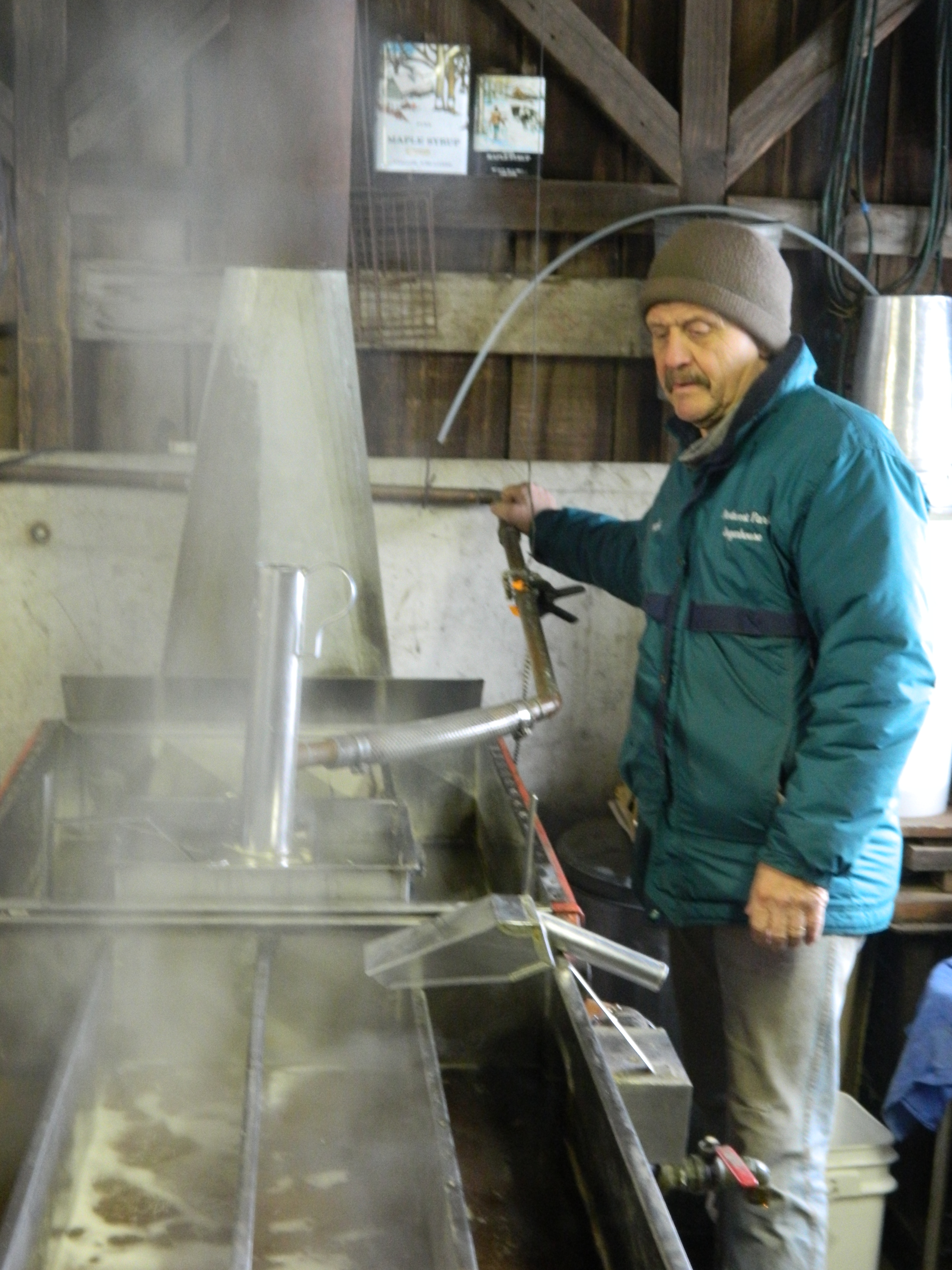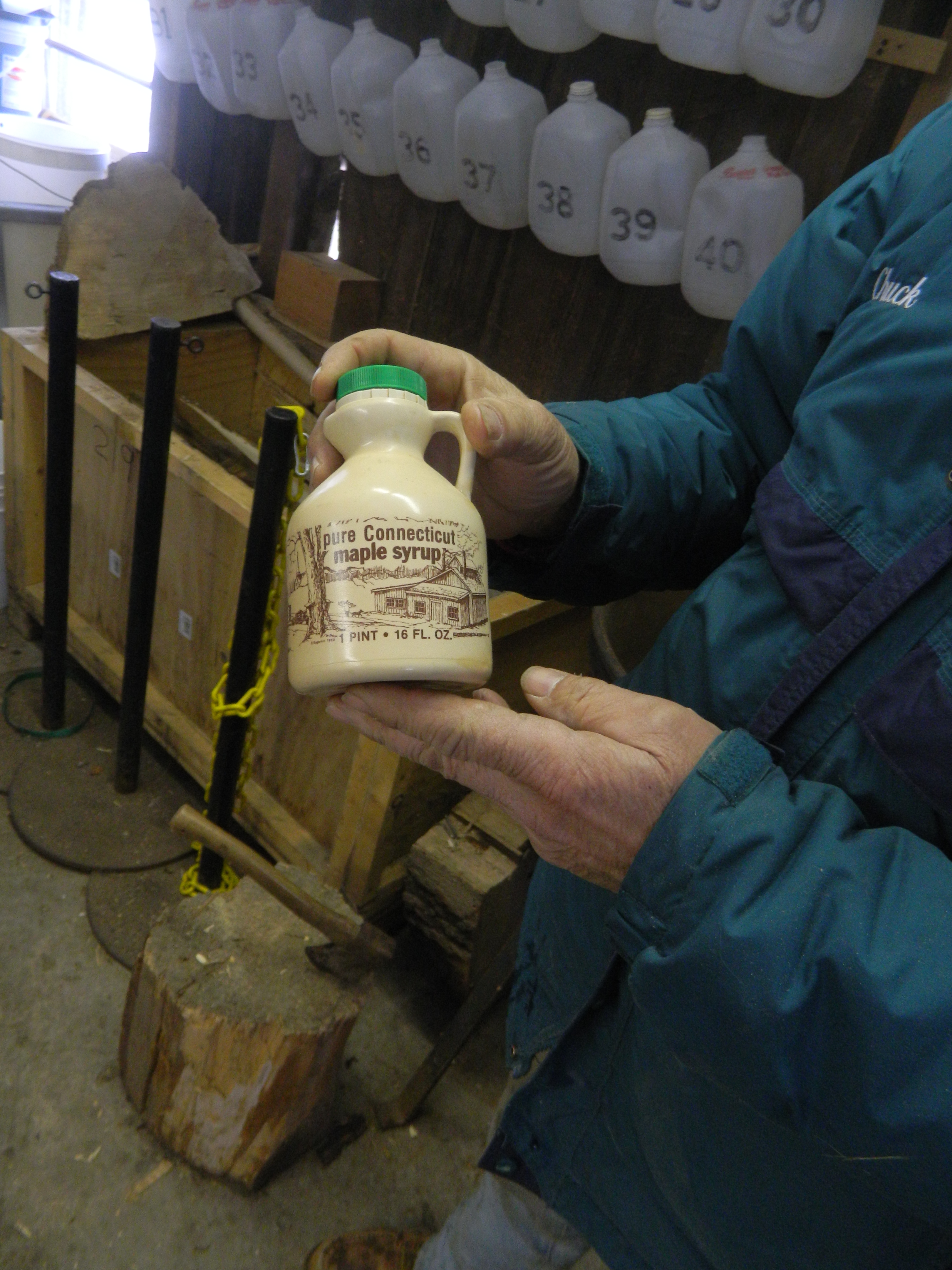 More and more steam rising from the boiling sap hampered visibility inside so Drake opened up the roof. A hydrometer placed in the boiling sap is used to test its thickness. Eventually, after the sap turns to syrup Drake eyeballs its color to determine if it is light or dark amber which contributes to grade A or B designation, a measure of flavor. Once ready, the Northwest Park Sugarhouse syrup is poured into jugs and becomes part of the one percent of the world’s maple syrup that is produced in Connecticut.