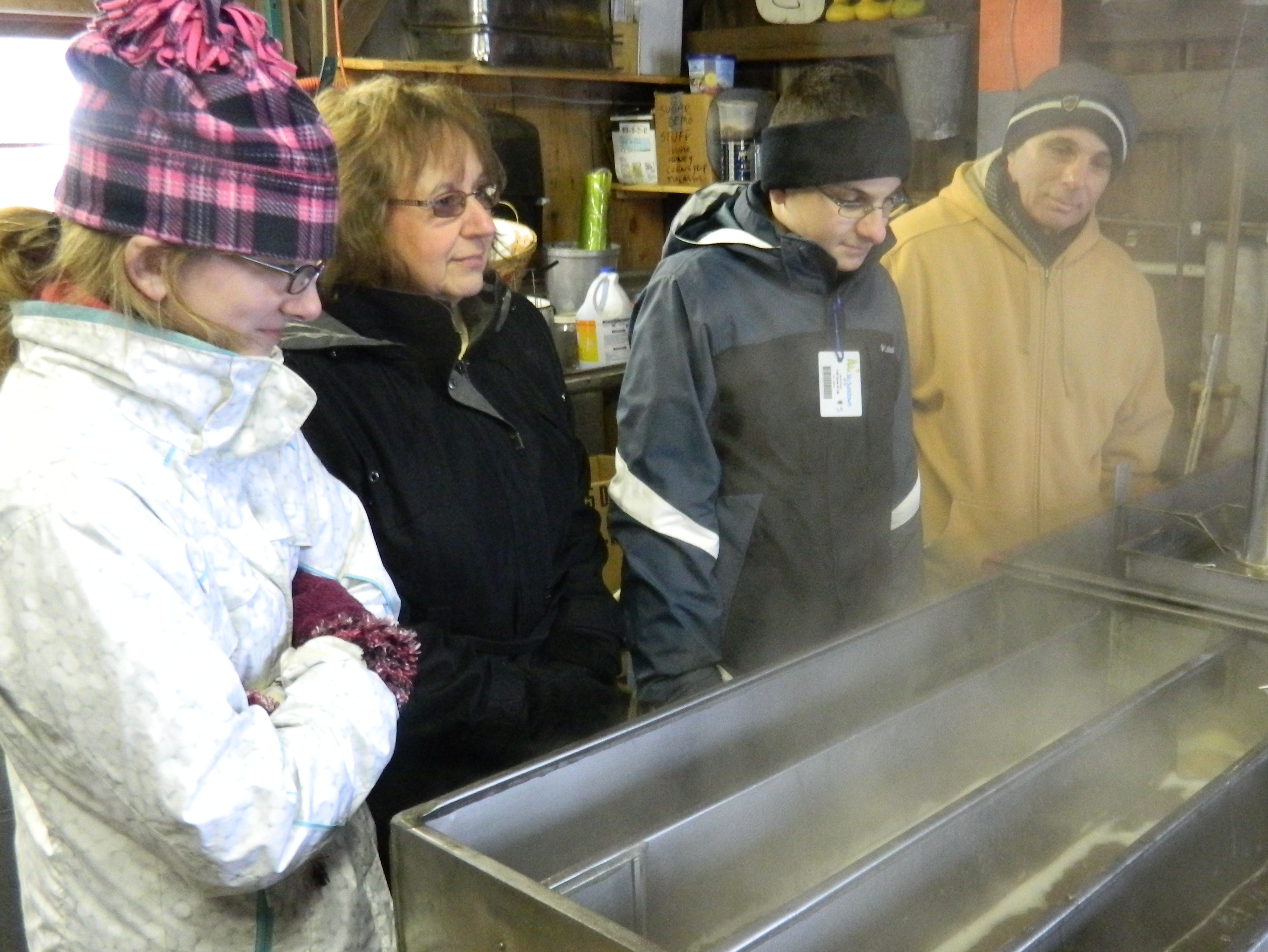 About half a dozen visitors had stopped in to the maple sugarhouse on Sunday morning trekking over the snow and braving the day’s chilled and windy weather. For Sara and Eric Rodonis of West Hartford who attended with friends Terry and Mike DeCarlo of Windsor, clearly the sweet aroma filling the sugar shack was ample reward for their hardy sojourn.