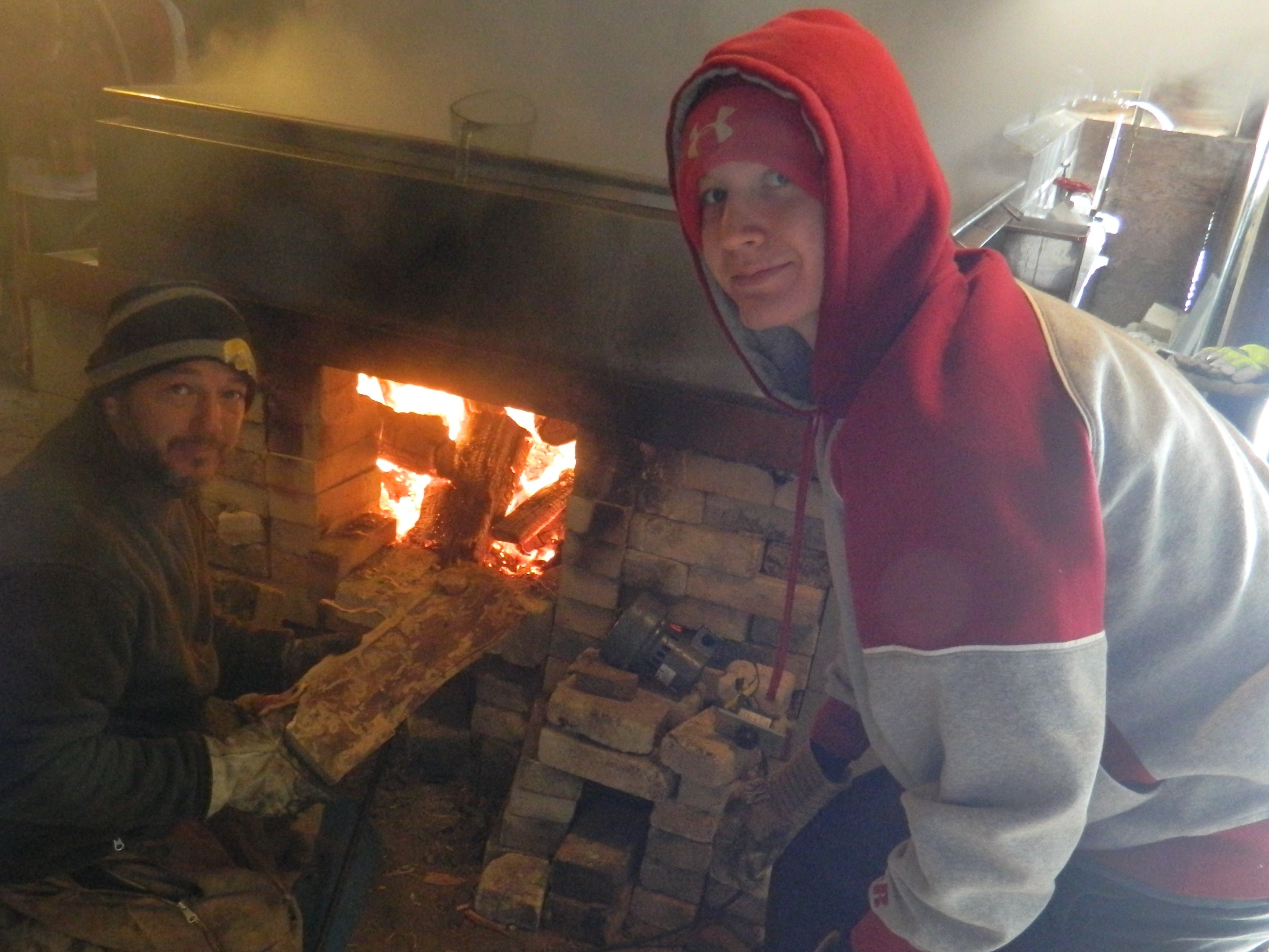 Dan installed extensive piping on the farm to carry the sap from the maple trees to a tank outside the sugarhouse; the sap is then piped inside. Facilitated by warm days and cold nights typical of mid-February and March in New England, this season’s yield has been flowing abundantly from the small taps. The result – six intensive weeks of tending to the maple sugaring including long days that morph into long evenings, usually punctuated by a few marathon nights.