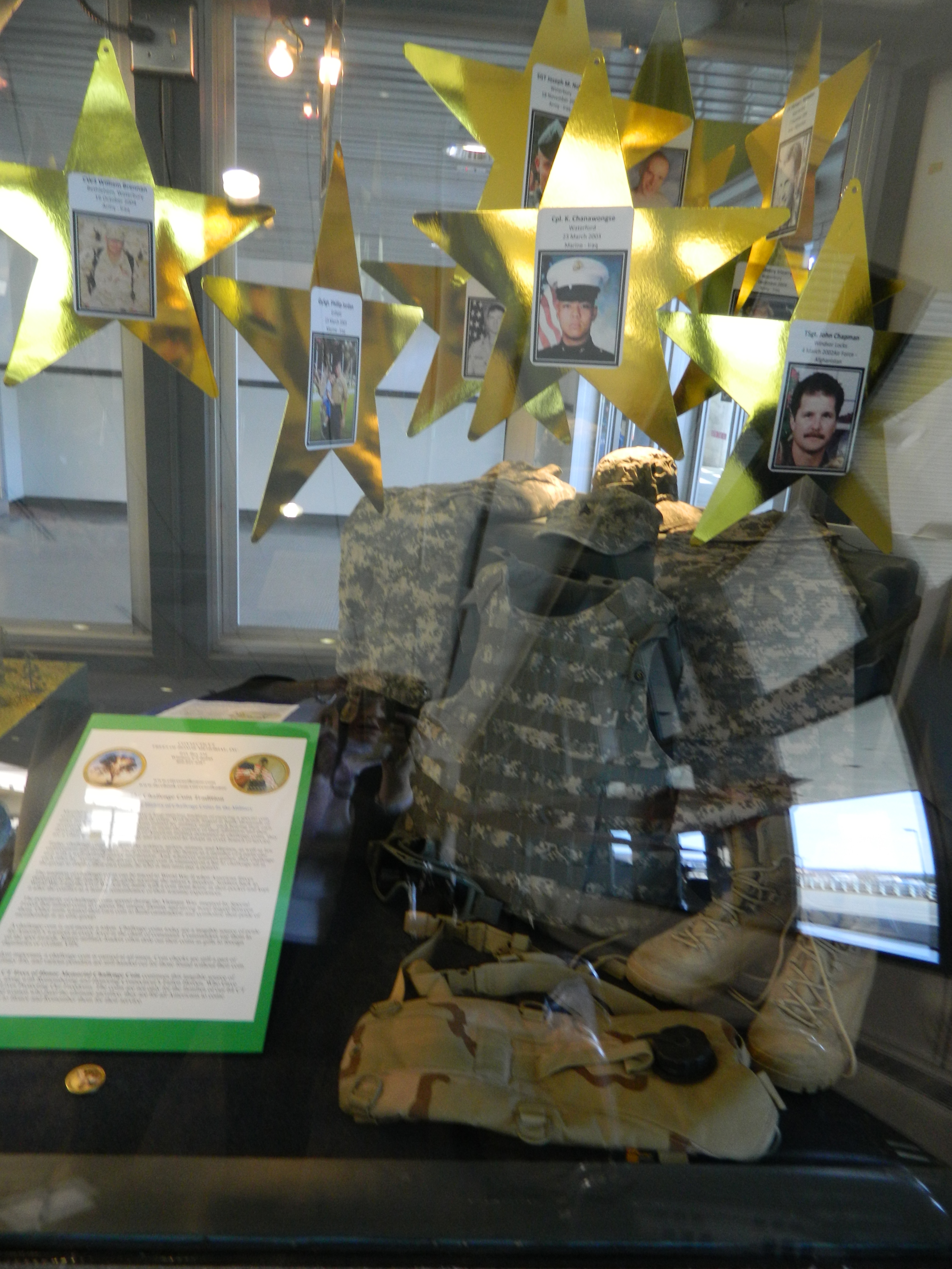 Visitors to terminal A have the opportunity to see two display cases housing a small scale model of the living memorial grove of trees for which construction is slated to begin in September of this year, at Veterans’ Memorial Park on Newfield Court in Middletown, to honor the state’s military men and women who gave their lives in service to the nation in the wars in Iraq and Afghanistan. The display also has hanging stars with photos of each of the state’s 64 fallen heroes and gear belonging to the fallen soldiers – including a dress uniform worn by SGT Steven DeLuzio at his brother’s wedding.