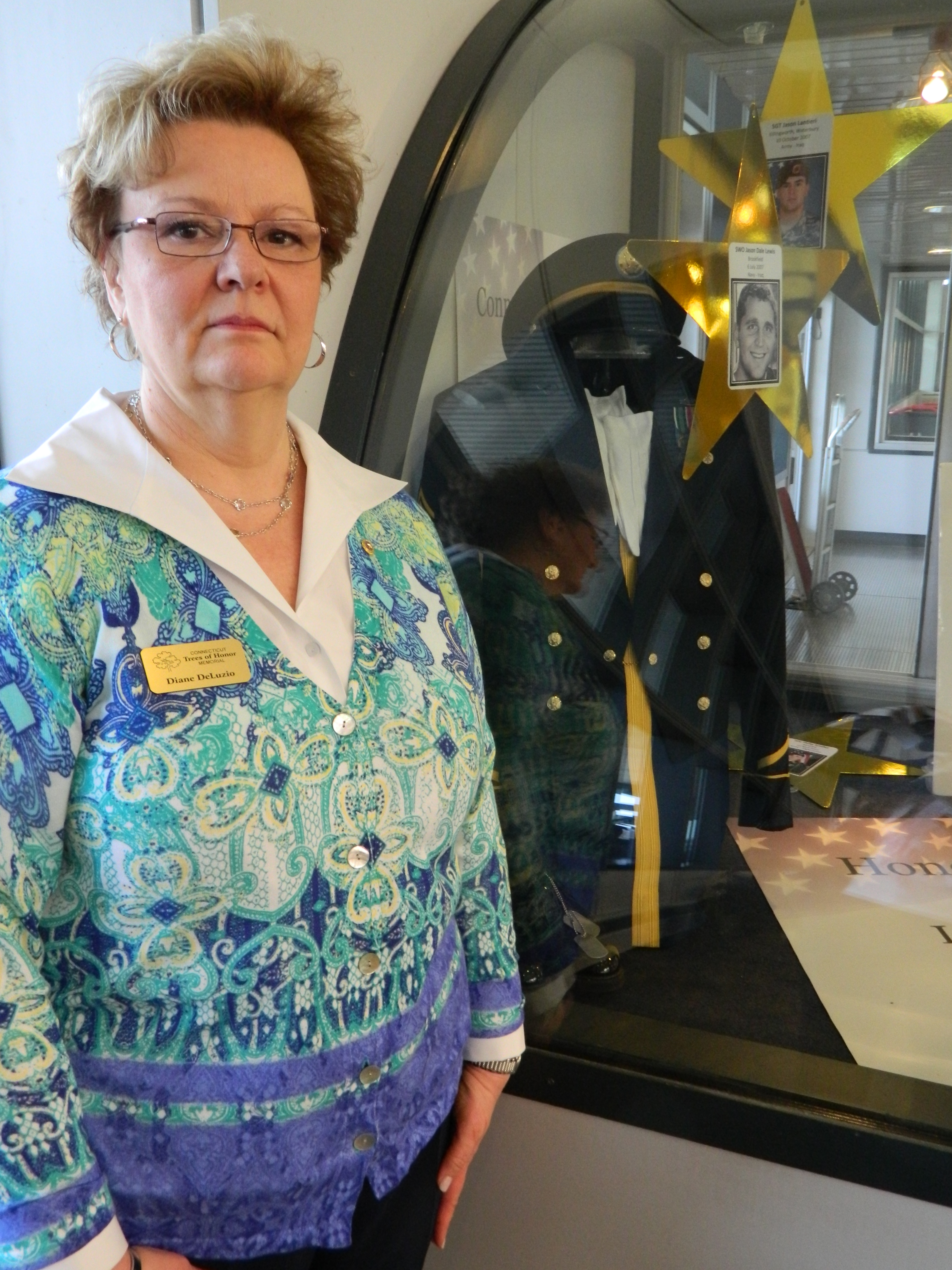 Diane DeLuzio, whose son was killed in Afghanistan, stands by his dress uniform which is part of the memorial display.