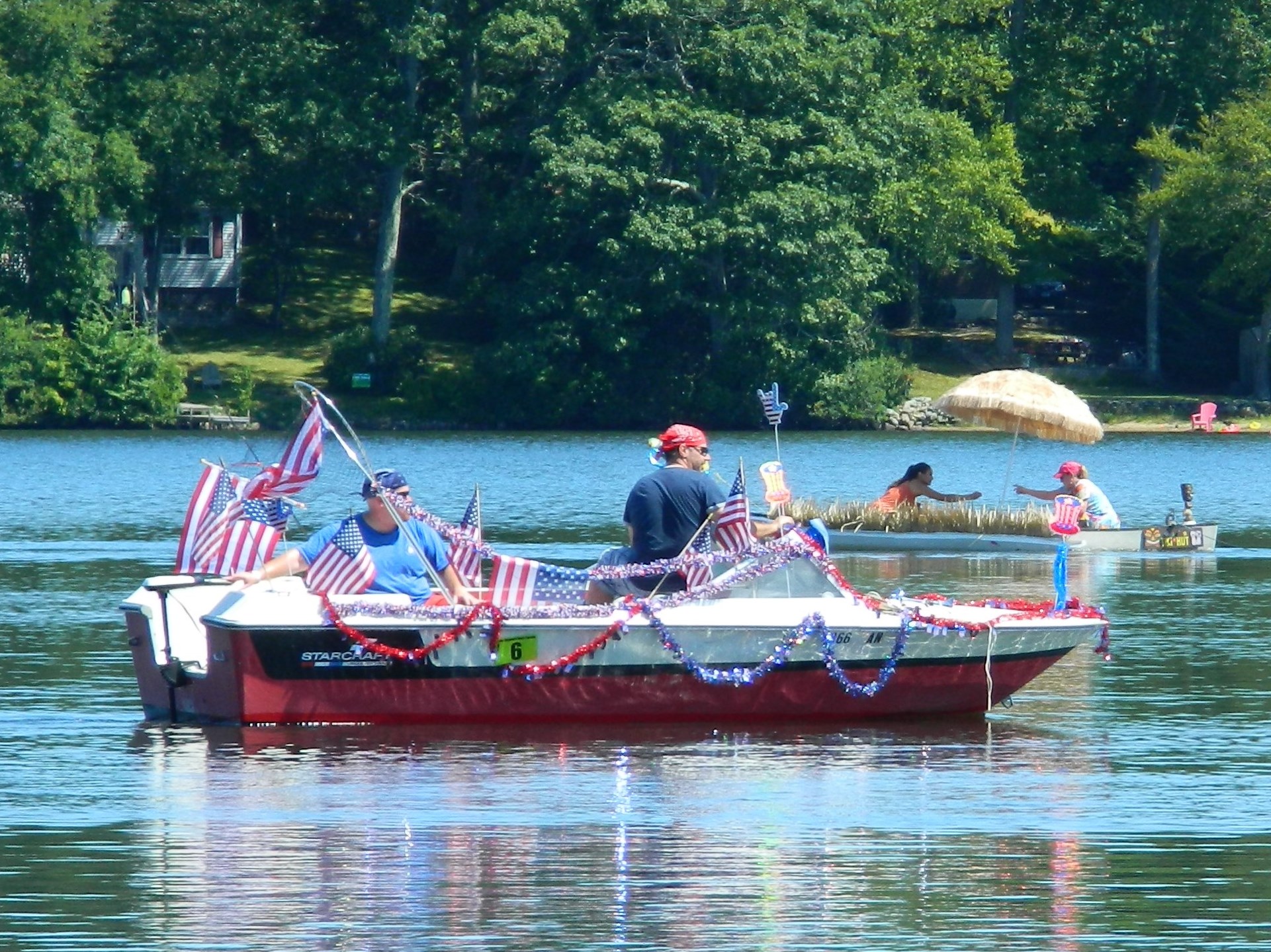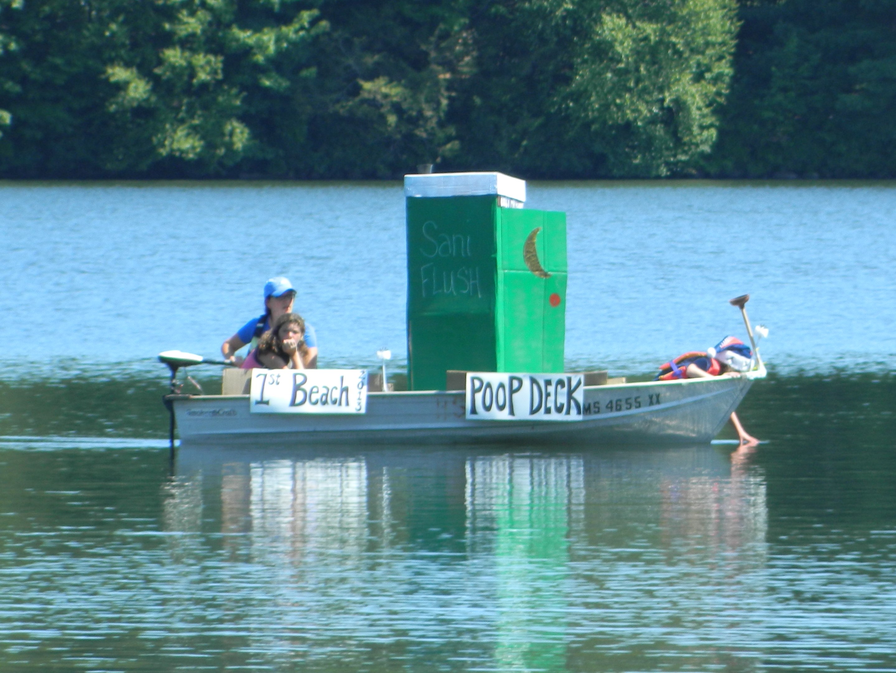 In addition to accenting the beauty of the lake, the Boat Parade was clearly an opportunity for participants to express their personal creativity. Decorations ranged from patriotic themes to Hawaiian wanderlust, to commentary on the construction that has been underway at the Dog Beach pavilion rebuilt after it was damaged by fire several months ago, and, well – um – what might be called bathroom humor – with old fashioned “outhouses” on board.