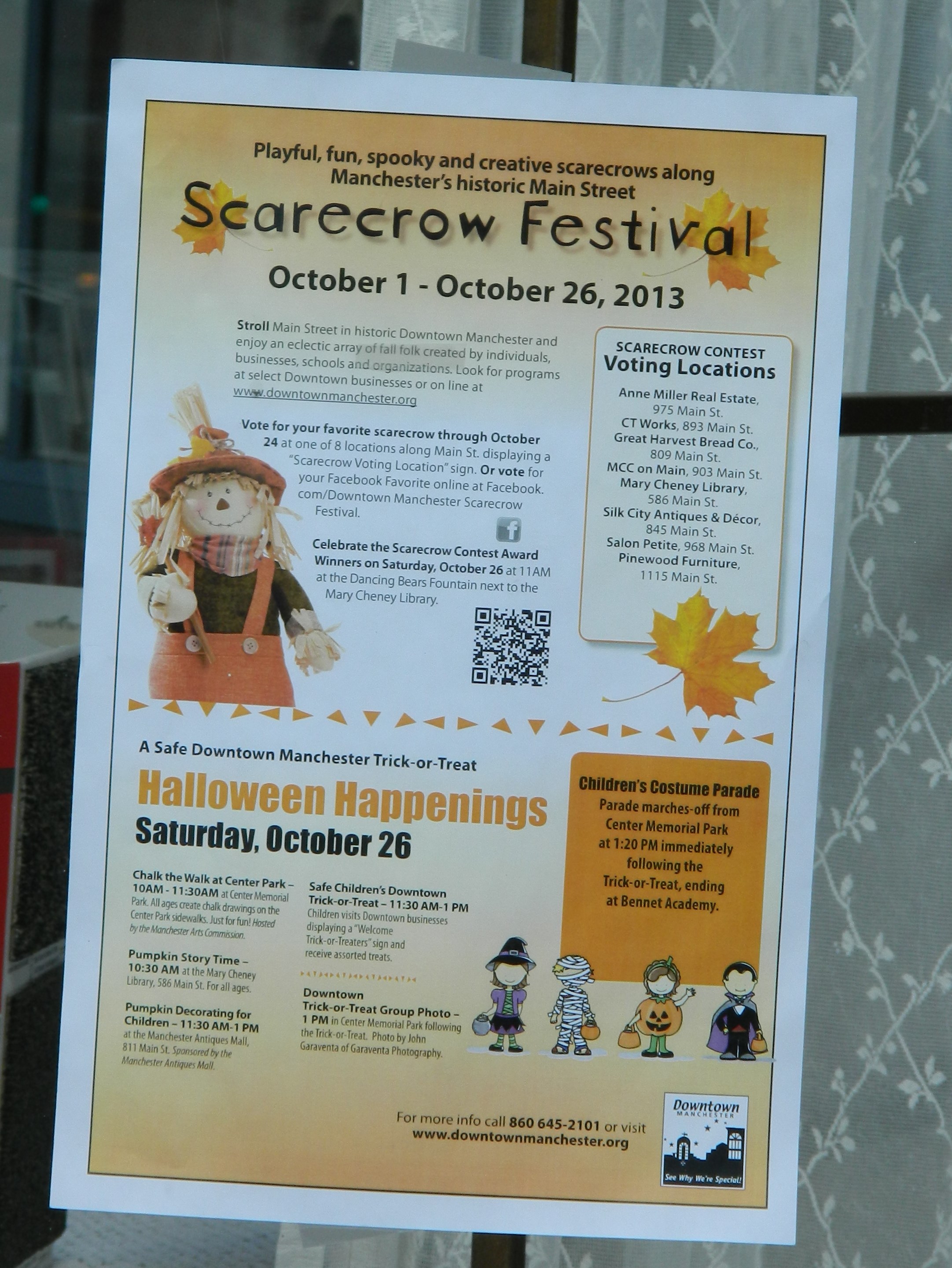 The Fifth Annual Scarecrow Festival & Contest runs through October 26 in Manchester, Connecticut. There is no cost to visit the historic downtown where individuals, schools, businesses and organizations have put their imaginations to work and created an entertaining variety of scarecrows that line the long Main Street in the “City of Village Charm”.