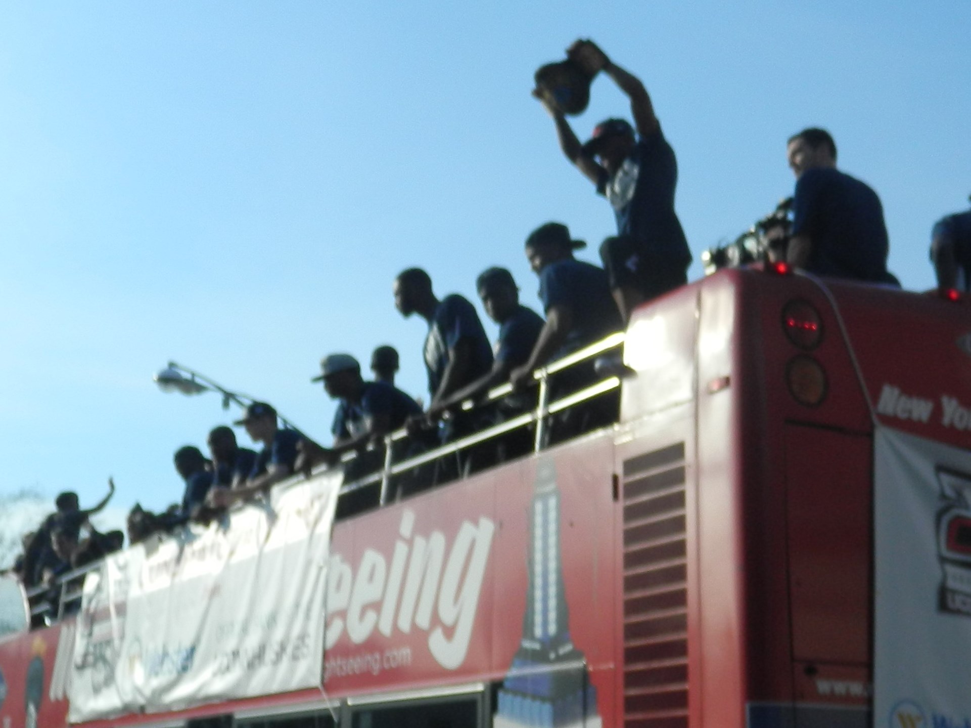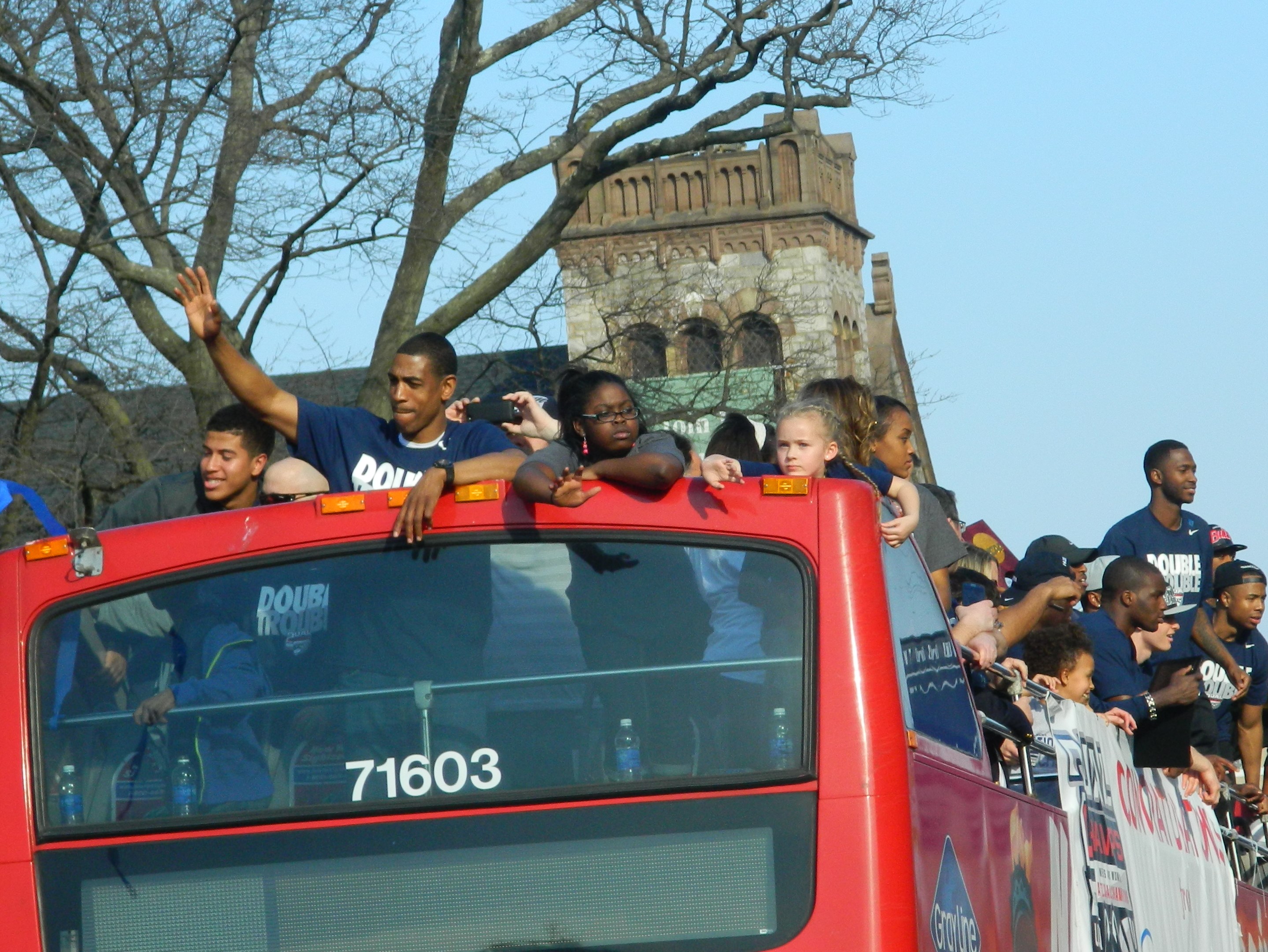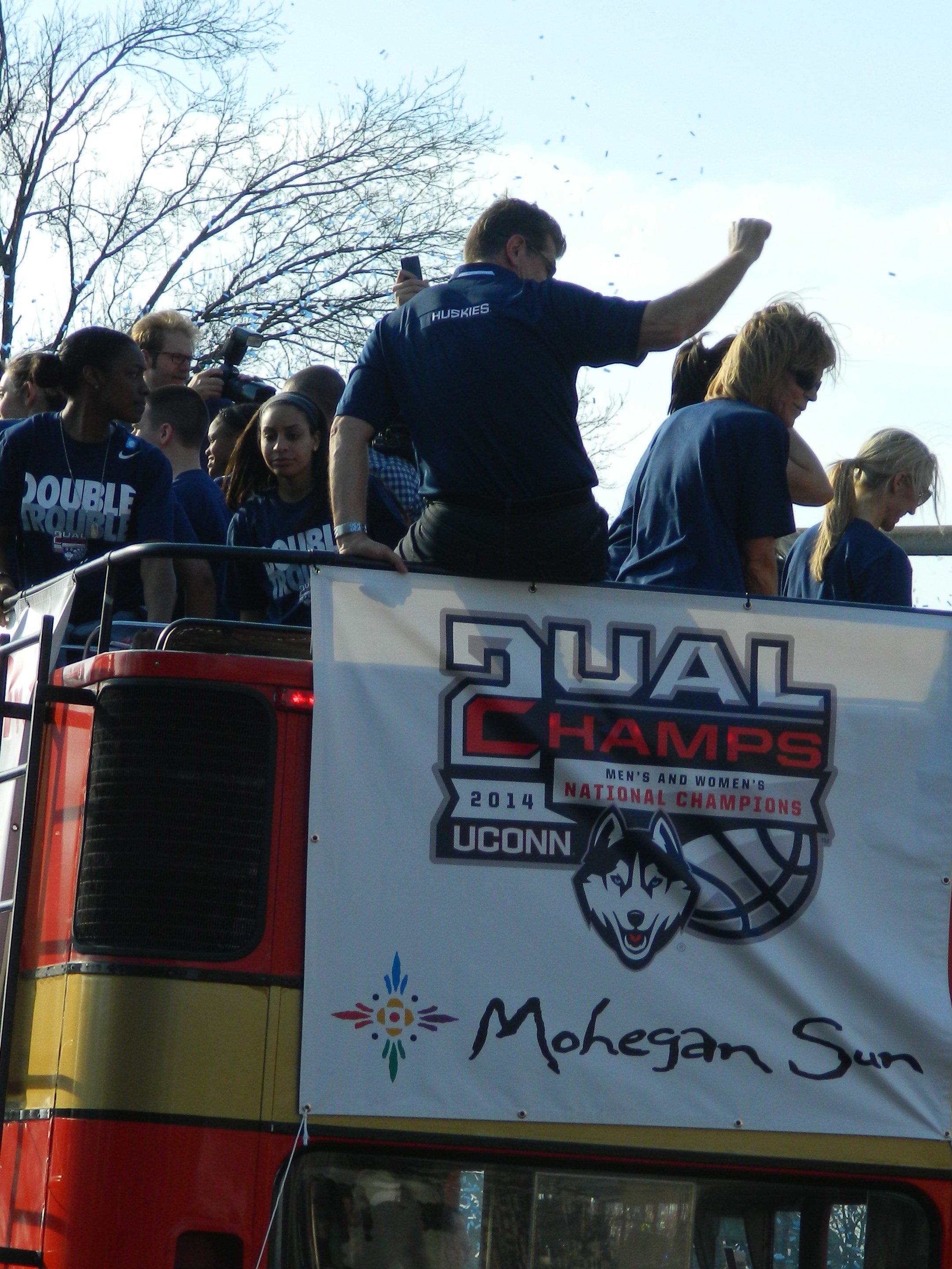 Applause was abundant for all the parade units but the fervor of the crowd rose as the double-decker buses carrying the men’s and women’s teams approached, announced by bursts of blue and white confetti. First were the women with Coach Geno Auriemma seated in back. In the men’s bus, Coach Kevin Ollie rode in front waving and smiling as the national championship trophy was held aloft by his team. Chants of “UCONN – HUSKIES” were ongoing throughout the parade, however they got even louder as the teams passed by, as well as, shouts of “GENO” and “OLLIE.”