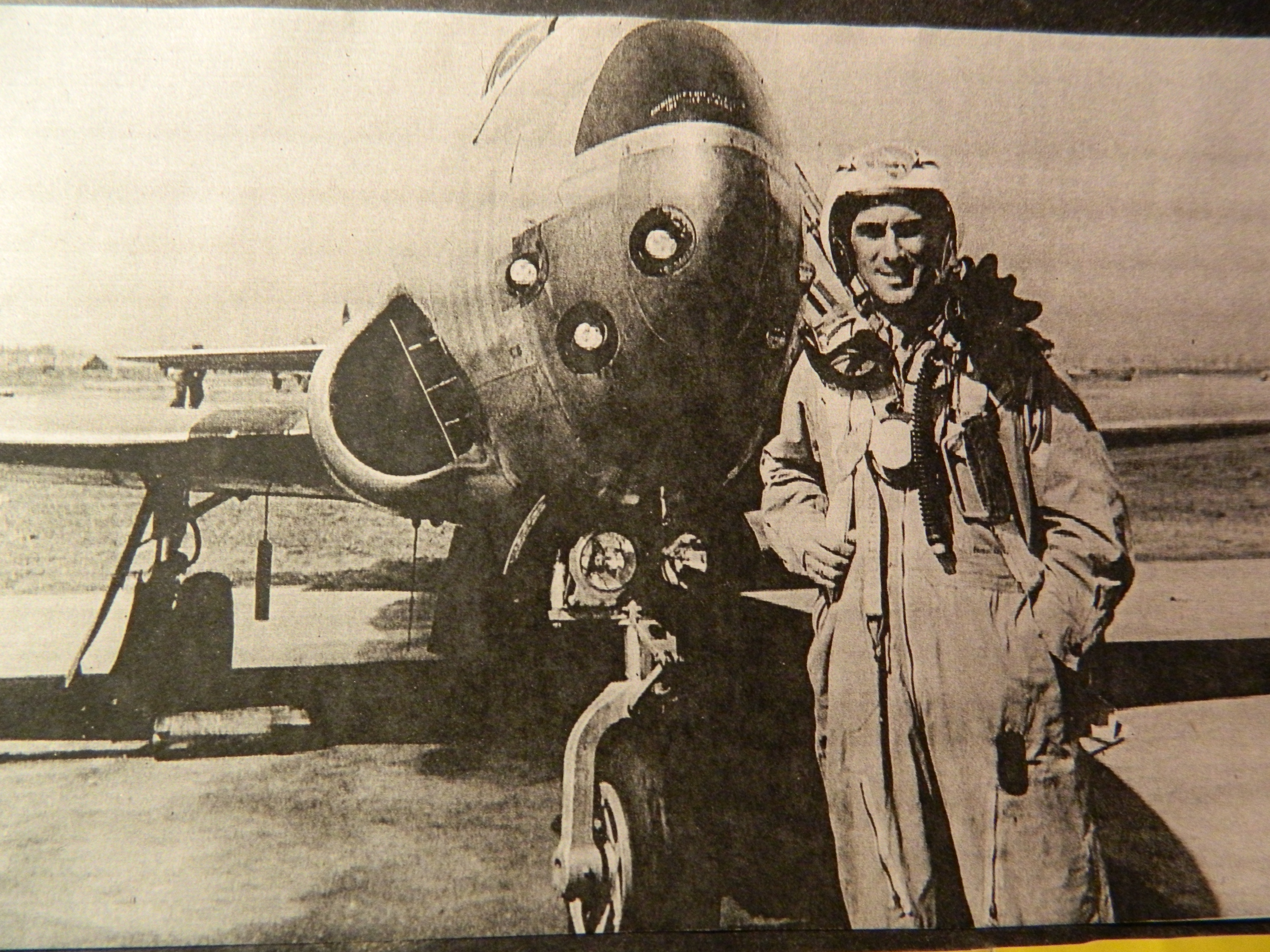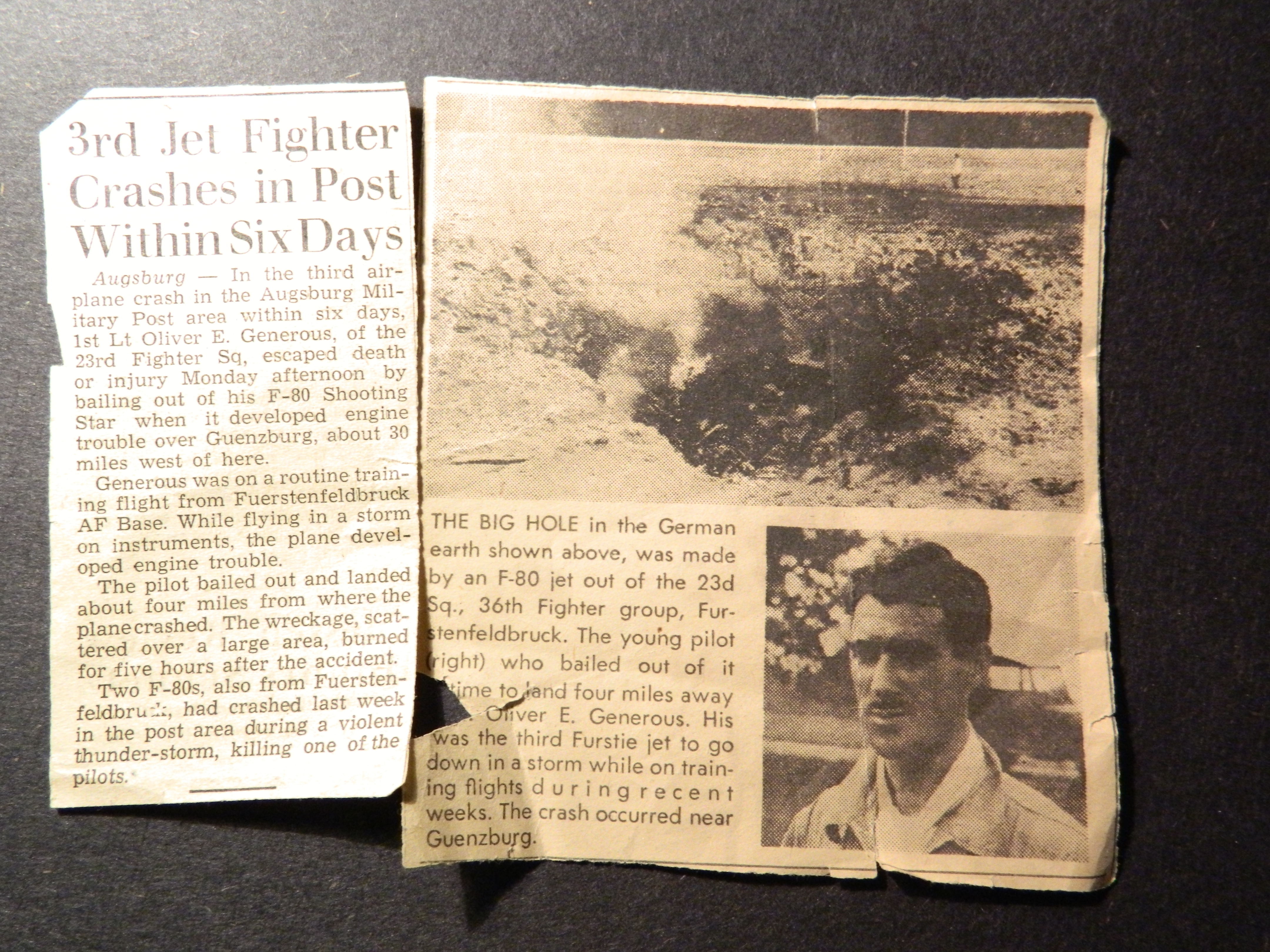 He made news again, escaping death when as a member of the 23rd Fighter Squadron, his F-80 Shooting Star crashed after it ran into engine trouble while he was flying using instruments in a storm in Augsburg, Germany. That report was picked up by the local newspaper. According to that article, “Uncle Bunker” was on a routine training flight near Fuerstentedbruck AF Base and was able to successfully bail out. It had been the third such incident with F-80 aircraft near Augsburg within a short period, one of those crashes resulted in the death of the pilot.
