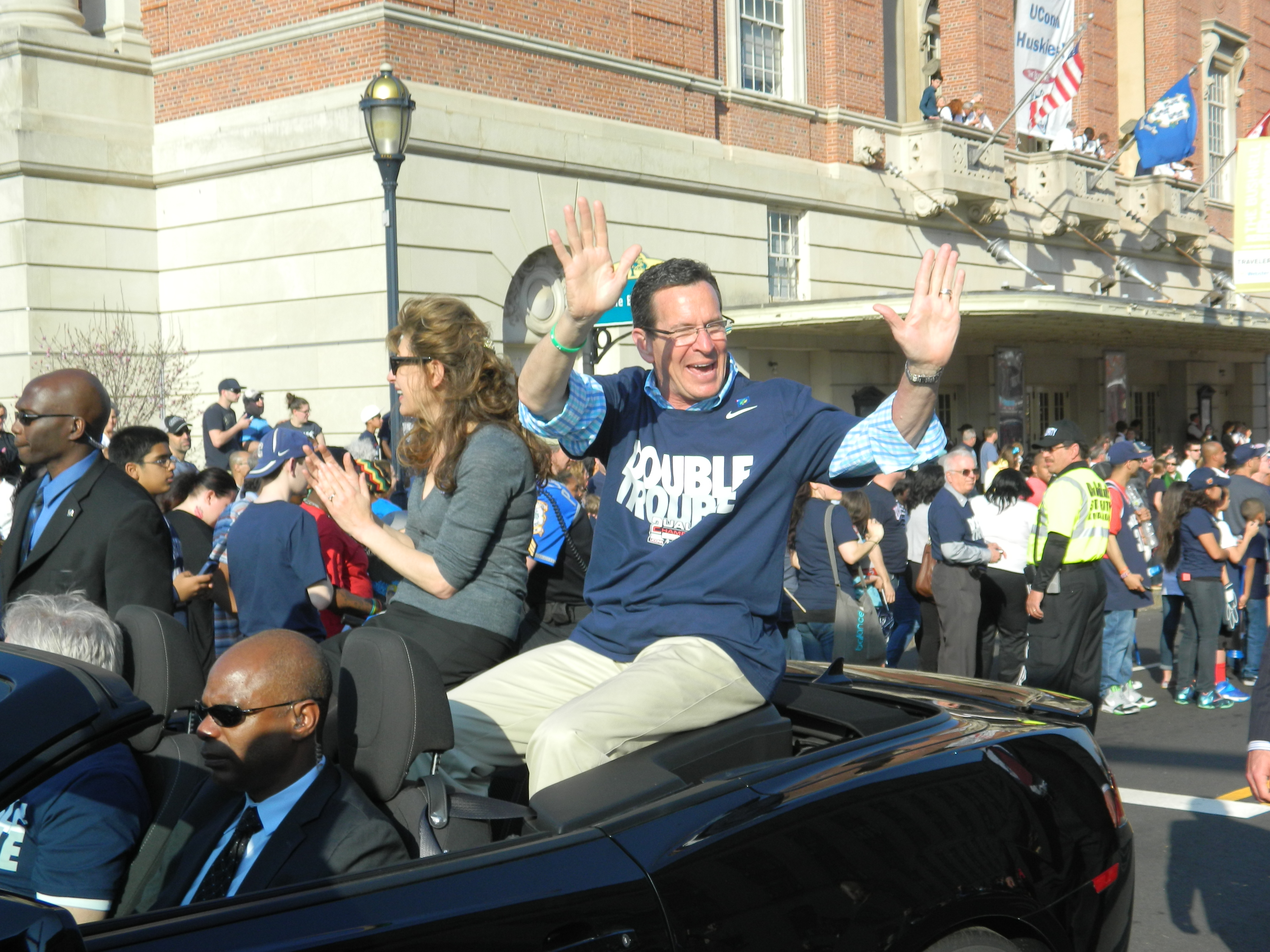Univeristy of Connecticut President Susan Herbst (left) shown riding with Gov. Dannel Malloy in the parade held April 13, 2014 in downtown Hartford, CT for the dual championship Huskies