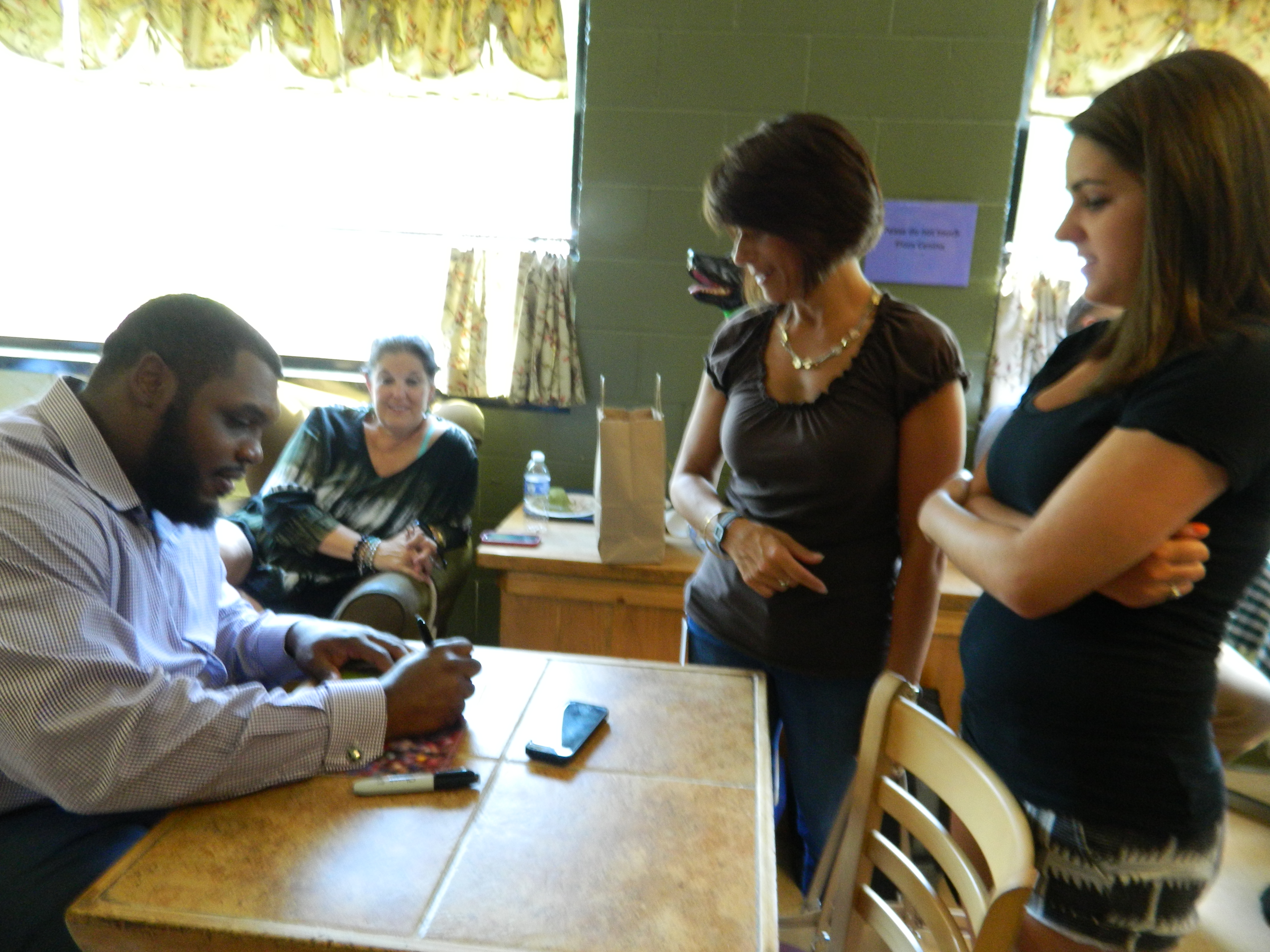 Kristen Ritchie, who works in the Windsor area came by with her daughter Alicia. Kristen has a friend who is a die hard Redskins follower and wanted an autograph for her. Dane Kendall, a Metropolitan District Commission employee who was working on a water project in front of the restaurant, lives in Connecticut now but was originally from Maryland. Kendall remains a Redskins fan and could hardly believe his good fortune in having the opportunity to meet and have a photo taken with Baker, he said.