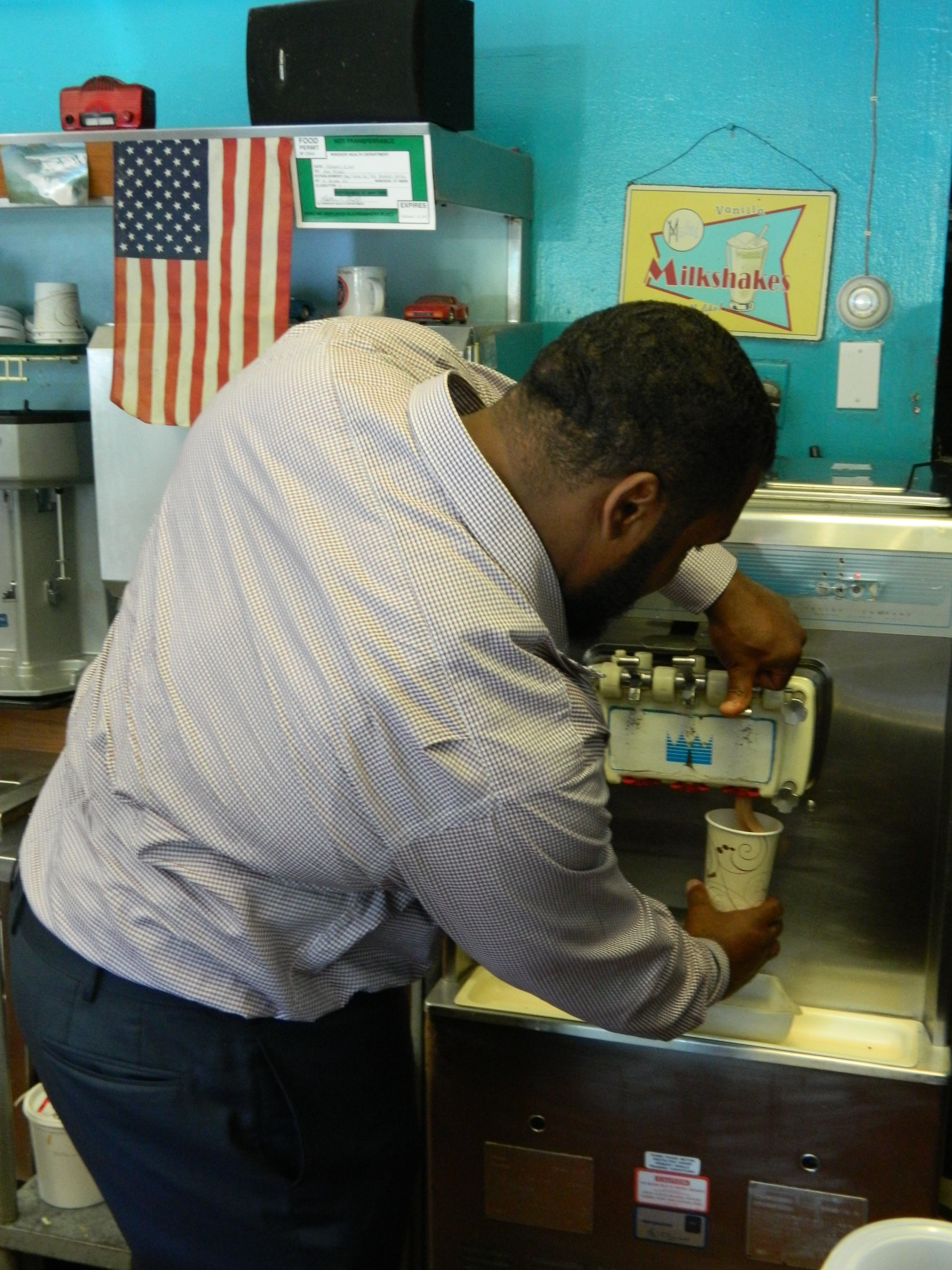 Much to the delight of customers and the staff of Bart’s, that shares a connected space with The Beanery and Bear’s Smokehouse BBQ, Baker tried his hand at taking orders, mixing milkshakes and cooking hotdogs and cheeseburgers on Bart’s “Famous Magic Grill.”