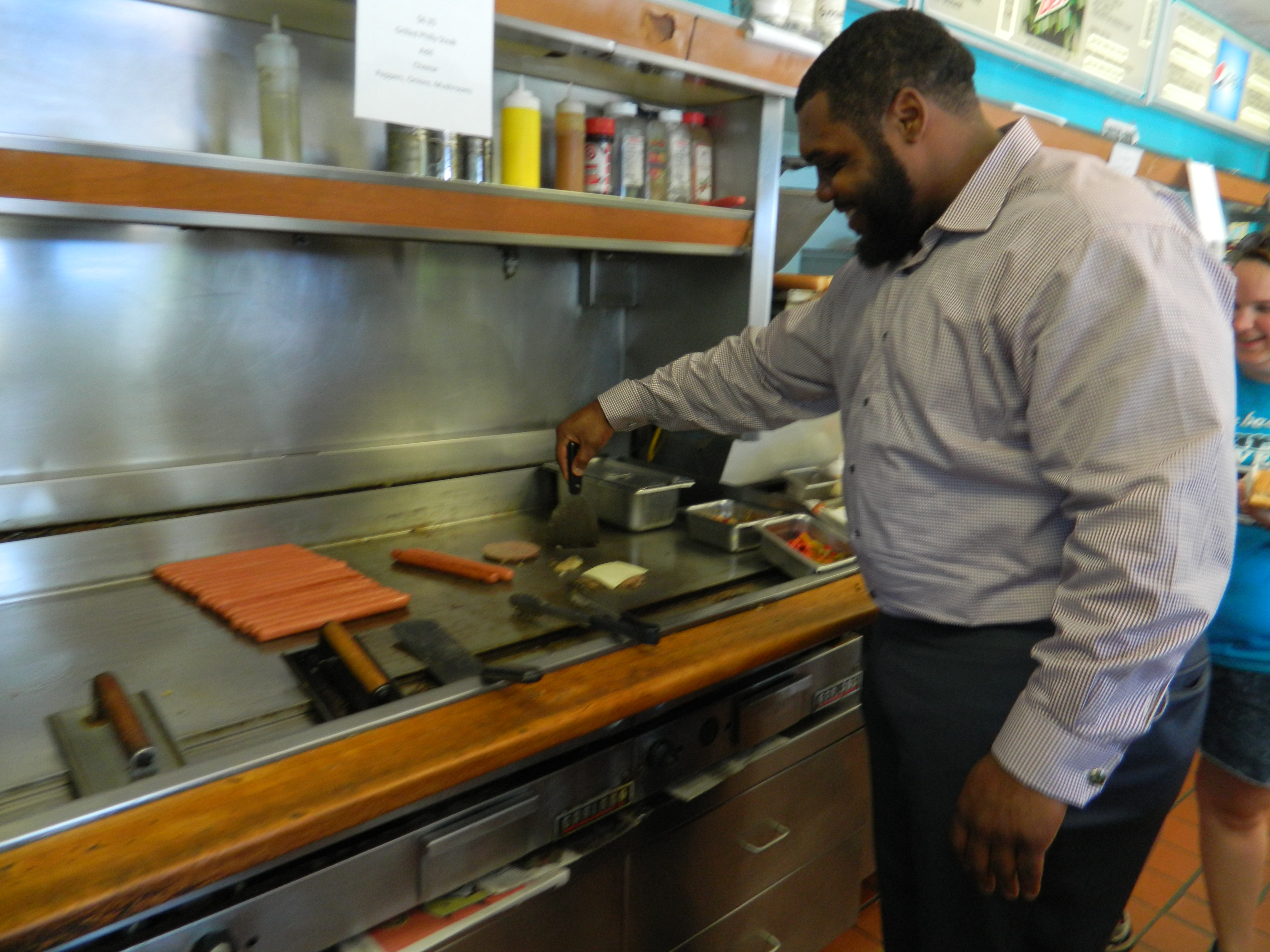 Photo by Jacqueline Bennett To the delight of customers, NFL player Chris Baker tries his hand July 11, 2014 cooking on the “Famous Magic Grill” at the iconic Bart’s Drive-In, Windsor, Connecticut.