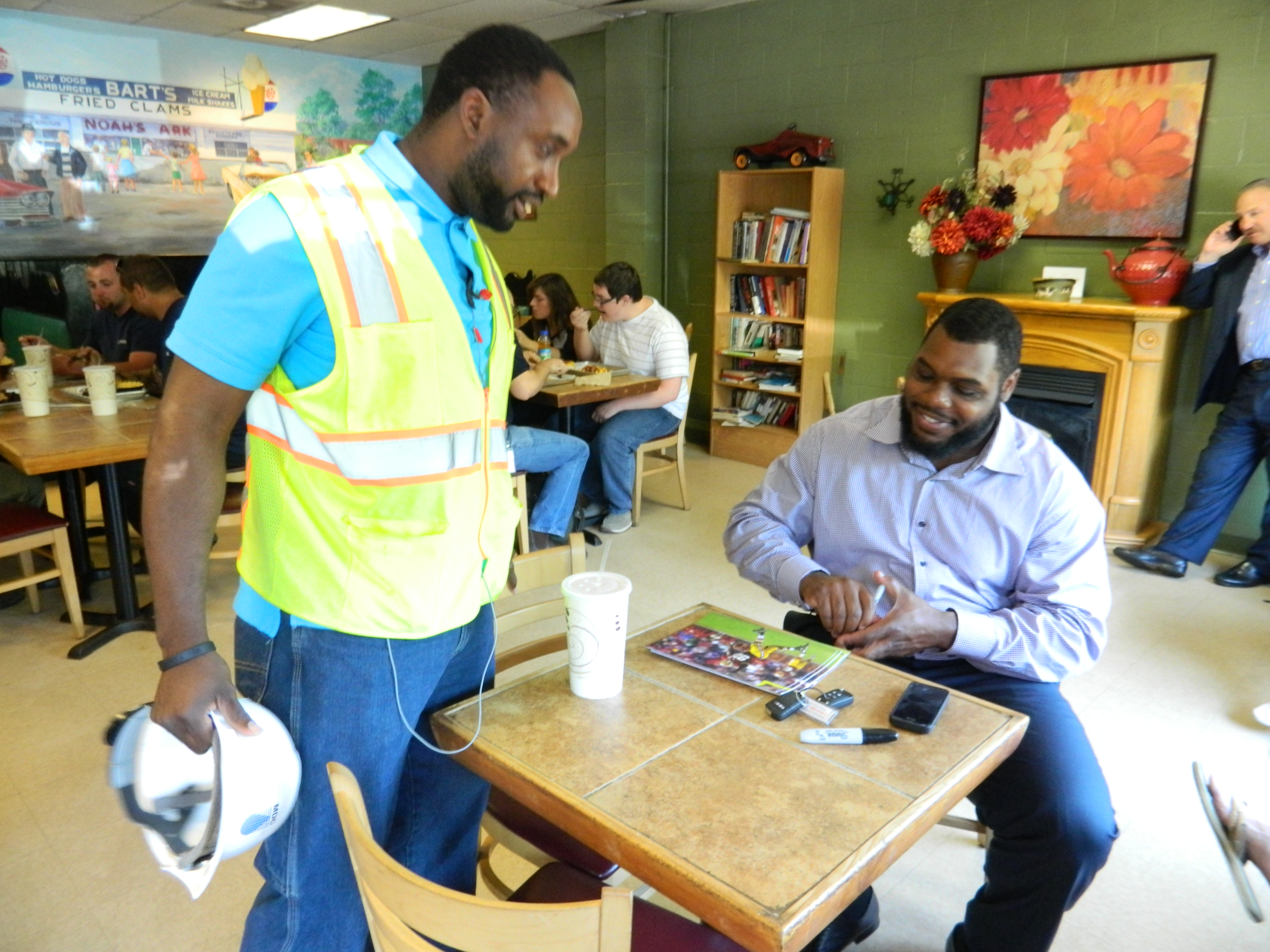 Bart’s – where hometown heroes meet. NFL player Chris Baker shakes hands with fellow WHS football alum Dan Nolan, who served in Iraq and Afghanistan.