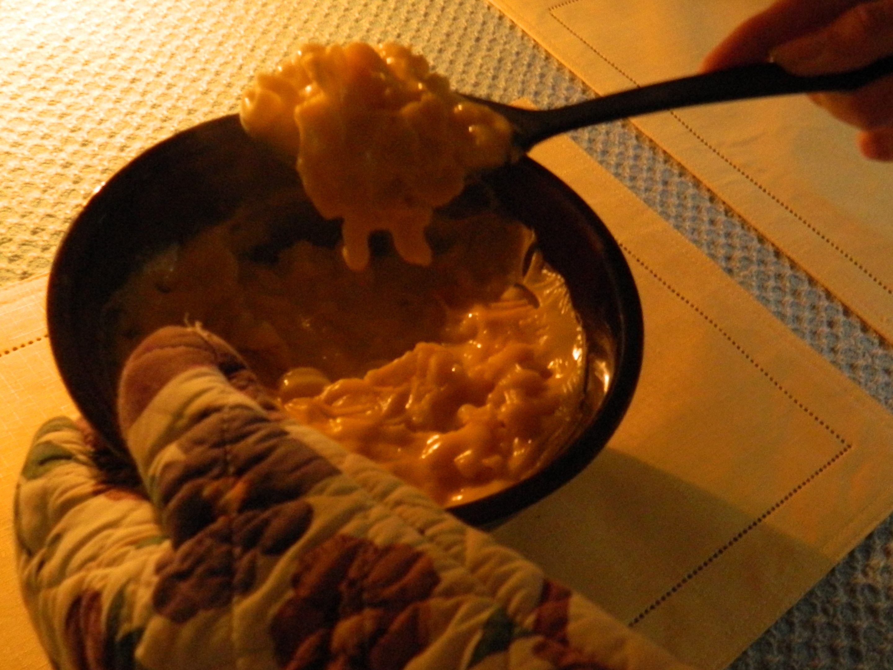 3 tablespoons melted margarine; 2 tablespoons cornstarch (flour can be used if you don’t have cornstarch); 1 and one half cups of milk; 8 ounces Velveeta cheese chopped into small cubes; salt and pepper; 1 cup elbow macaroni.
