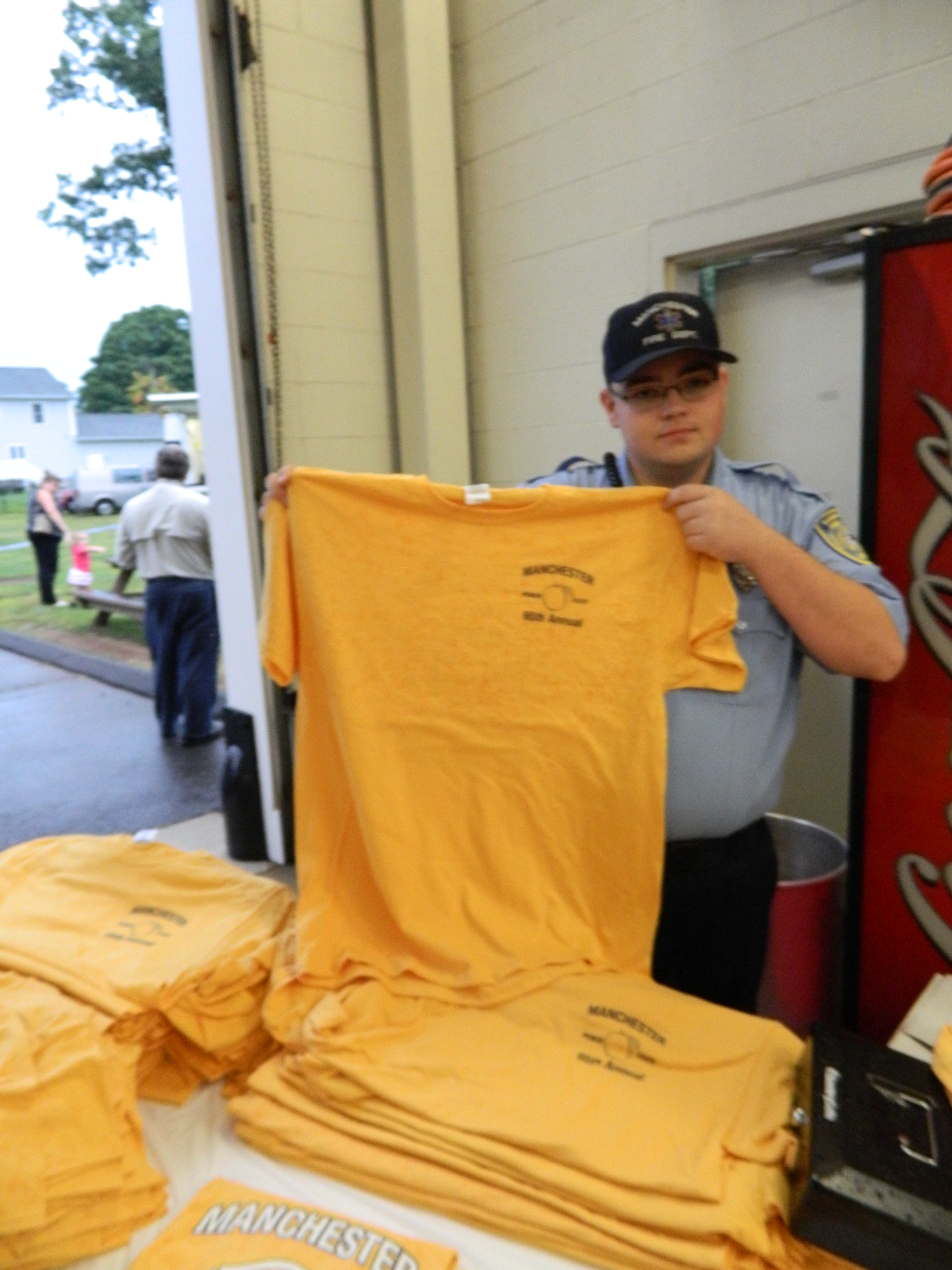 Dean Gates of the 8th Utilities Fire District shows t-shirts that were sold at the 65th Annual Peach Festival.