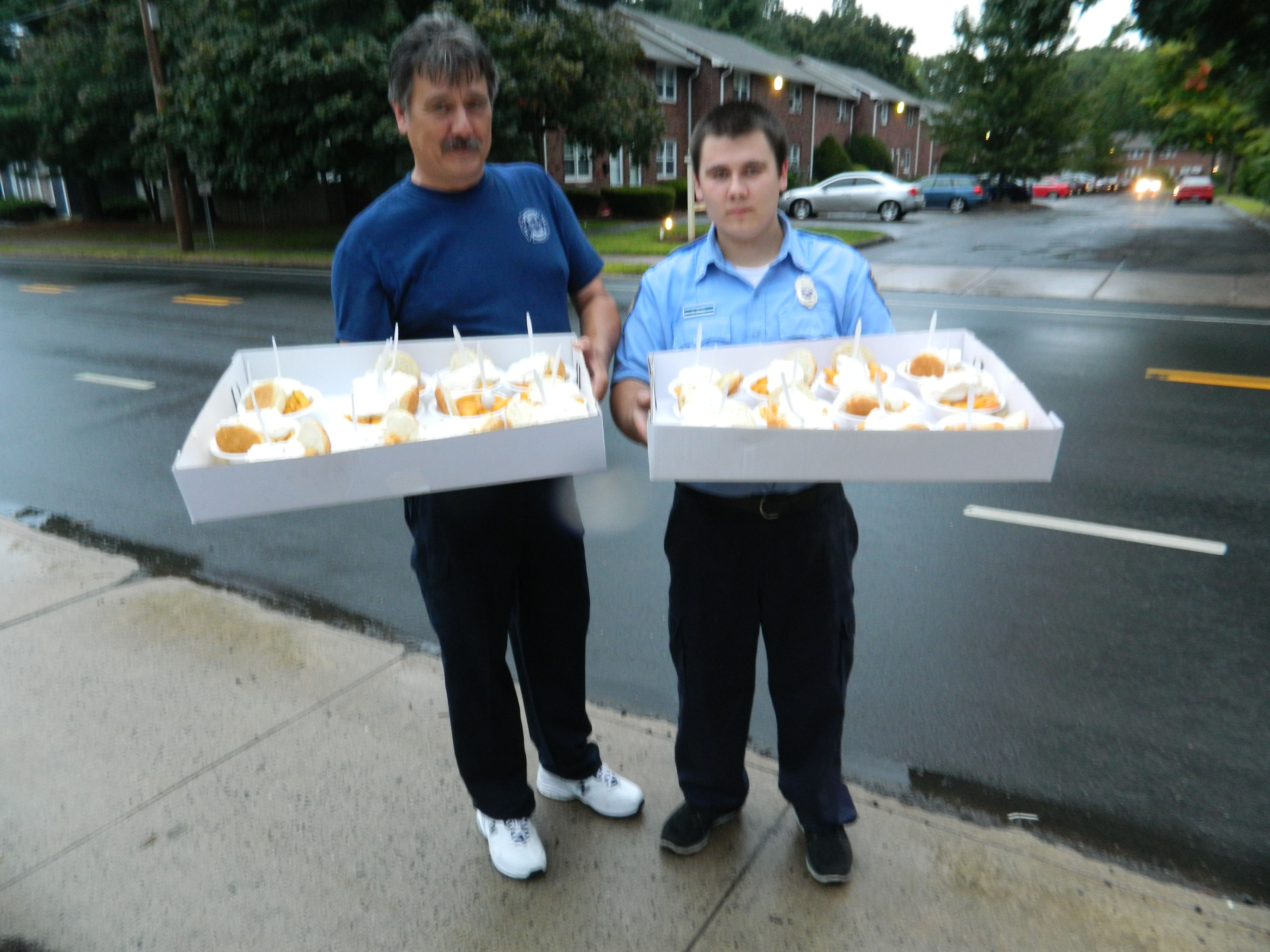 Special delivery! Father and son Stefan and Christopher Zajac, of the 8th Utilities District Fire Department in Manchester, Connecticut, prepare to make a peach shortcake run to local police officers and medics during the 65th Annual Peach Festival held August 22, 2014.