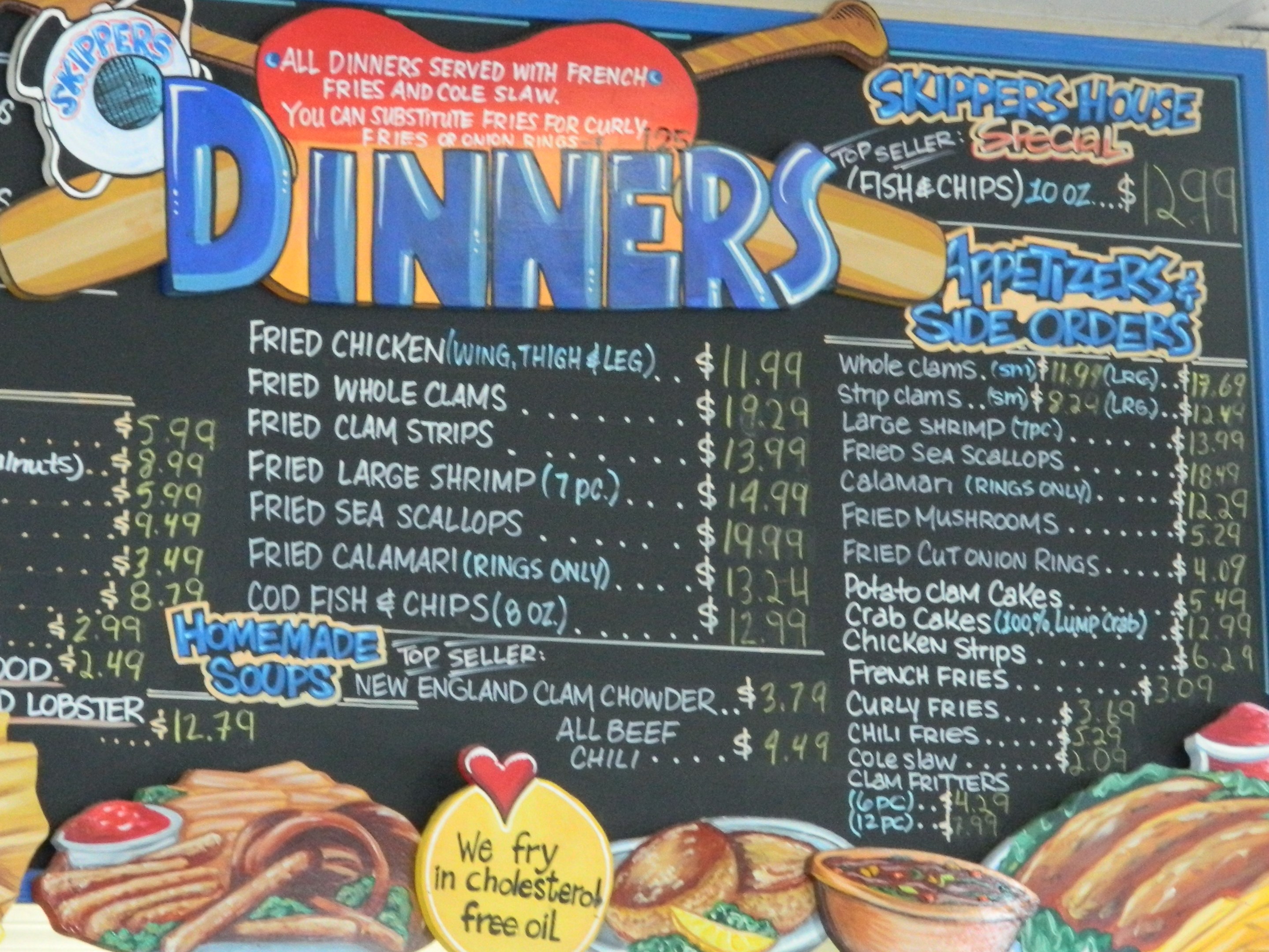 Using “cholesterol free” oil, fried is the focus for seafood dinners here, such as the Fisher Man’s Platter ($23.50 with whole clams/ $22.50 with strip clams) shrimp, scallops and fish, sea scallops ($19.99) calamari rings ($13.24) and Skipper’s House Special Fish & Chips ($12.99). “Hand battered every time”, they are all served with french fries and “homemade” coleslaw – curly fries or onion rings can be substituted for an extra $1.50. As well, they offer a fried chicken wing, thigh leg dinner ($11.99).