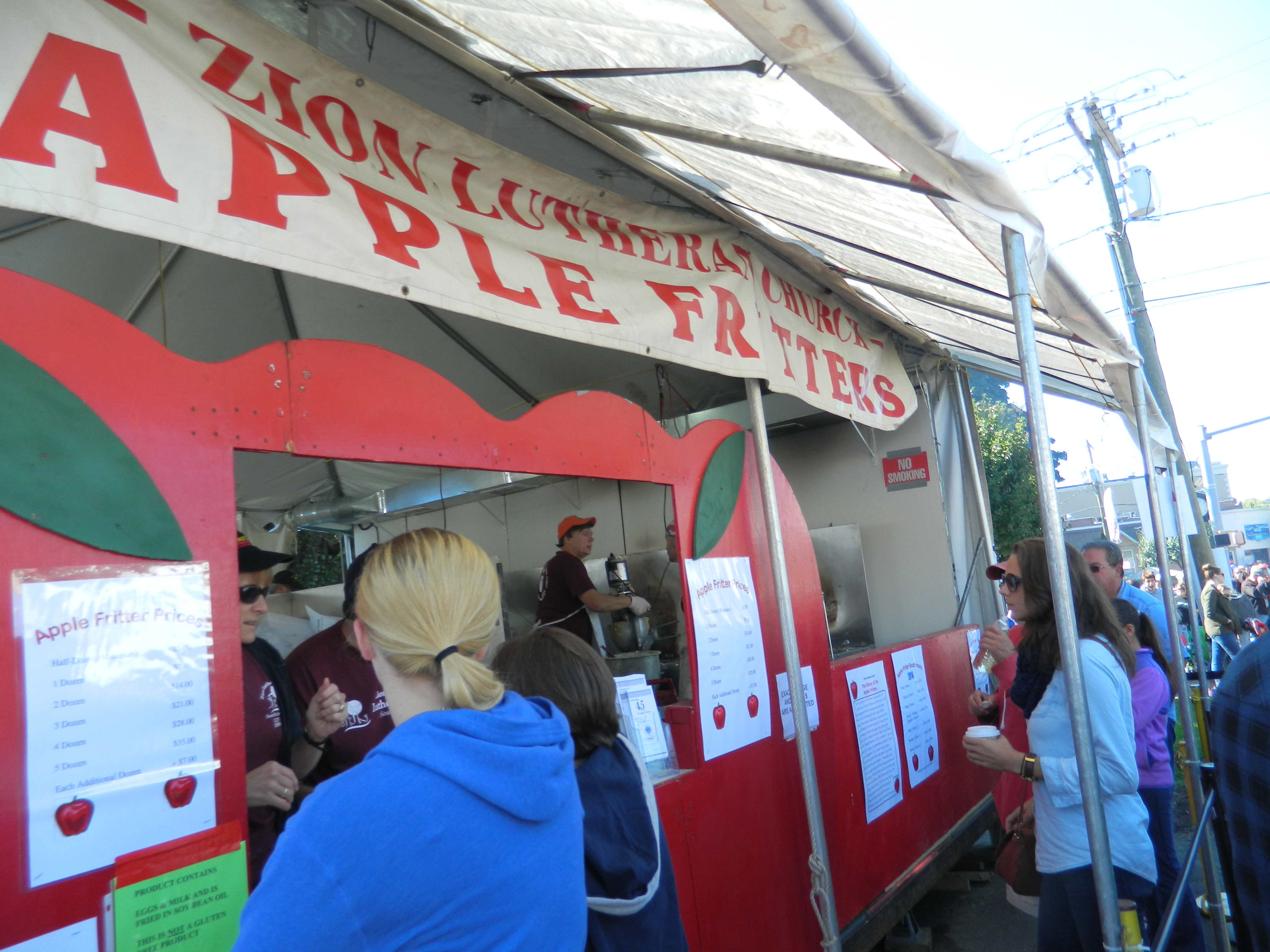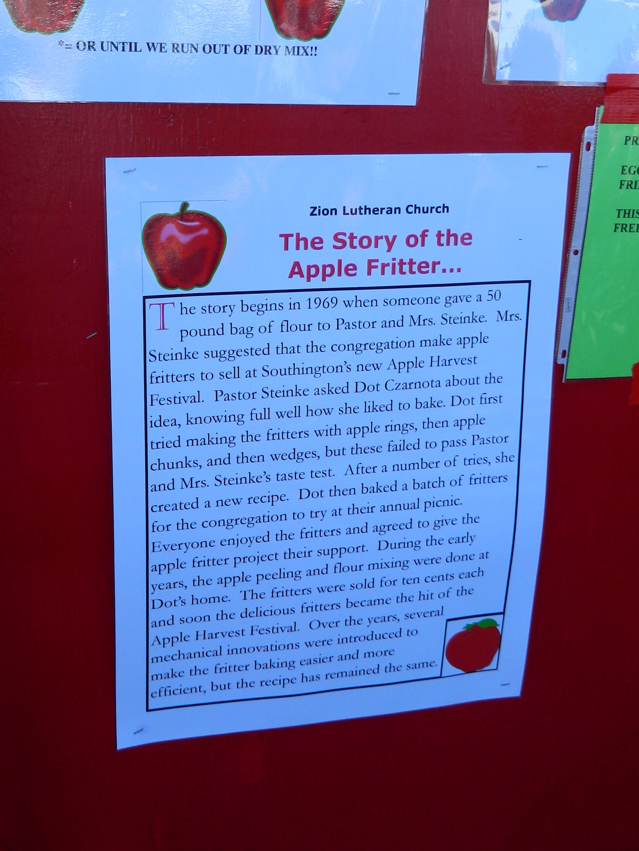 Apple Fritters were obviously a big attraction at the Apple Harvest Festival in Southington, Connecticut. On Sunday, October 5, it looked as if the entire population of the town of Southington and then some had turned out for the event, with a good many of them waiting in a line about two blocks long to scoop up those apple fritters. Now in its 46th year, the fritters have been made by the local Zion Lutheran Church since the fair’s inaugural year. They are so much a part of the fabric of this festival that “The Story of the Apple Fritter” can be found posted on the fritter booth with bountiful credit given to the original cook, Dot Czarnota, and Pastor Steinke’s wife, who suggested the congregation sell apple fritters at “Southington’s New Apple Harvest Festival” back in 1969.