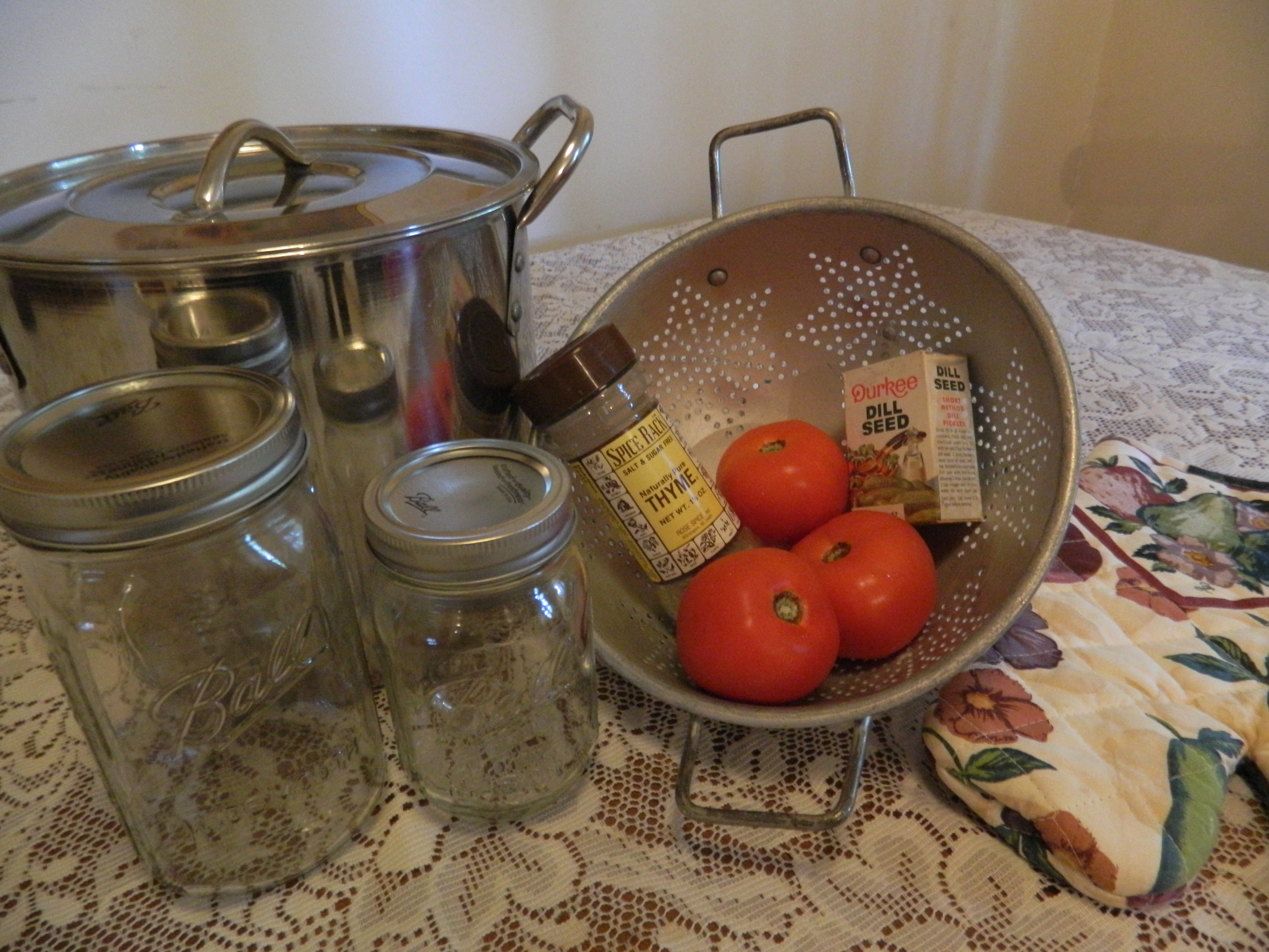 Sterilize preserve jars using boiling water. Wash vegetables in colander; Chop tomatoes and peppers, peel and chop onions; Combine in a bowl then hand grind; add white apple vinegar then season to taste using thyme, dill seed, cumin, tumeric, allspice and a modicum of salt; Pour into pot and bring to a boil, simmer on medium/low heat for about 1 and one half hours – stir periodically; Allow to cool in pot before spooning into clean, room temperature jars.