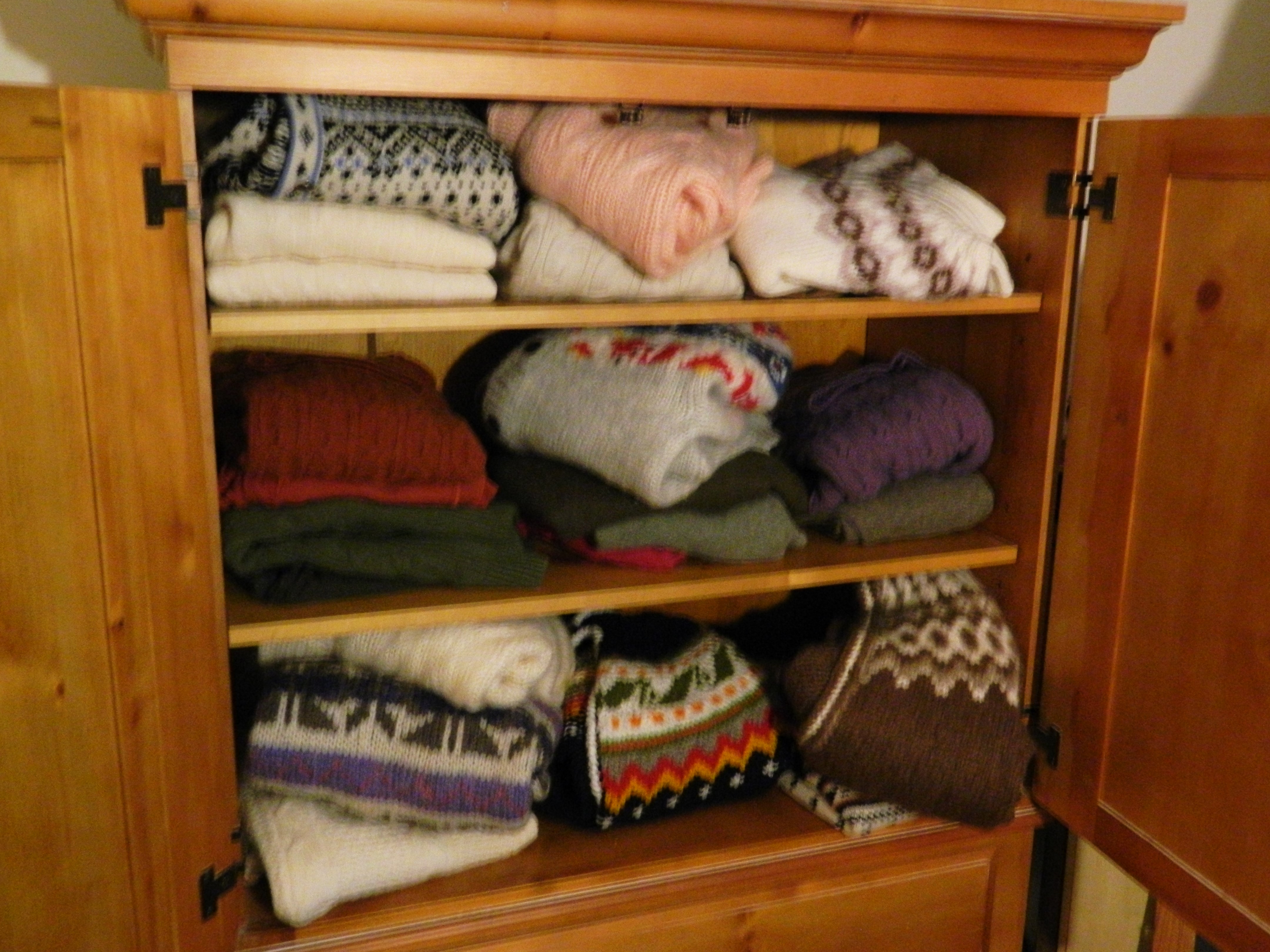 The list goes on. If this sounds frivolous – think again. These are more than mere sweaters. When I open the doors to my armoire I see glimpses of my life, and I wonder where my love affair will lead me next.