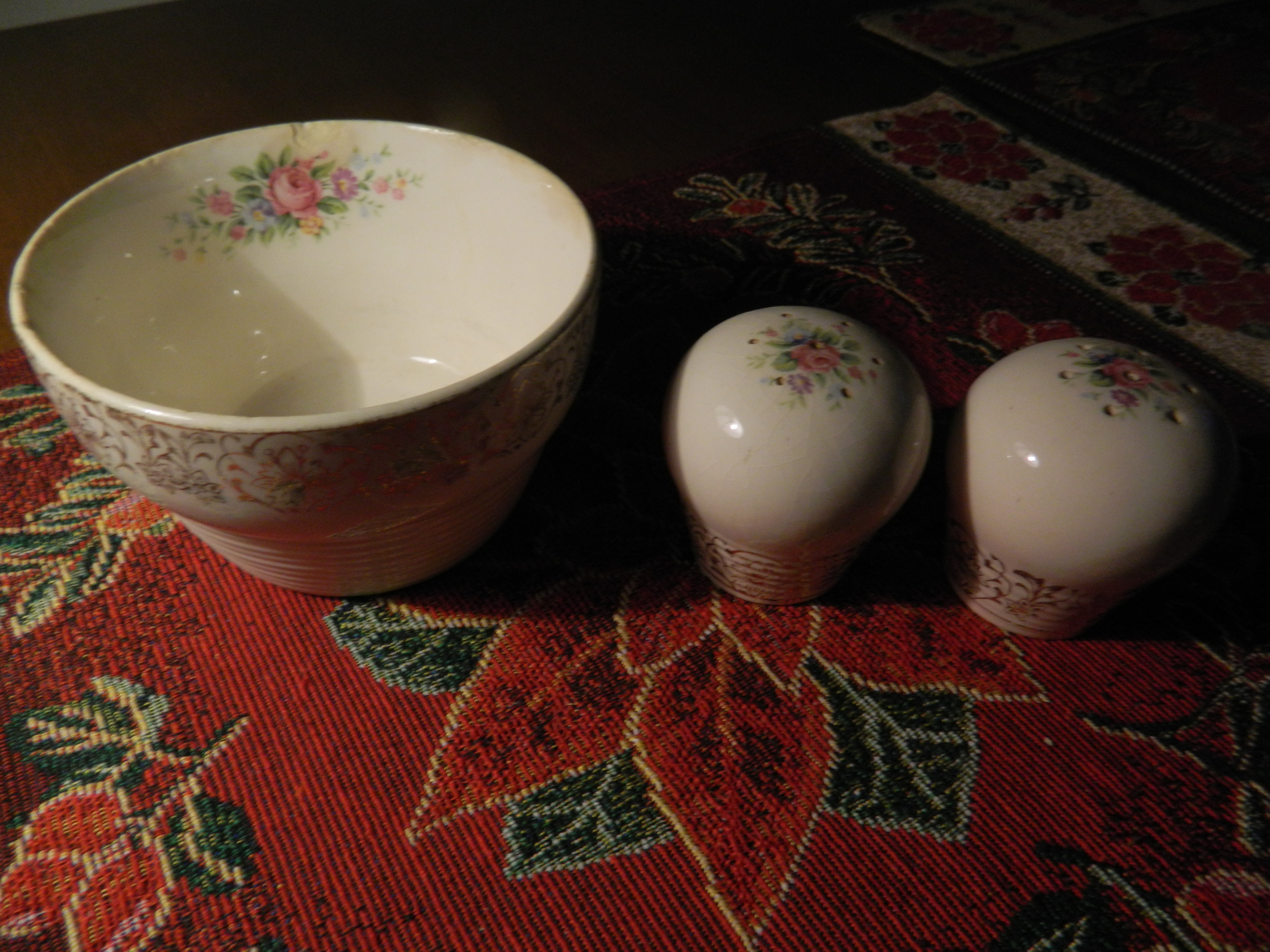 Traditionally, Mom served “Ma’s Baked Bread” on a flower trimmed plate which had belonged to my grandmother. I no longer have the plate but do have a matching bowl and salt and pepper shakers that were part of that set of Ma’s dishes. I used to love having a thick slice of Mom’s homemade bread the morning after Christmas, toasted then topped with a dollop of peanut butter. My sister Candy reminded me that Mom would also take rounded portions of Ma’s bread dough, flatten them with a spatula in the skillet and grill them – creating fried dough, which Mom called “dobbies”.