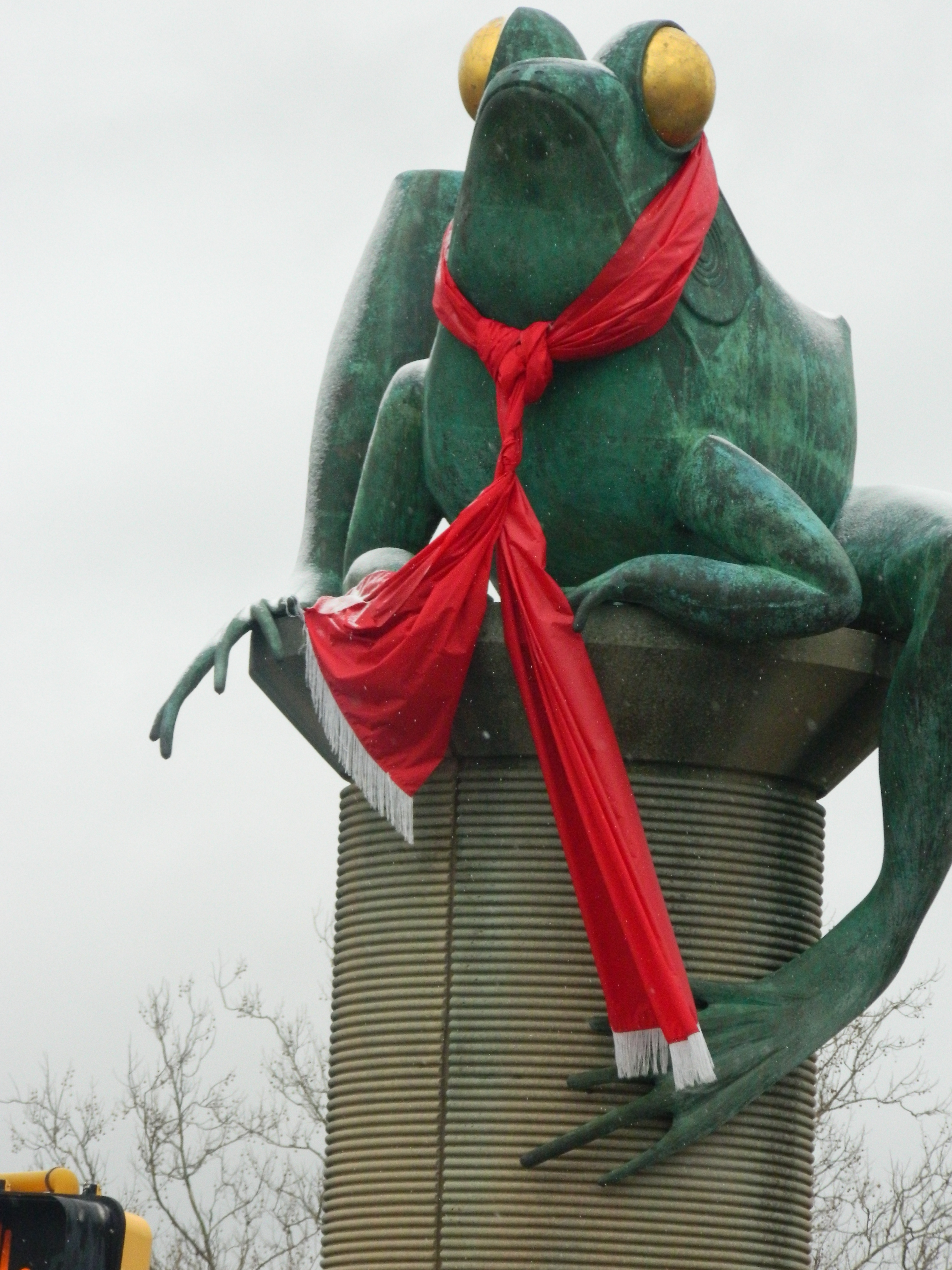 On a snowy morning I drove out to Windham, Connecticut to photograph the “Frogs in Scarves” on the “Frog Bridge “. A whimsical sign of the approach of Christmas and one I decided was worth writing about for newsandviewsjb. It was a popular post, especially on Twitter.