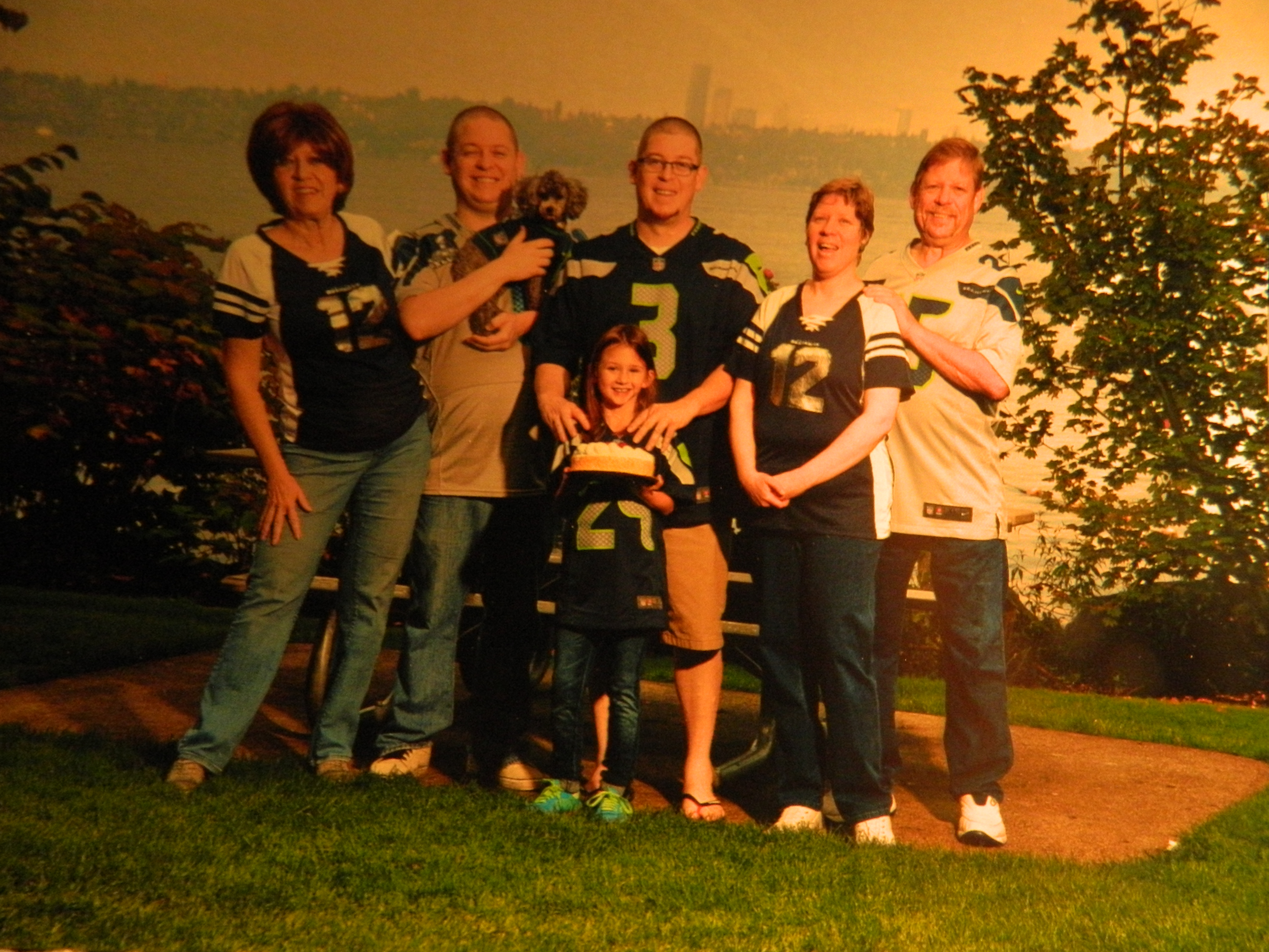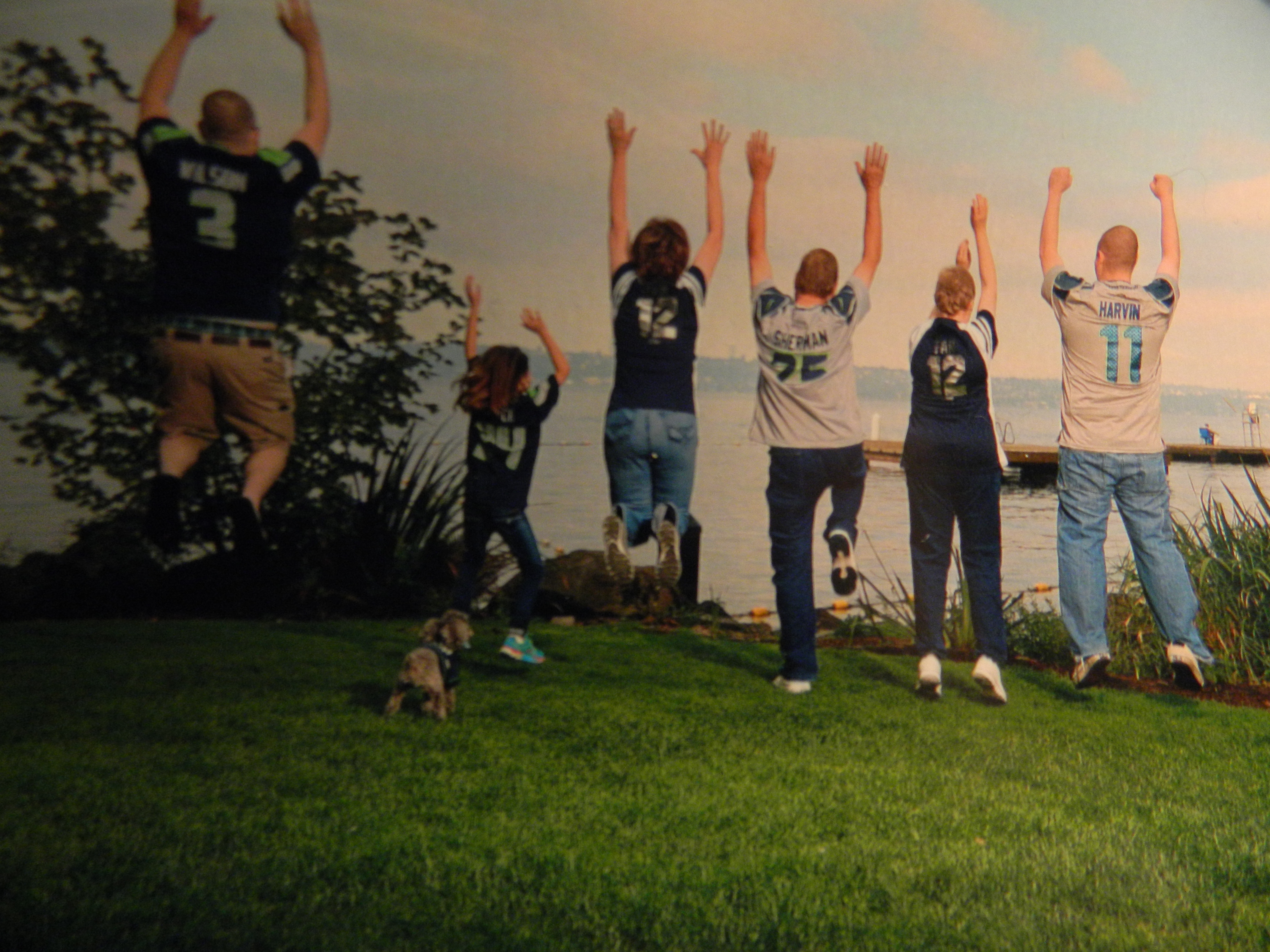 Backing the Seahawks are Deb, Wayne, Katie, Nate, Dan, Sofia and their teacup poodle Scooby-Doo. In the Patriot’s corner are Mike, Melane, their German Shepard Polaris, Dixie, Candy and I.
