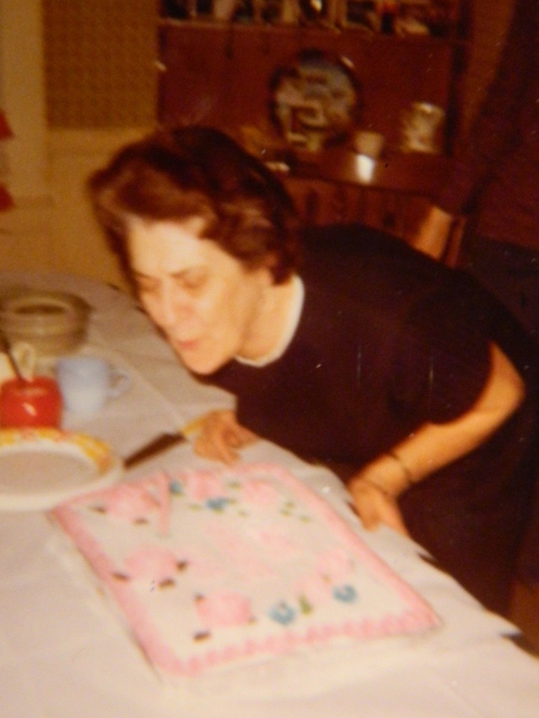 Mom/Nana blowing out the candles on her birthday cake, circa the 1970s.