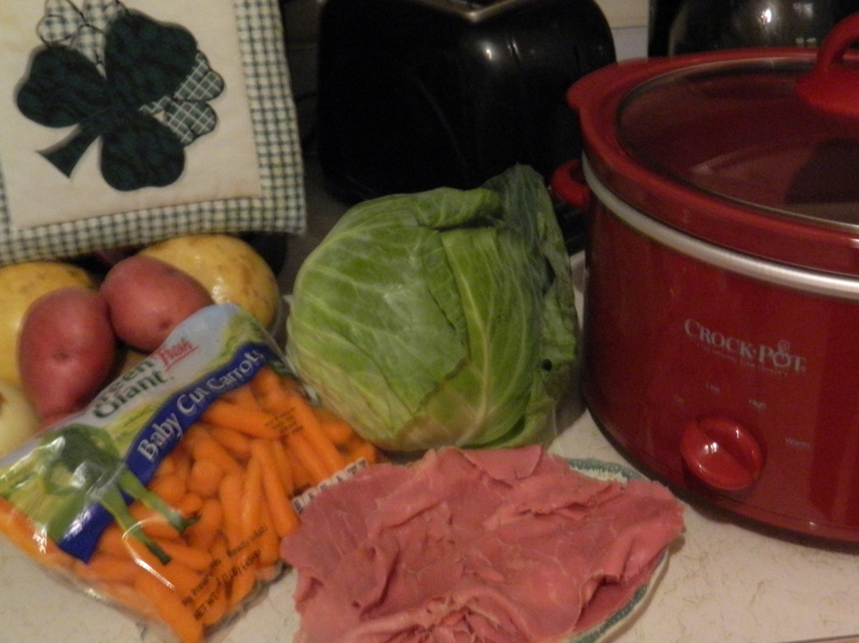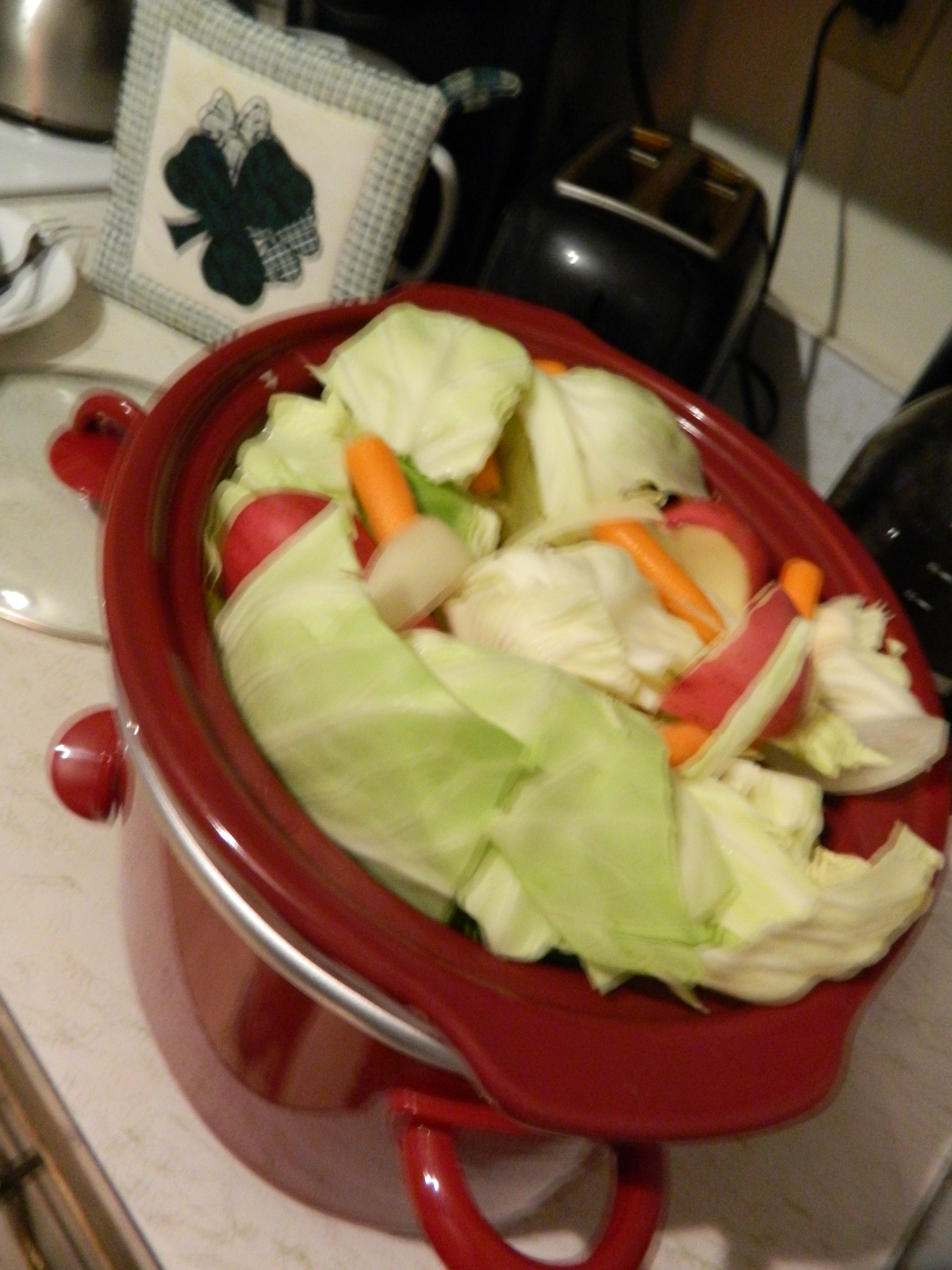 In honor of St. Patrick’s Day 2015, a first time attempt at preparing a traditional, homemade corned beef & cabbage dinner. After searching through on-line recipes that offer oven or slow cooker approaches, the (slow cooker) crockpot has been selected. All the ingredients were purchased at Big Y World Class Supermarket yesterday – small red potatoes, a head of cabbage, baby carrots, turnip, a small onion and a few thin slices of corned beef from the deli rather than a brisket.