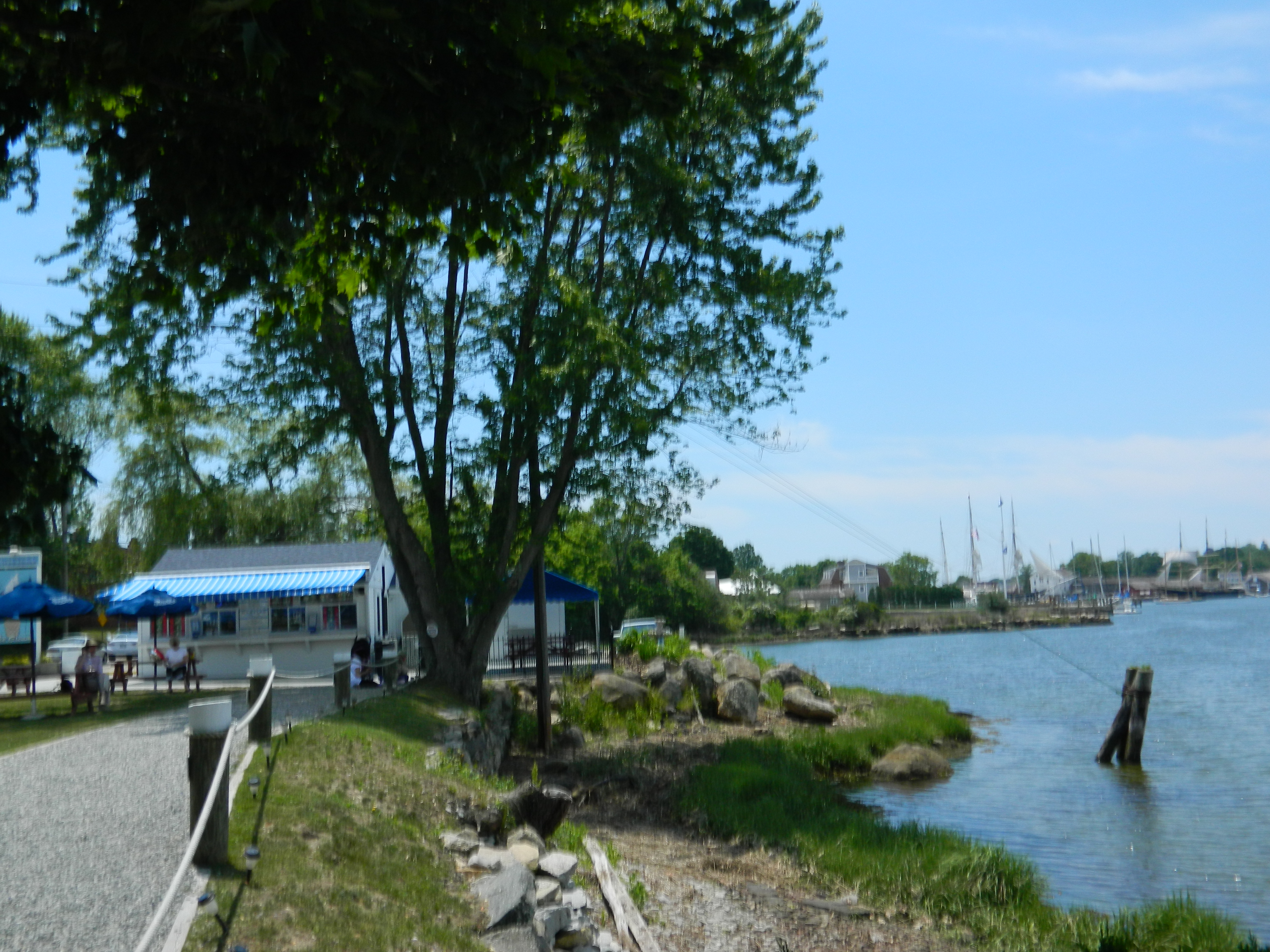 Sea View’s picnic area was very clean and tidy with benches available either under a shaded pavilion or in the sun; also available were round tables with umbrellas. All are situated beside the Mystic River with a glorious view of sailing vessels moored at the nearby seaport.
