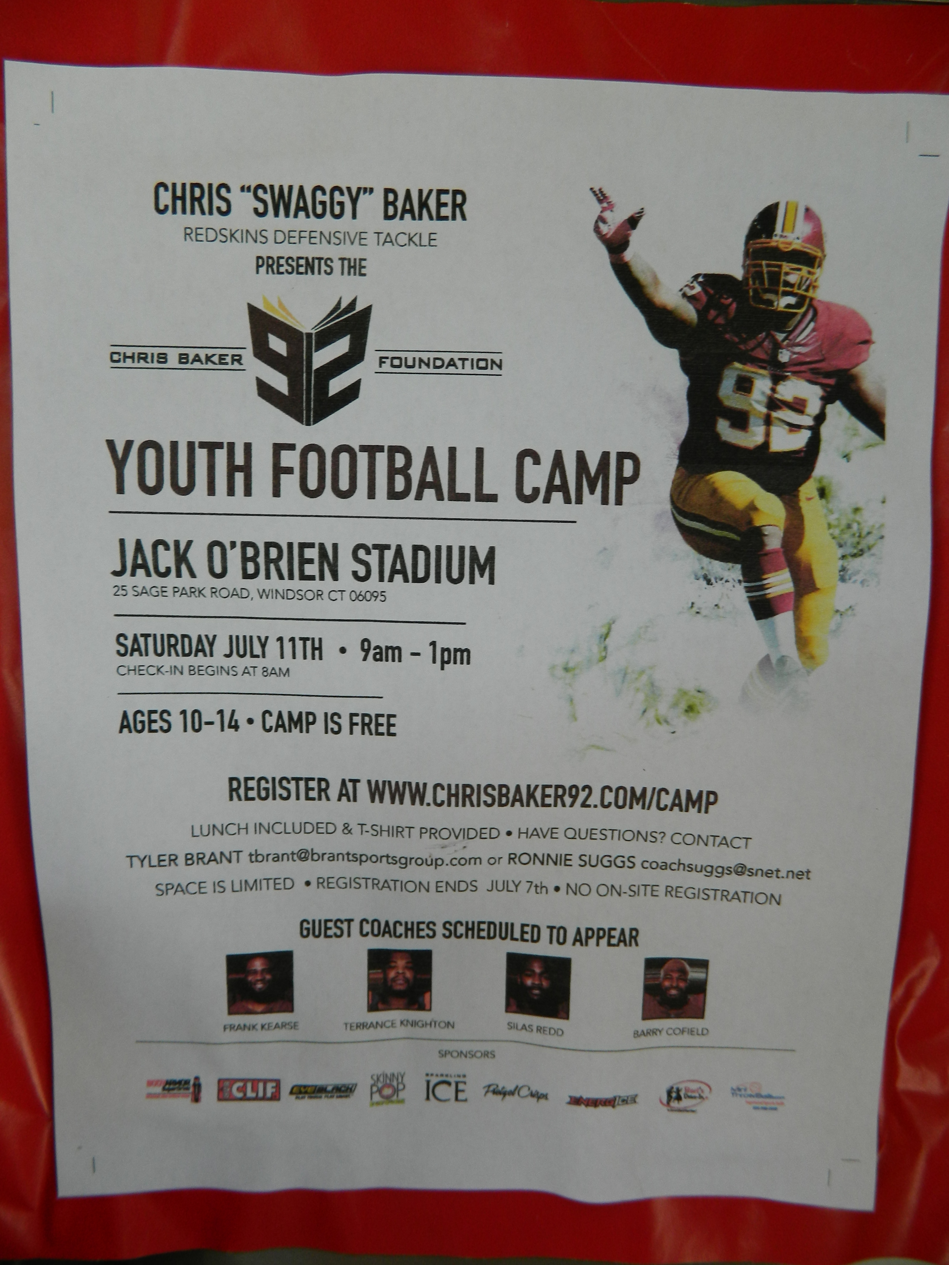 Baker, a defensive lineman for the Washington Redskins, #92, returned to Windsor and to Bart’s July 10, for a second year after launching the non-profit Chris Baker 92 Foundation in 2014 – http://www.chrisbaker92.com. He launched his foundation with a mission to “engage and mentor boys and girls” in a literacy program, football camps and a mentorship program.