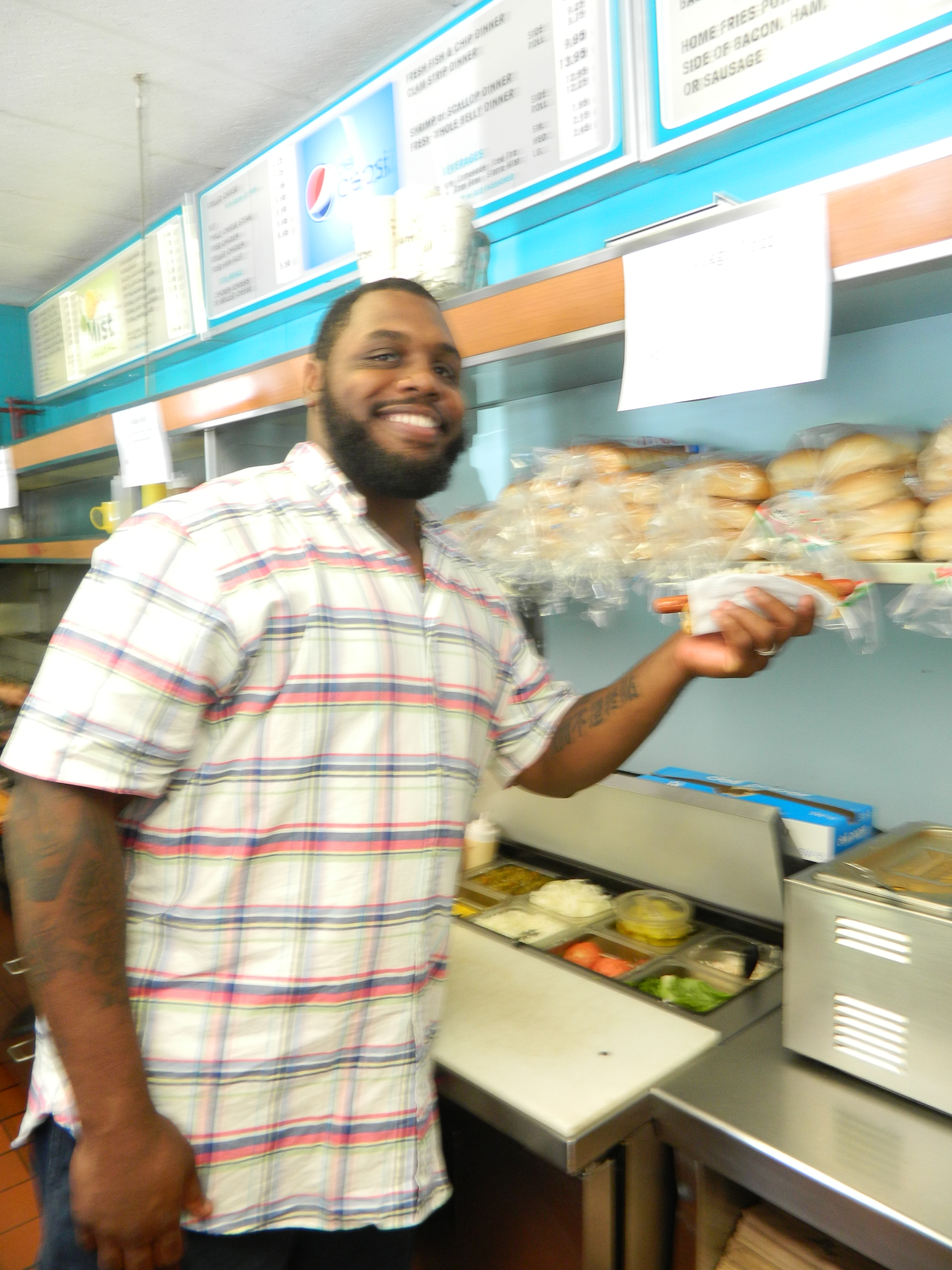 Chris Baker of the NFL Washington Redskins joins the crew at Bart’s Drive-In in Windsor, Connecticut July 10, 2015.