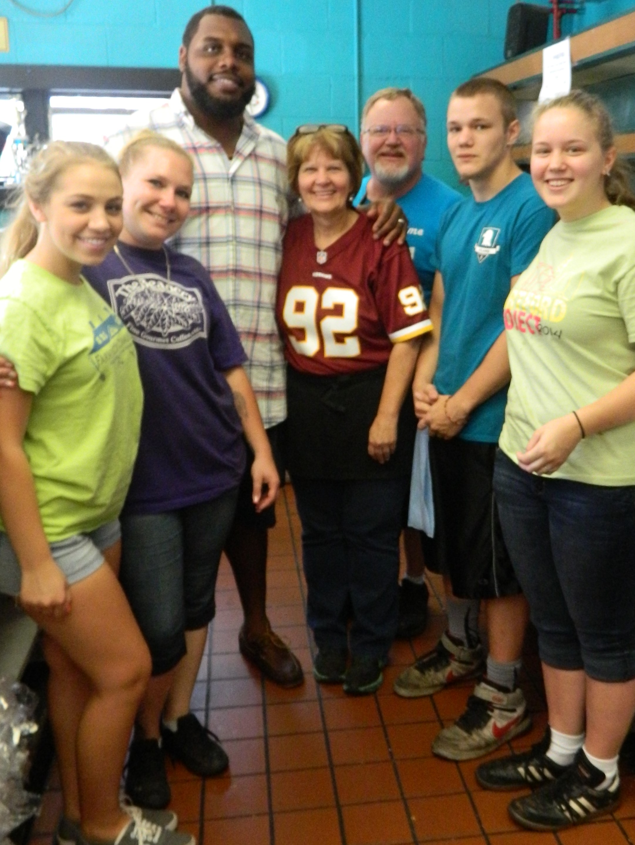 Carol Engelmann, owner of The Beanery and a loyal Redskins fan shown with #92 himself defensive lineman Chris Baker.