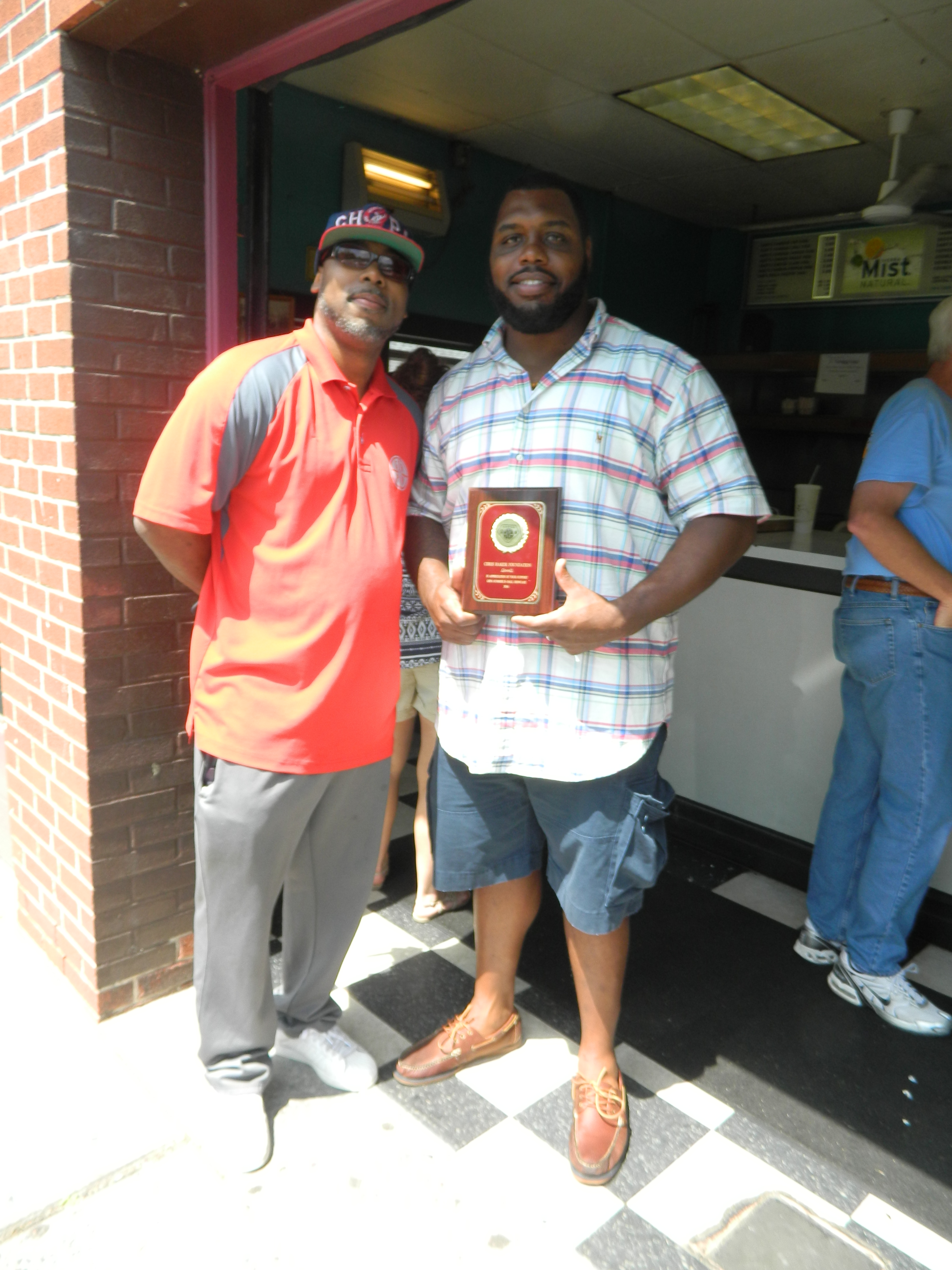 NFL’s Chris Baker and Windsor, Connecticut Mayor Donald Trinks, owner and general manager of Bart’s Dive-In.
