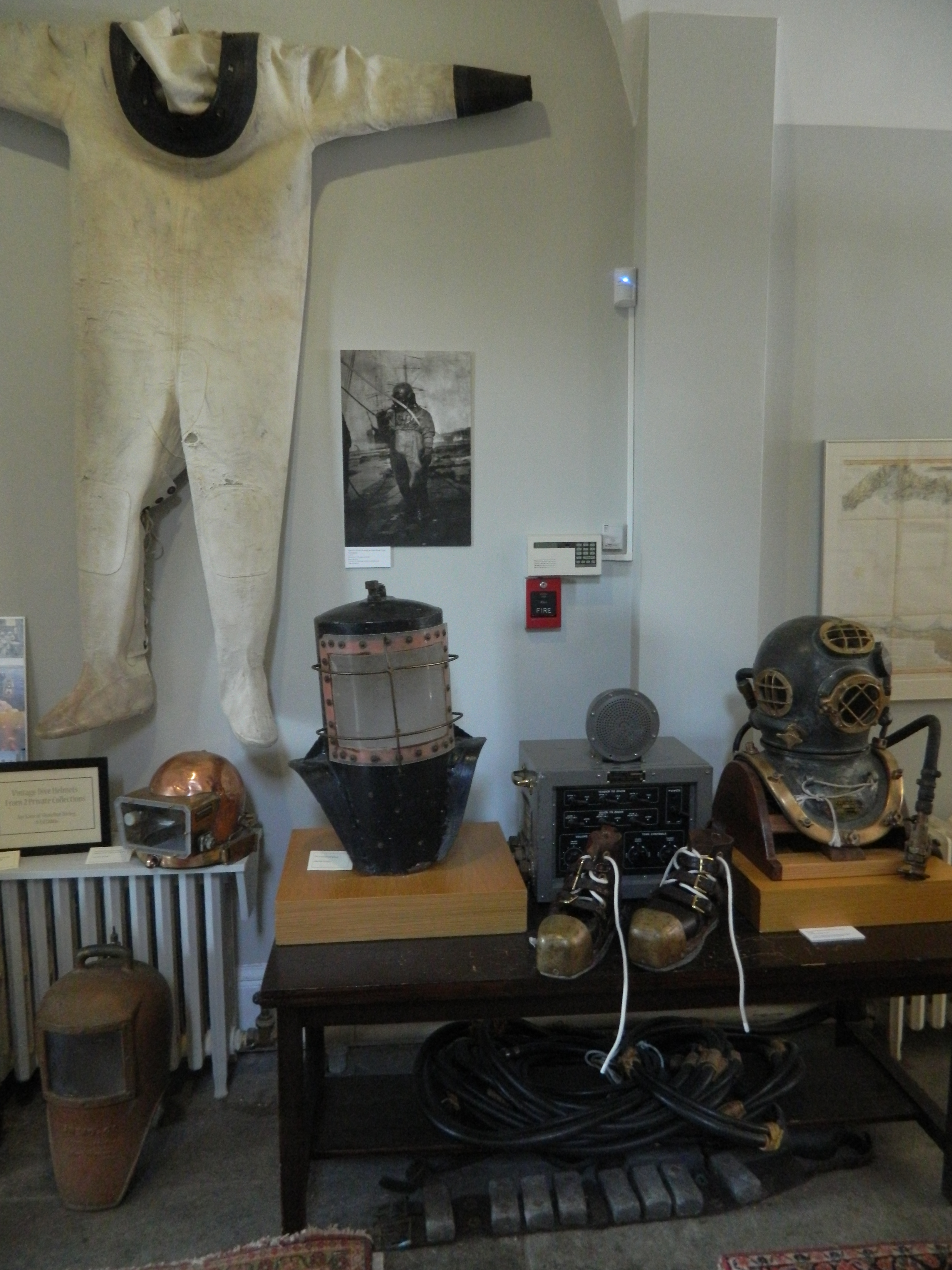 Both fascinating and at the same time eerie was a display of early, underwater diving gear that resembles something one might see in a scary movie about exploration of creatures in the deep, dark and unknown oceans. It is amazing to ponder the courage of those early divers who used such rudimentary equipment.