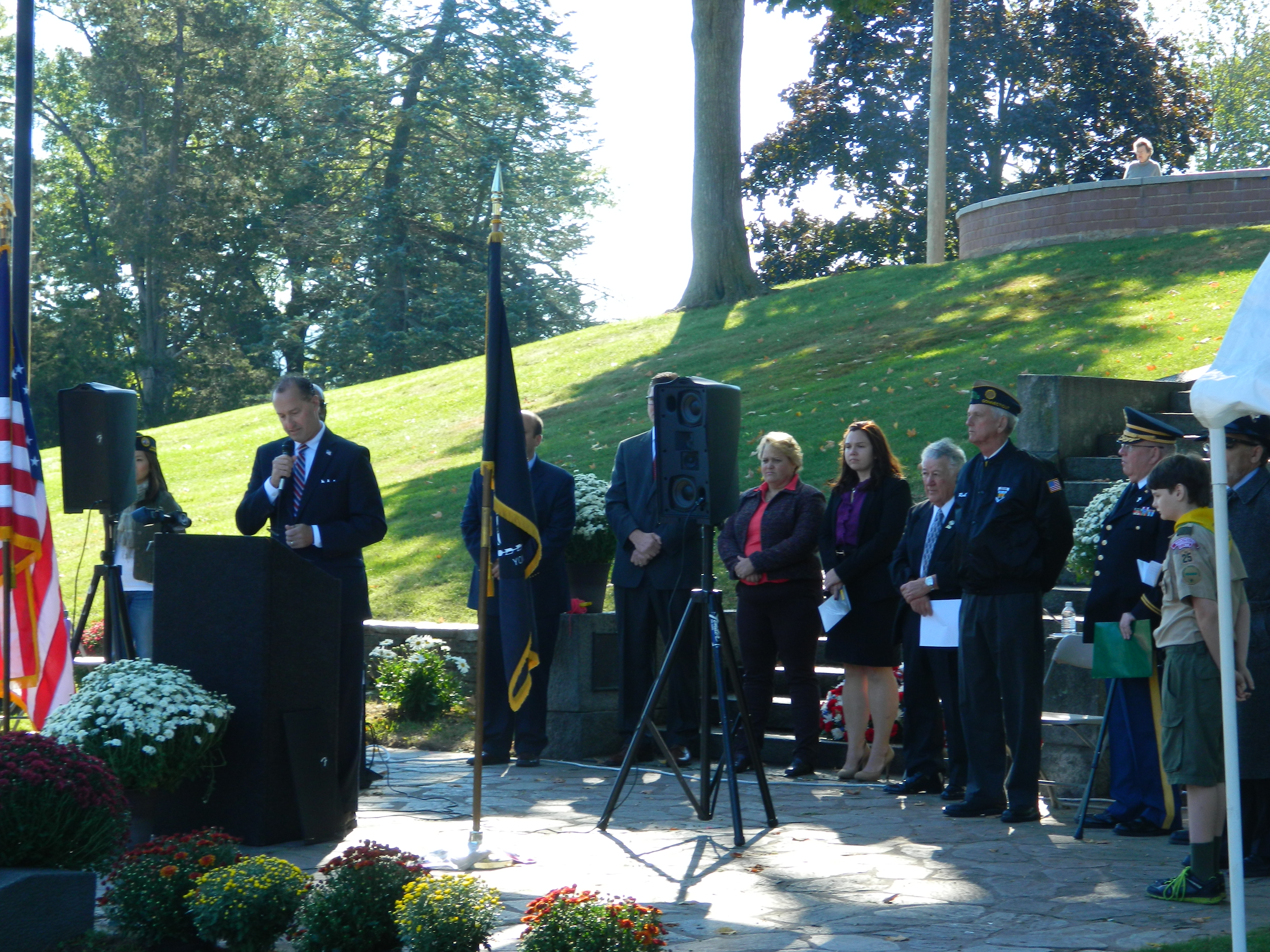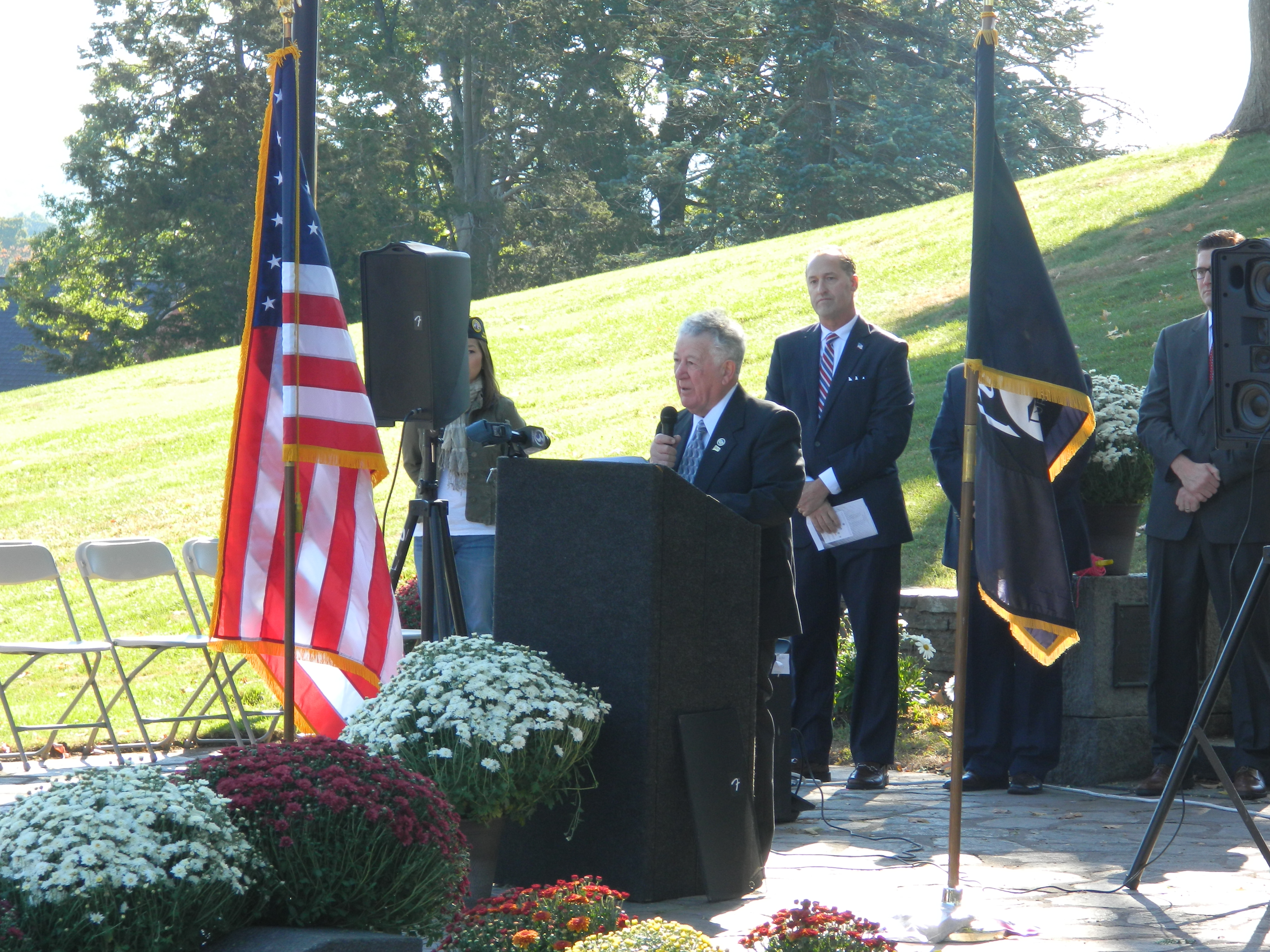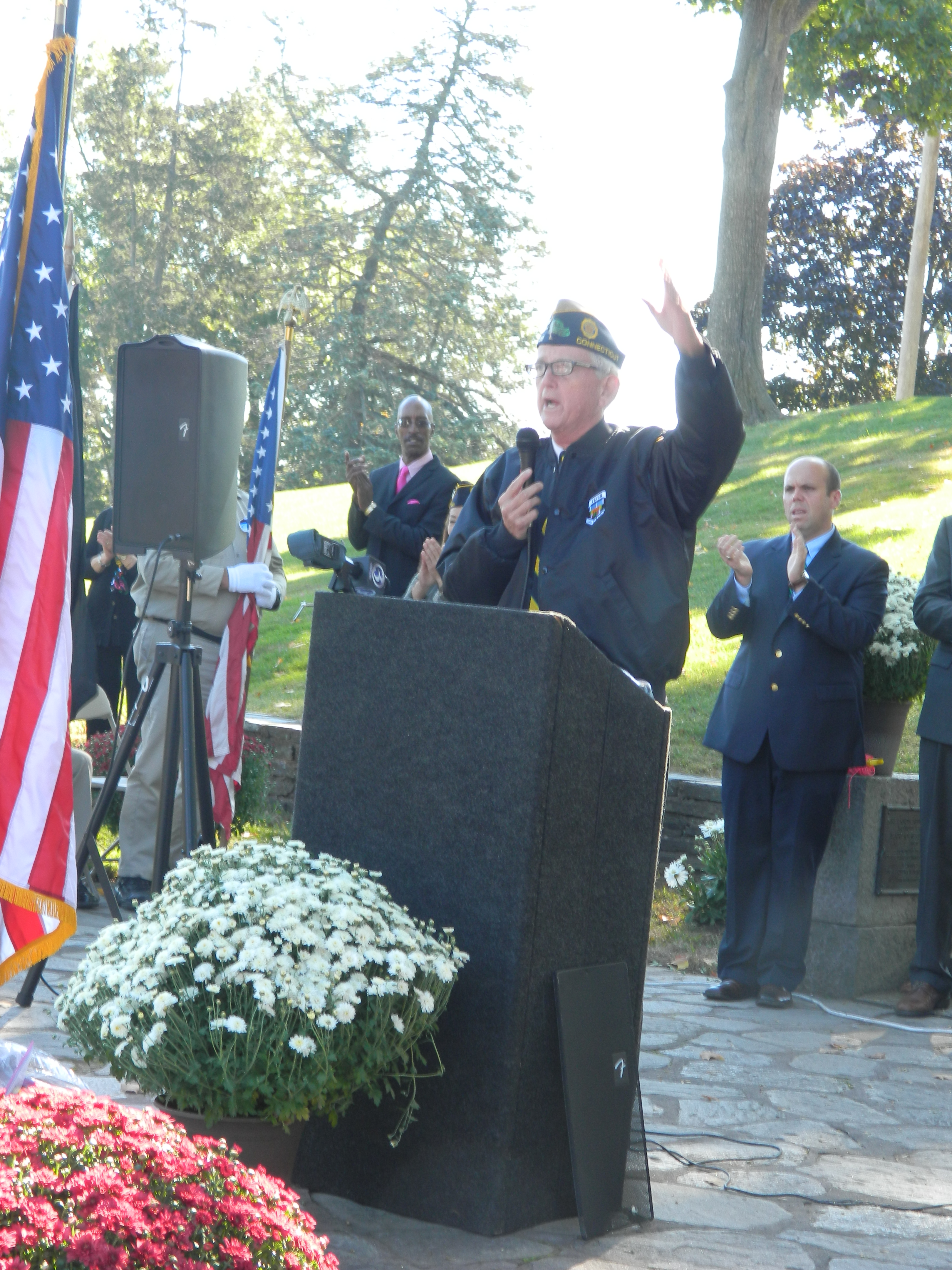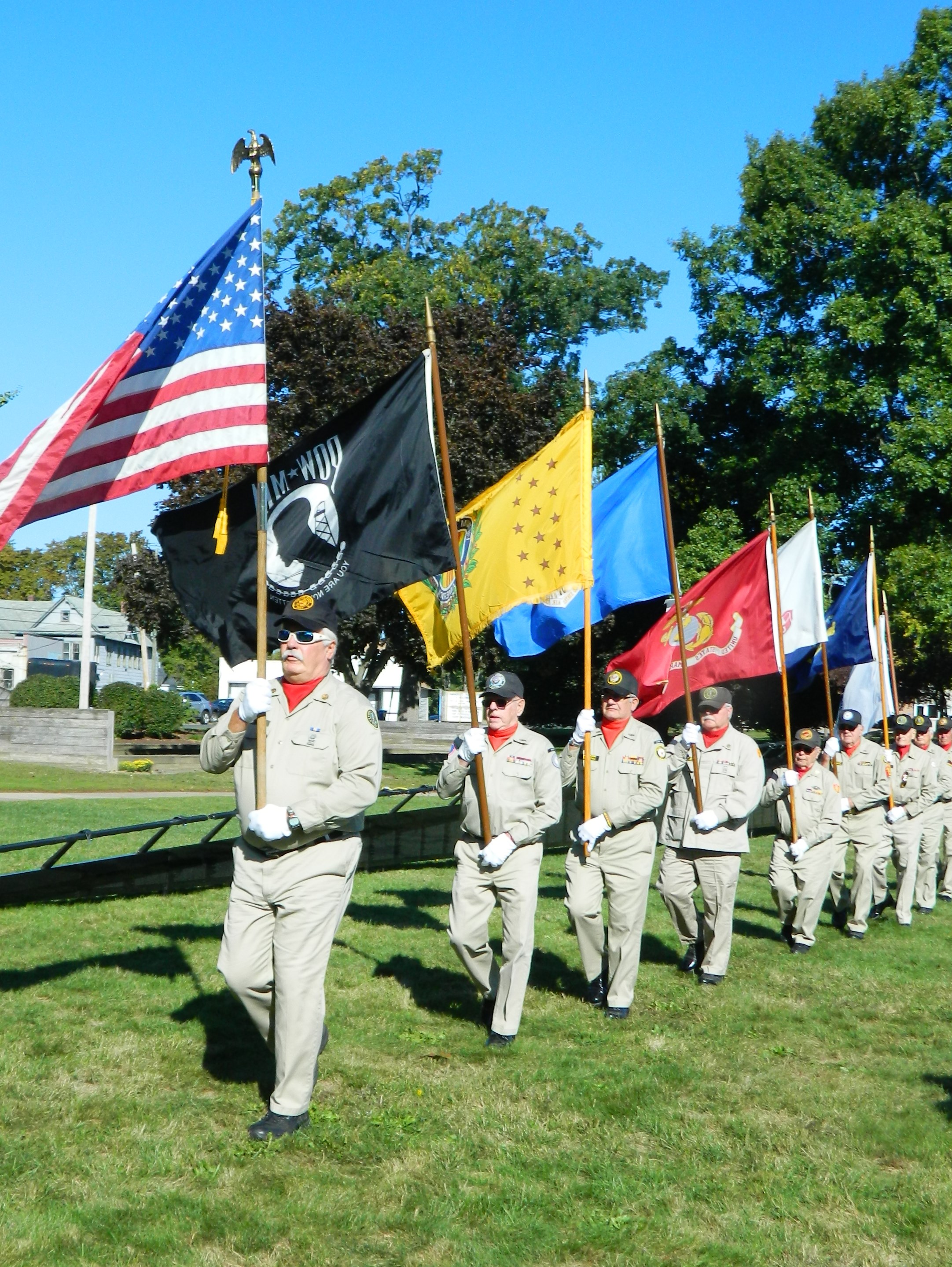 Nate Agnostinelli acted as Master of Ceremonies and Sandra Lee sang the National Anthem. A member of Boy Scout Troop #25, the same troop that one of Manchester’s fallen in Vietnam had been part of, led the Pledge of Allegiance. As well, the Manchester High School Roundtable Singers performed “America the Beautiful” and the MHS Band and orchestra performed. The Antique Color Guard presented the flags.