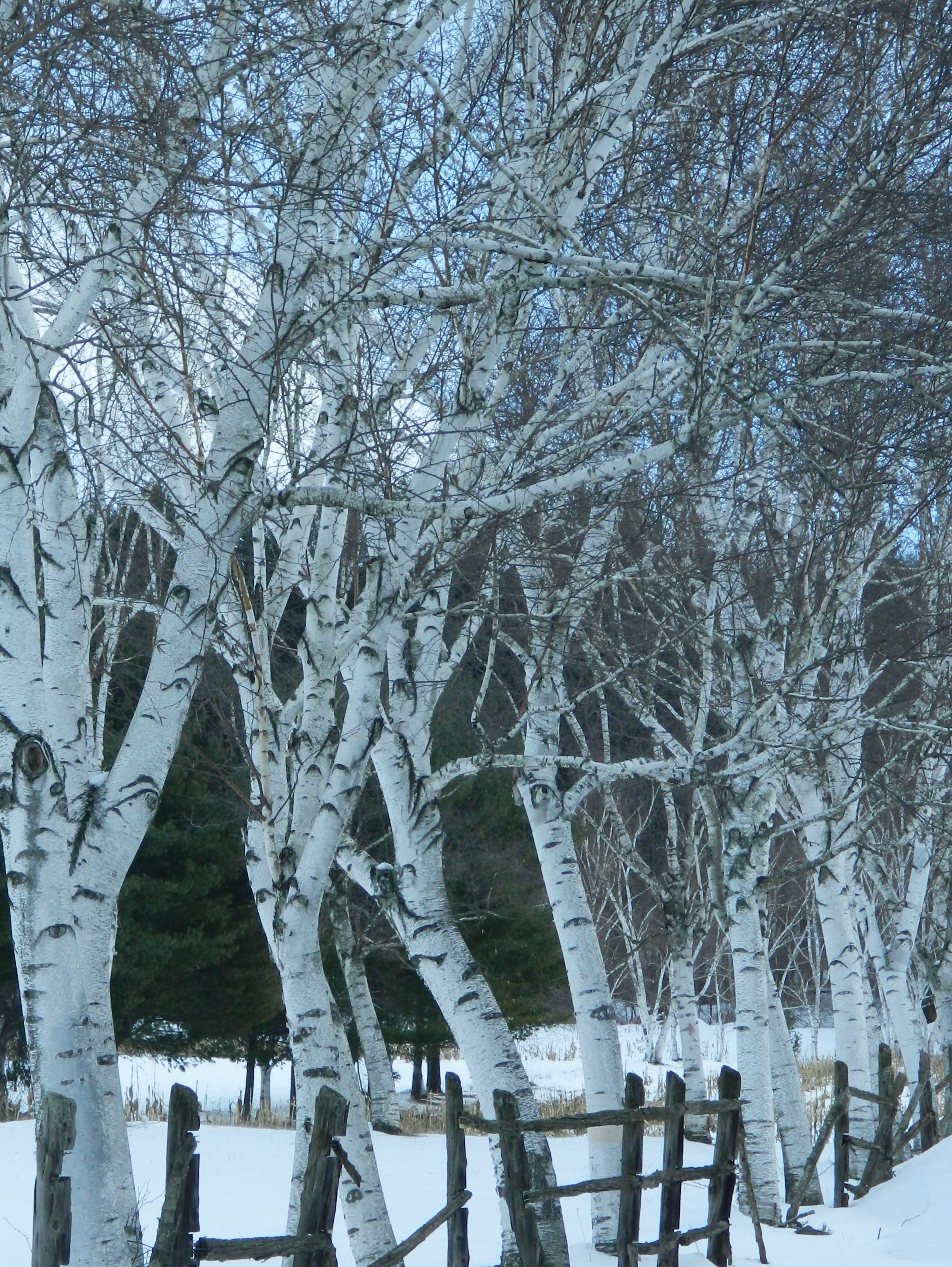 White Birch trees against a backdrop of snow stand tall on Buckland Road in Manchester, CT. amid a wind chill warning.