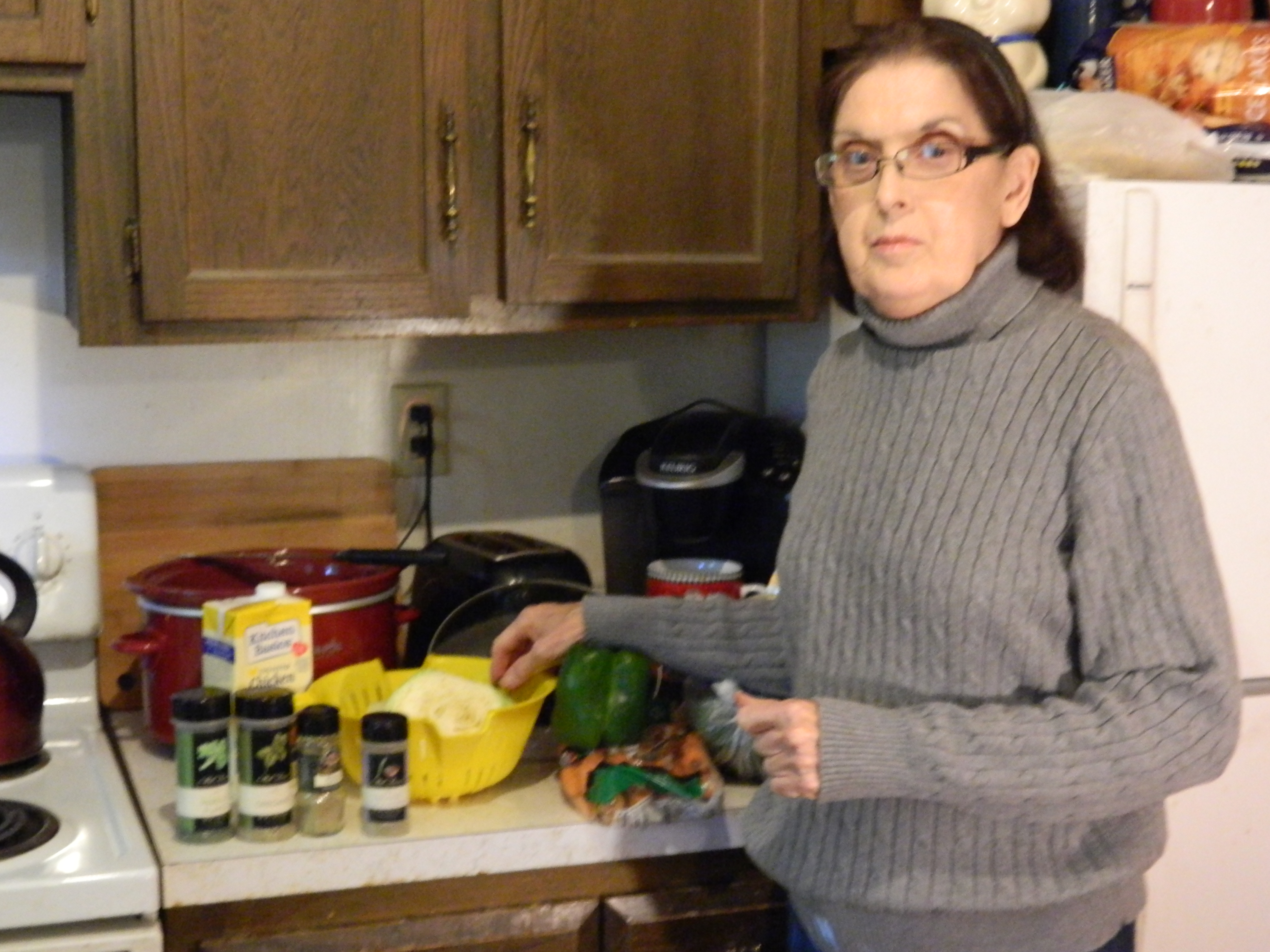 She found Swanson’s no-salt broth at the Stop & Shop supermarket, then picked out fresh cabbage, carrots, zucchini, yellow squash, celery, broccoli, onions, and green pepper. From there it was a matter of peeling and chopping. Homemade soup can pretty much be flavored with whatever seasonings are desired. Candy chose pepper, oregano, parsley and thyme, using a light touch with each one. The soup was simmered on high for six hours then reduced to low before serving.