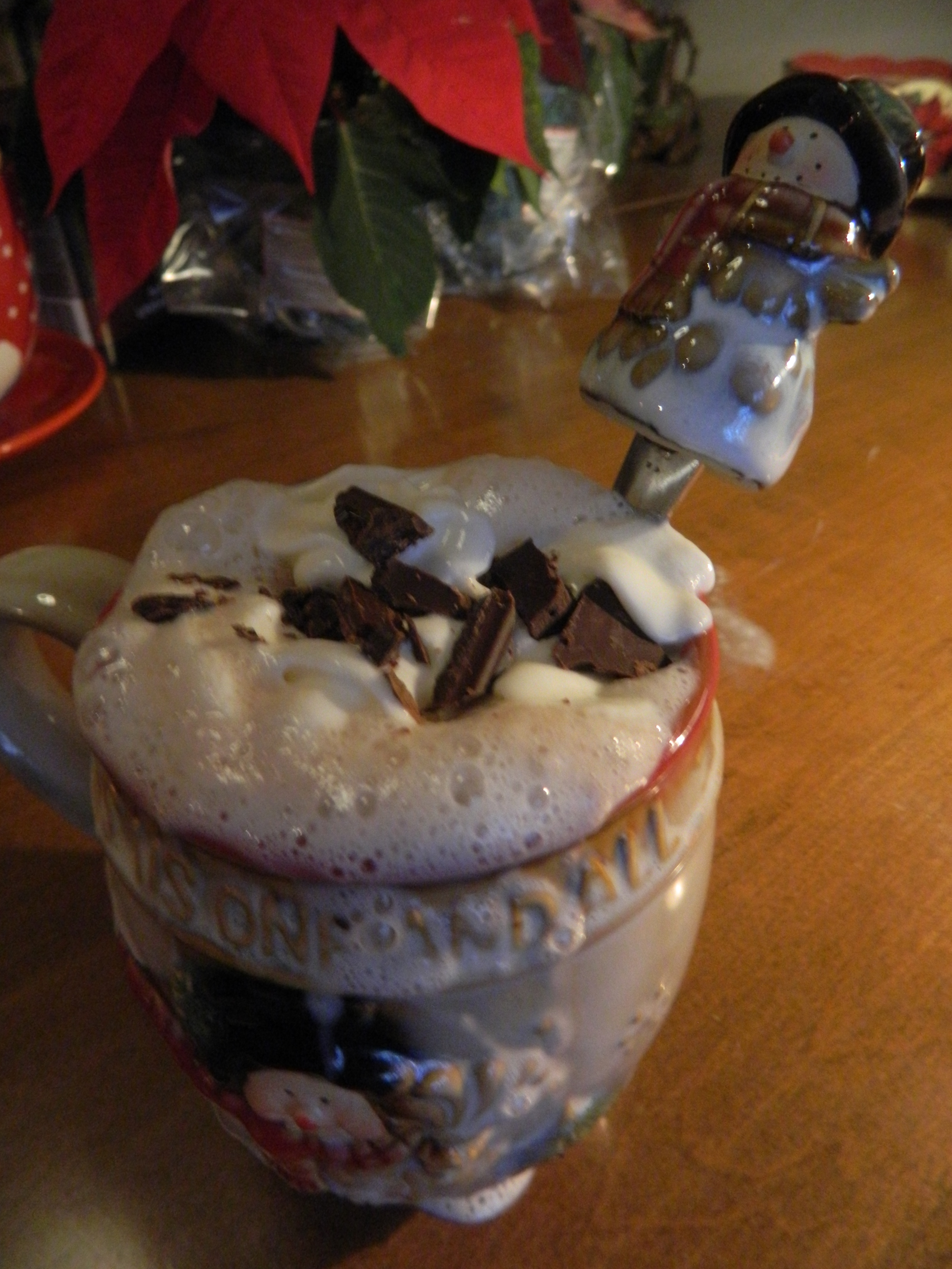 Keeping a close eye on the large sauce pan while heating the milk on the stove, when steam rises I know it’s ready. Be sure not to scorch the milk because that will alter the flavor. Stir continuously while gradually pouring the heated milk into a mug.