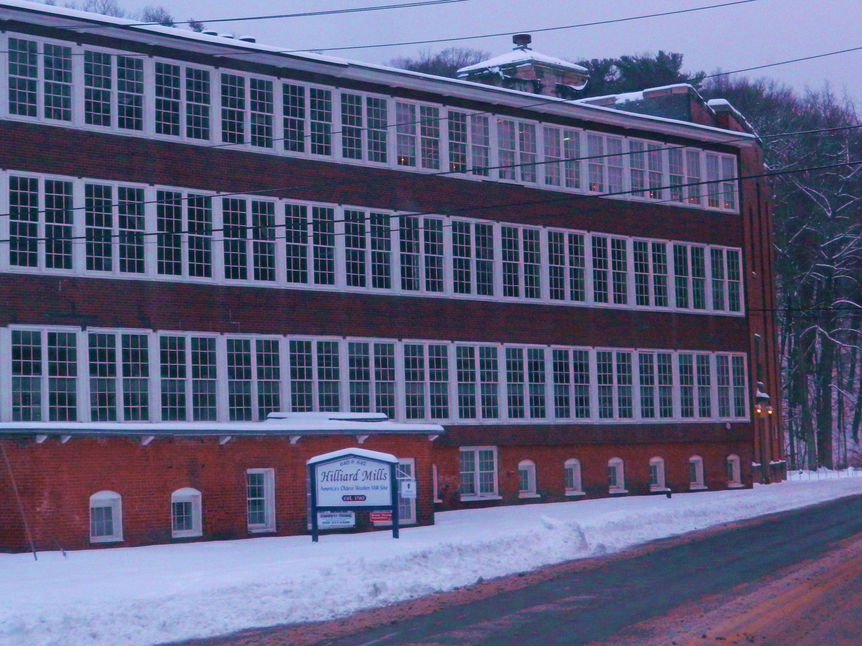 The Hilliard Mills opened in 2006 as part of an ongoing effort in New England to repurpose once vibrant factories. The goal as stated on their website, is “to preserve one of Connecticut’s finest architectural and historical treasures.” According to a history of the site, circa 1780 it housed a woolen factory belonging to American industrialist Aaron Buckland – a name familiar to those who shop at the nearby modern day Buckland Hills Mall. It was at Buckland’s factory that the wool for the suit worn by Washington at his inauguration is said to have been produced, as well as, wool blankets for the soldiers during the War of 1812.