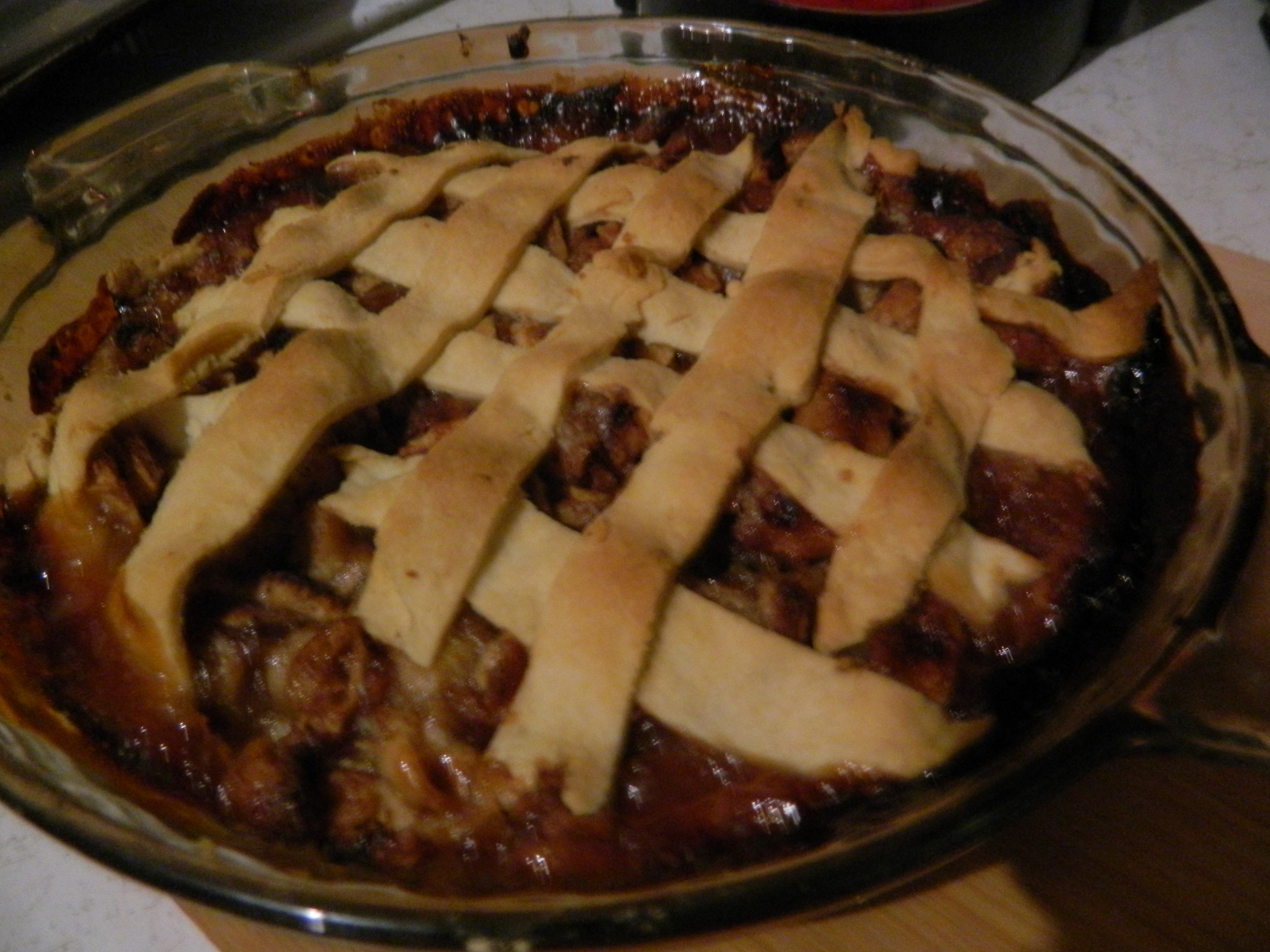 What would an American Christmas holiday be without homemade apple pie. Candy creates beautiful lattice crust apple pies using a Pillsbury recipe: 1 box Pillsbury refrigerated pie crust – 6 cups thinly sliced & peeled six medium apples – three-fourths cup sugar- 2 TBS all-purpose flour – three-fourths tsp ground cinnamon – one eight tsp ground nutmeg – 1 TBS lemon juice – 2 TBS brown sugar – heat oven to 425 degrees F – place pie crust in ungreased 9-inch glass pie plate – press firmly against side and bottom- in large bowl gently mix filling ingredients – spoon into crust-lined pie plate – top with crust and flute sides – bake 40 to 45 minutes or until apples are tender and crust is golden brown – cover edge of crust with 2-3 inch wide strips of foil after the first 15-20 minutes of baking to prevent excessive browning. Cool on cooling rack at least two hours before serving.