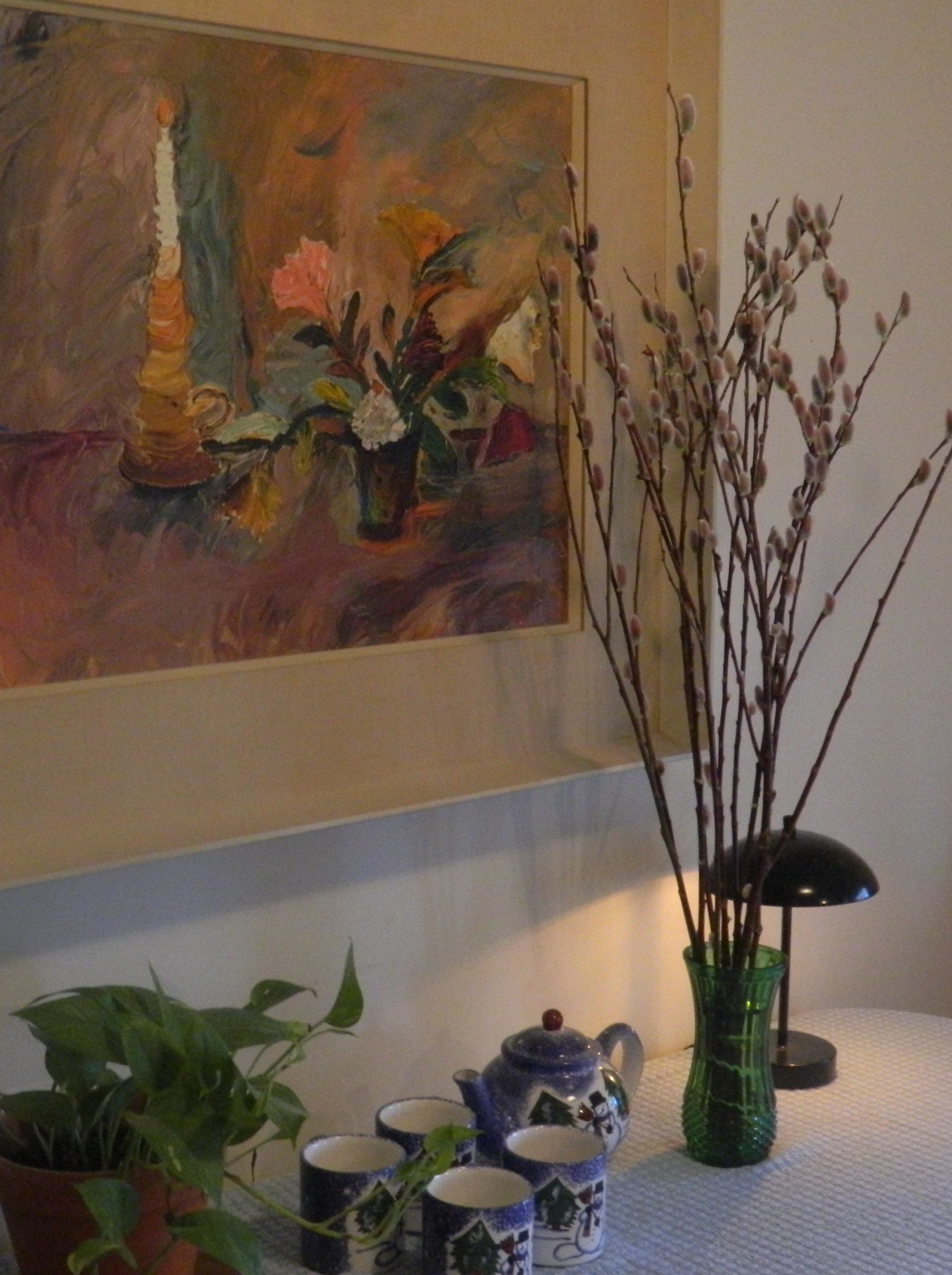 Delightful, yet mysterious looking Catkin branches – long, dark and adorned by fluffy, oval-shaped buds in shades of ivory or pale pinkish, are one of the great joys of this juncture of seasonal change. Among nature’s most beautiful works of art, in my home I have set a vase of pussy willows in front of another enigmatic piece of art, an original palette knife painting done by my brother, FWB II.