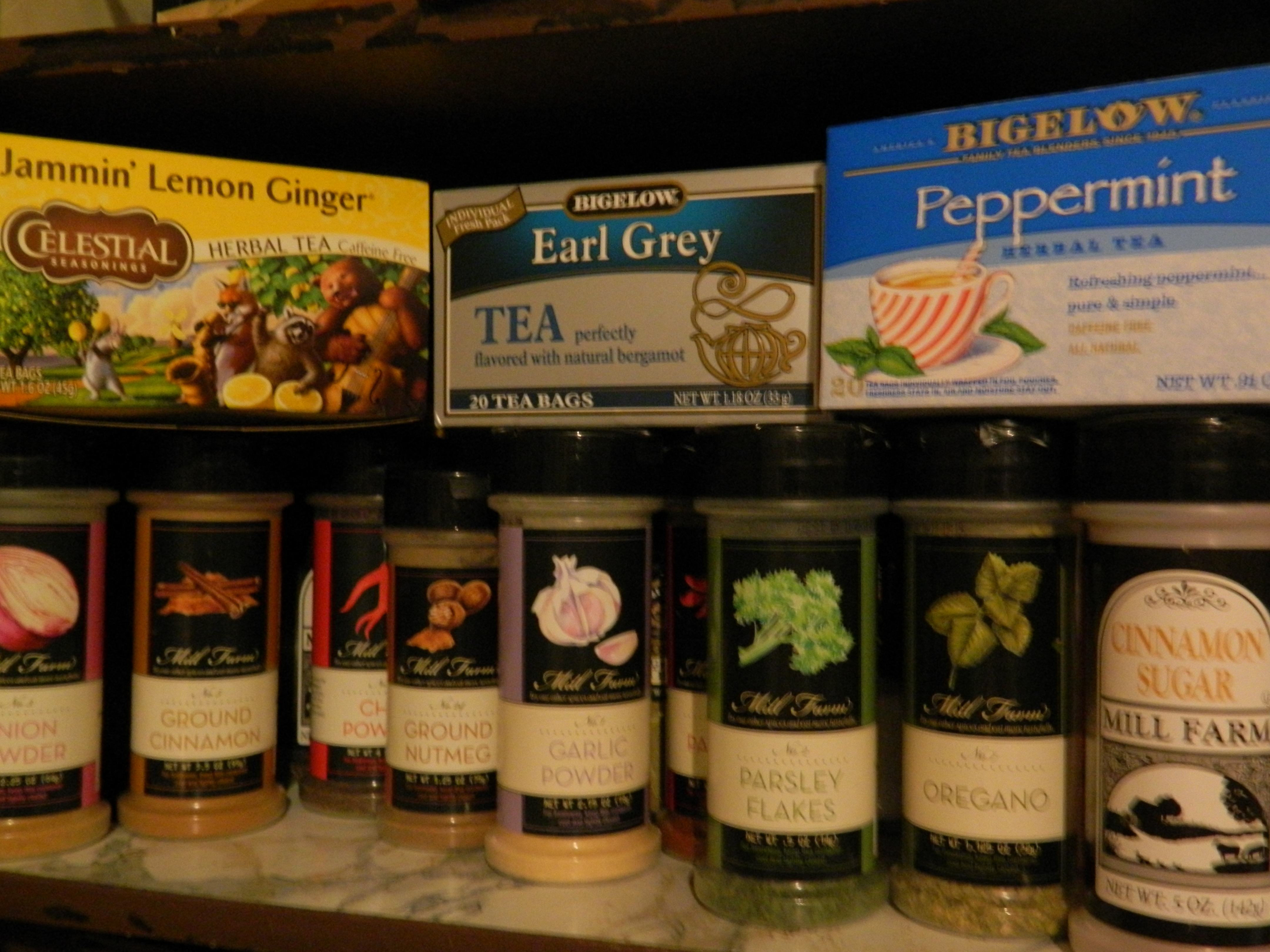 Despite the fact that I adore my tea & spices cabinet, if you come to my place – pretty much expect everything to be seasoned with pepper, Light Promise and if I really get ambitious, olive oil. Probably my best dishes – in the past- have been lasagna which I used to make for my college friends, and baked chicken with melted Muenster cheese on top -or not- your choice. And, I’m told I can make a mean chocolate chip cookie.