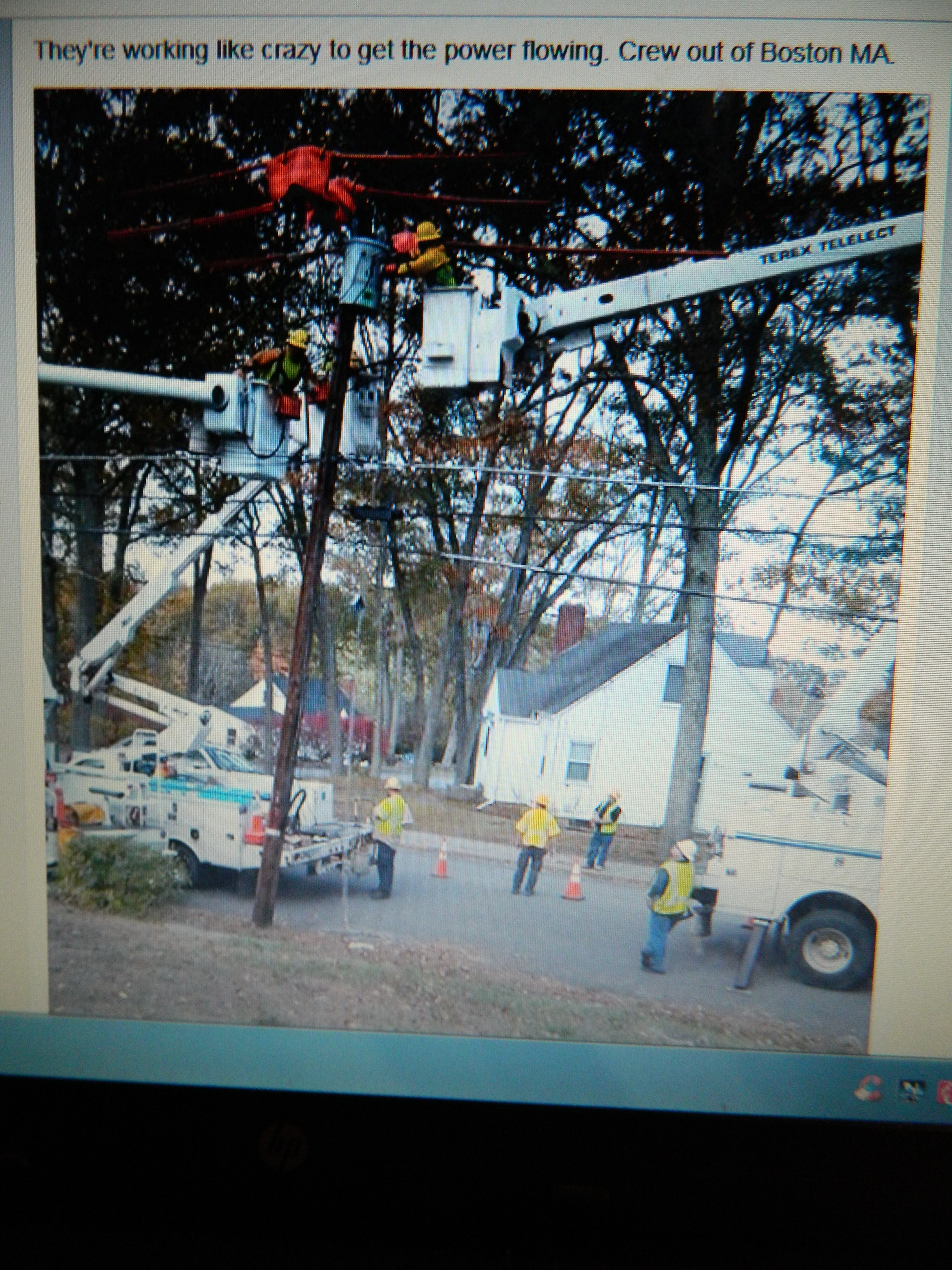 The arrival of this approximate 8-man crew from Boston was a sight for sore eyes I’m told. They are said to have worked diligently and provided cordial and accurate communication for the neighborhood. Since a transformer had to be replaced they left briefly to pick up needed apparatus but returned, as promised, in a timely manner to get the job done.