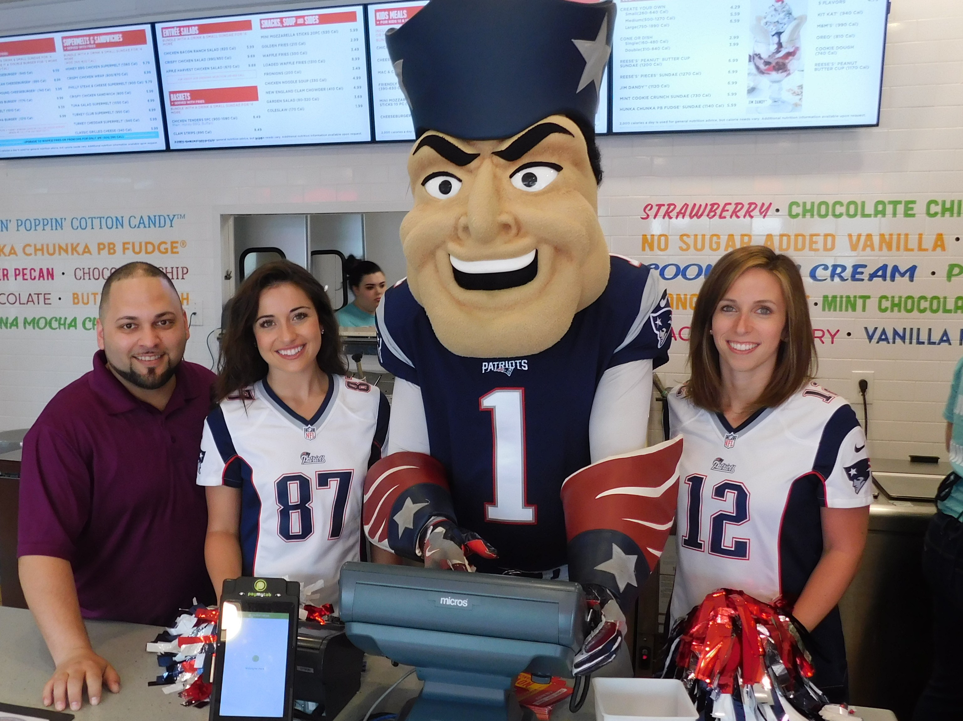New England Patriots cheerleaders and team mascot Pat Patriot were on hand Monday, June 18, to welcome customers to the newly converted Express Service Friendly’s on 240 Buckland Street in Manchester, Connecticut.