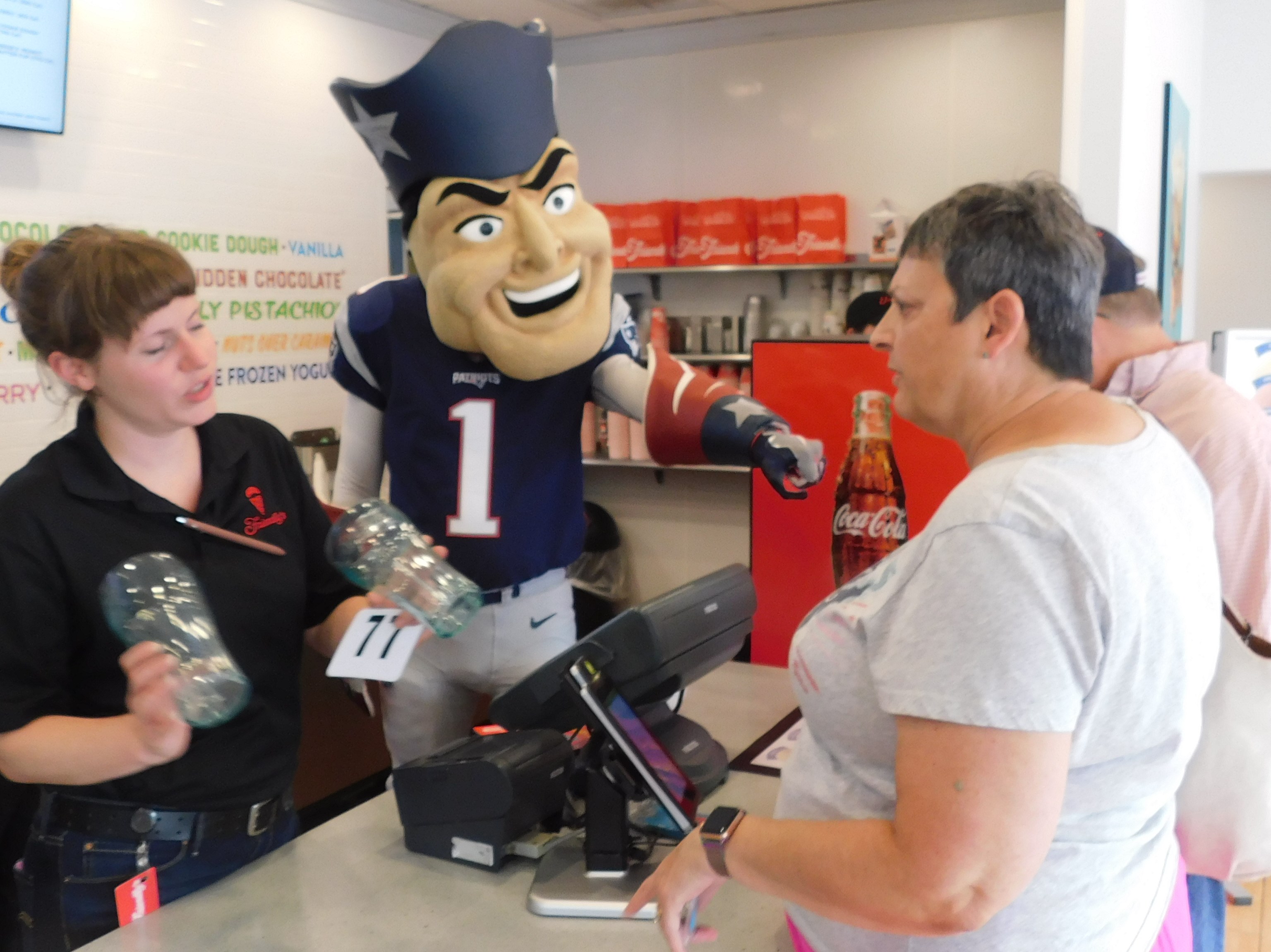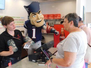 Our New England Patriots Hall-of-Fame bound quarterback, Tom Brady, known for his ‘indulgence’ – so to speak – in avocado ice cream, was not present. However, team mascot Pat Patriot, whom is said to know “Tom Terrific”, and two Patriots cheerleaders turned out to promote the change to Express Service. Asked for Patriots Nation predictions for the coming NFL season, one cheerleader said,”Greatness.”