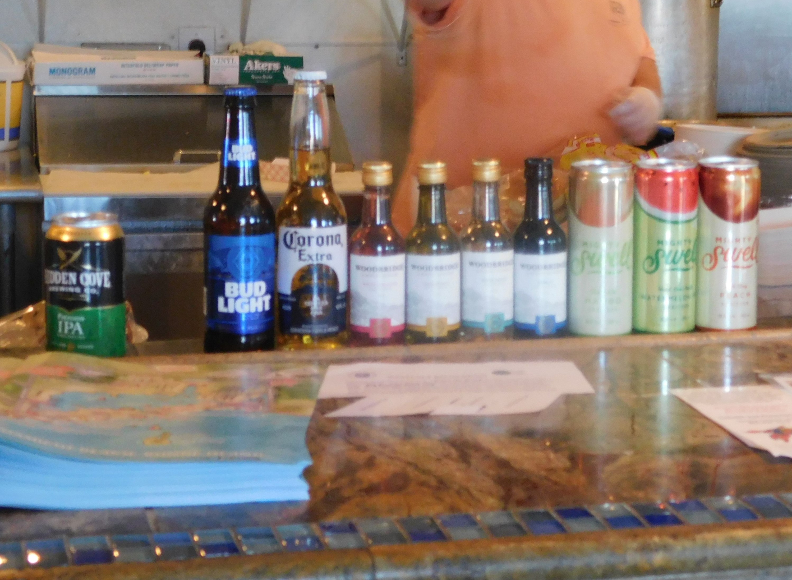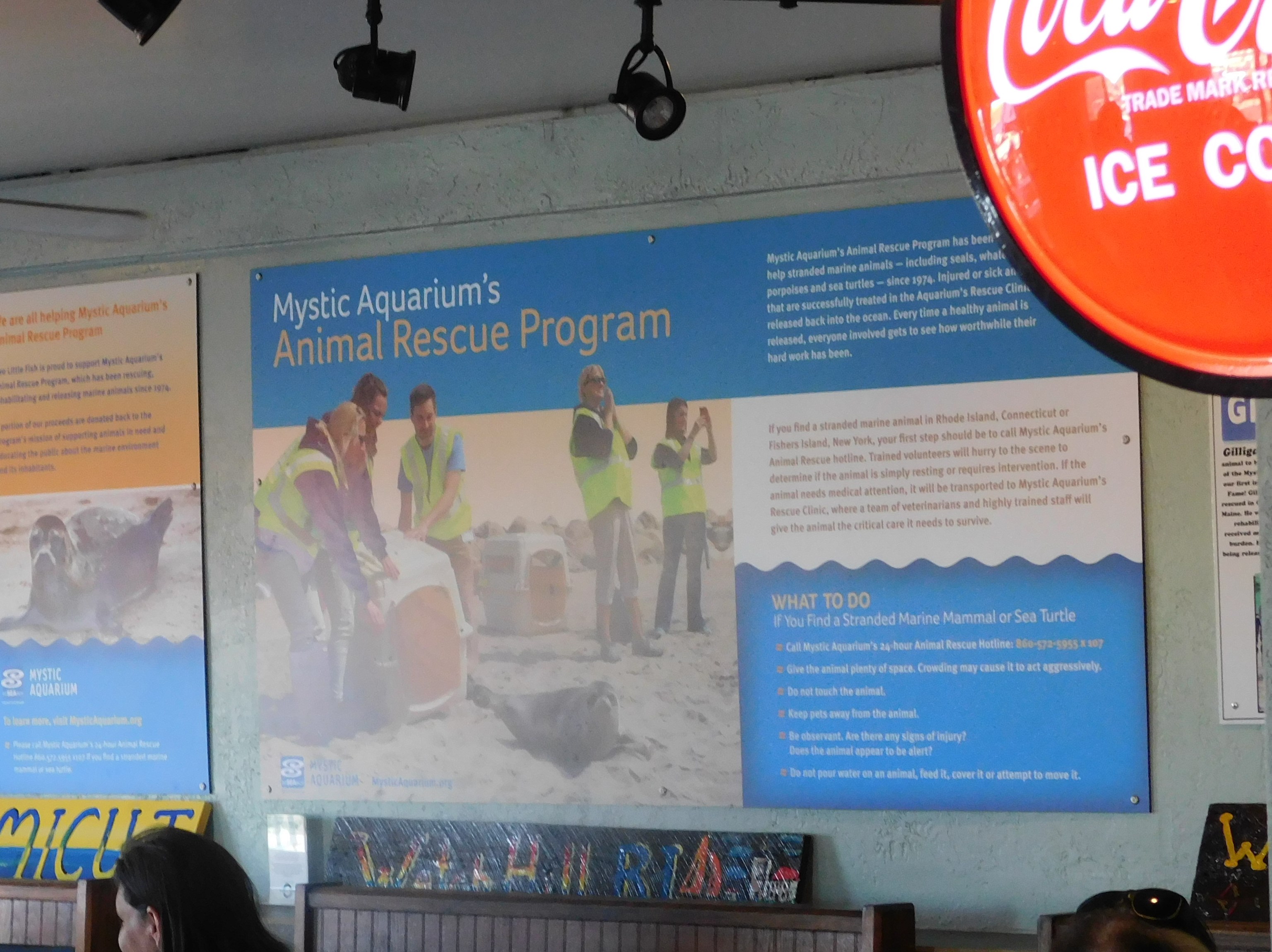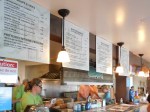 Overhead fans help diffuse the summer heat at the environmentally conscious Two Little Fish which is plastic free and has a supportive relationship with Mystic Aquarium. Straws, bags, plates, bowls and soft drinks cups are made from “biodegradable recycled paper” to help reduce their carbon footprint. A portion of the sale of every meal is said to be donated to the Animal Rescue Team of the Mystic Aquarium, which rescues, provides medical care and releases injured and stranded animals, ie. turtles, seals, manatees. According to their menu, Two Little Fish donates its used cooking oil to be converted into bio-diesel – “a non-toxic, locally produced fuel, to power vehicles and heat the homes of those in need”. The chartiable effort not only helps the less fortunate, but is also predicted to prevent more than 30 million pounds of CO2 emissions this year alone.